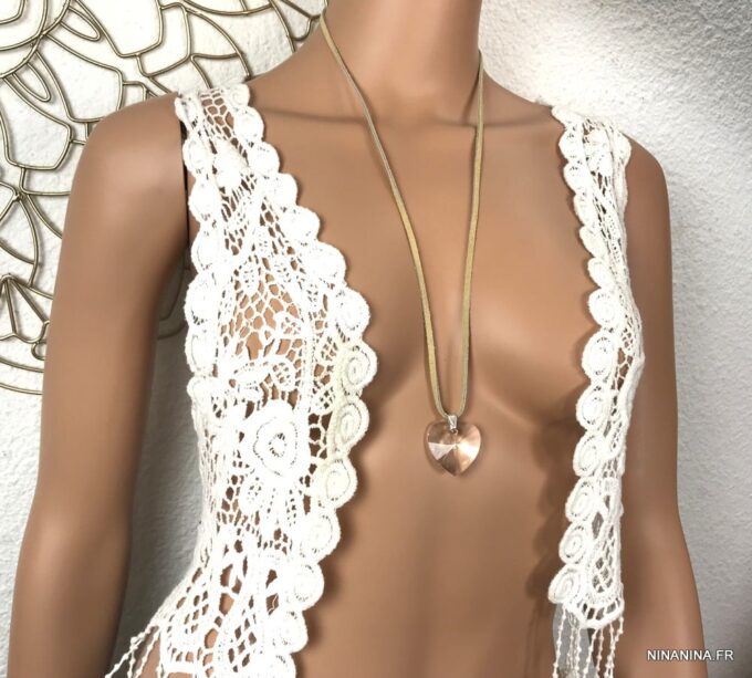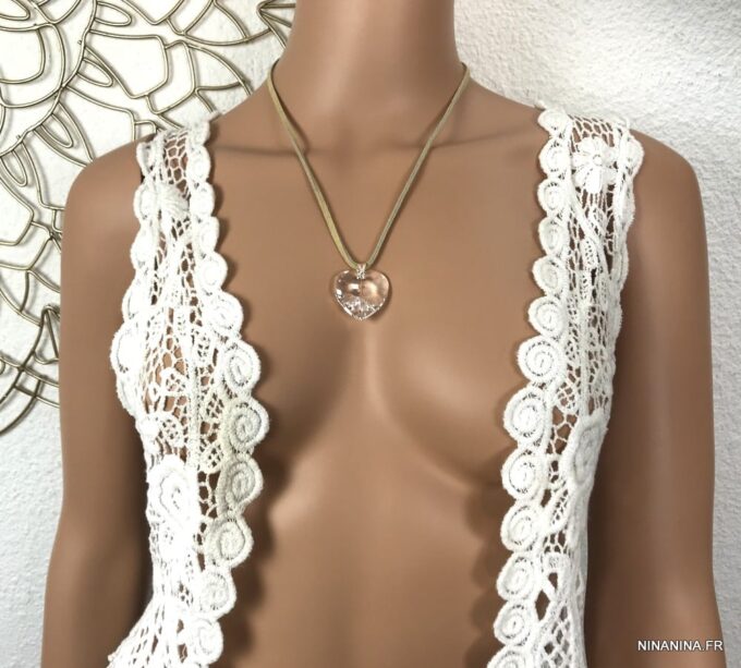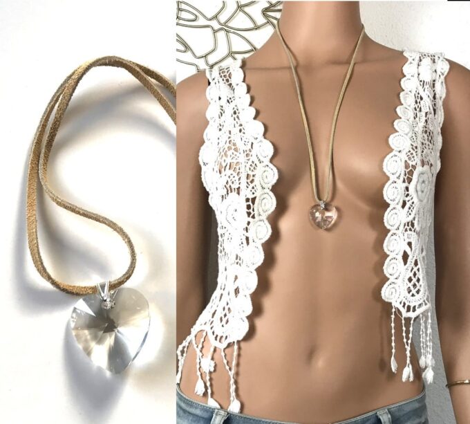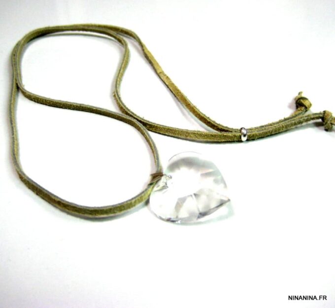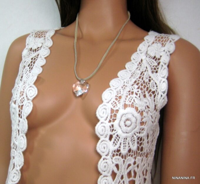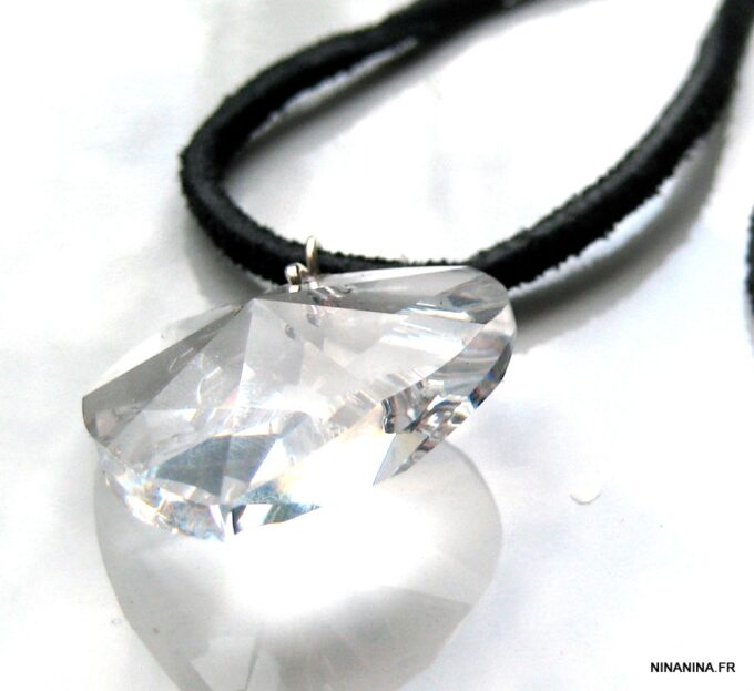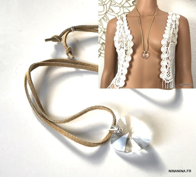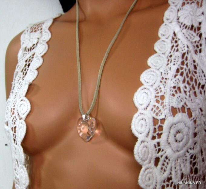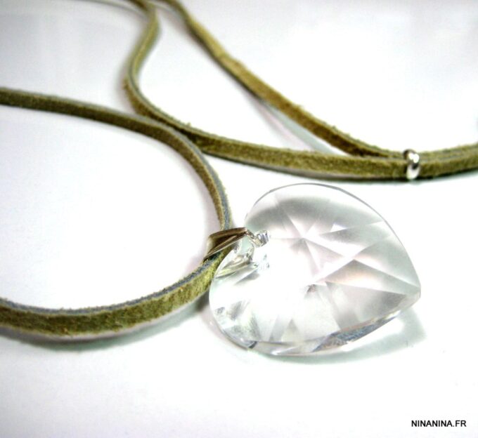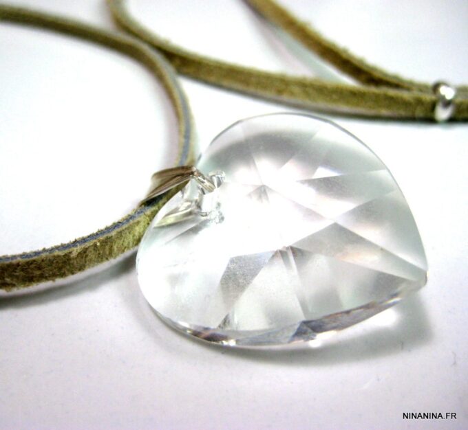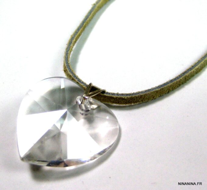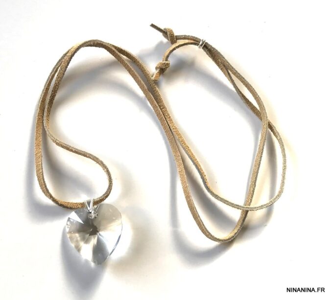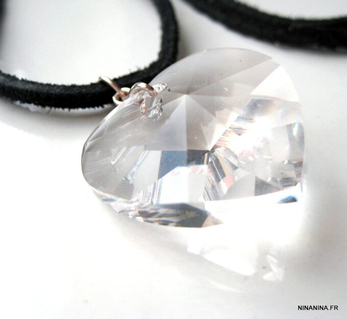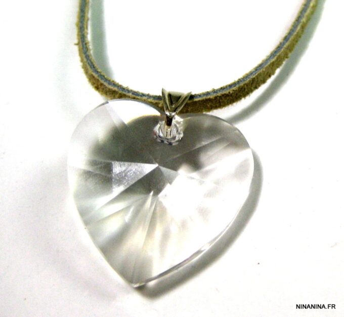 Faites briller de mille feux votre décolleté avec ce Collier cordon Swarovski pendentif gros Coeur cristal ! Splendide, délicat et raffiné, il composé d’un énorme pendentif coeur en cristal swarovski blanc monté sur un lien en daim naturel (3mm de large). Une rondelle en argent 925 qui coulisse sur le lacet en guise de système de fermeture termine magnifiquement ce bijou swarovski. Un ras de cou ou sautoir très original qui délivre toute sa finesse, et vous fera tout simplement craquer !