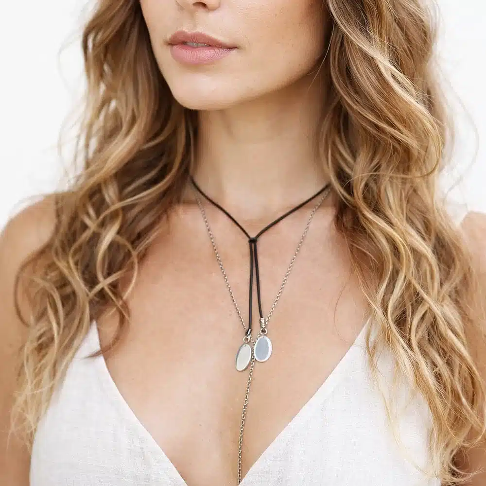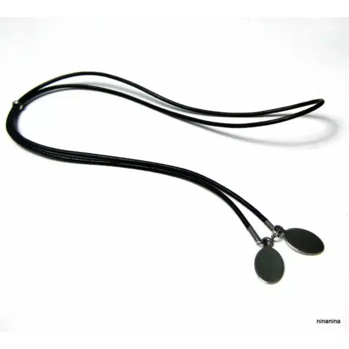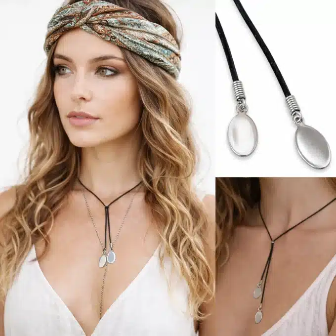 Ce collier en cuir pour femme séduit par son esprit bohème chic et son design à la fois naturel et contemporain. Composé d’un cordon en cuir souple et confortable, il est sublimé par de pendentifs ovales en acier inoxydable argenté, qui apportent lumière, élégance et modernité à l’ensemble.
