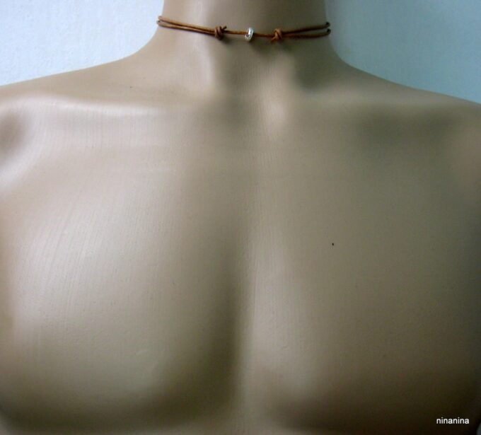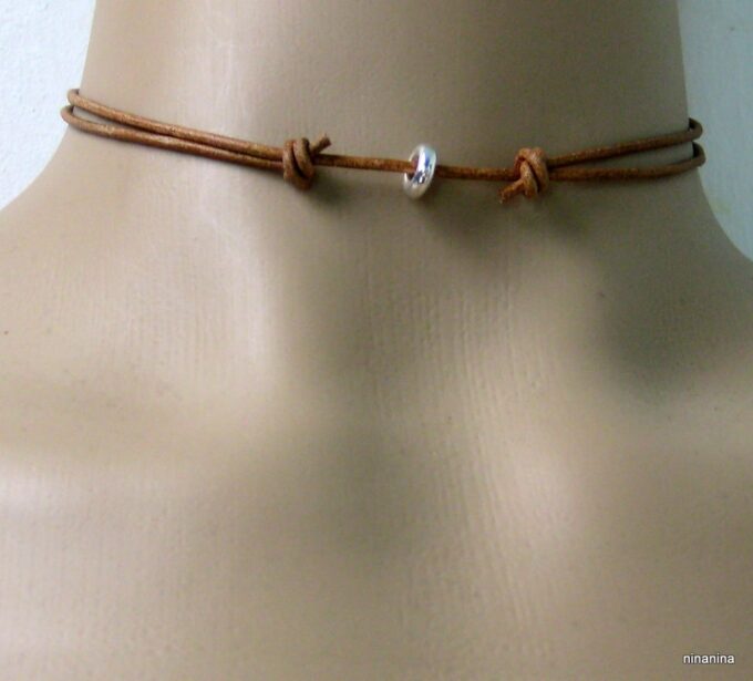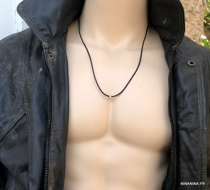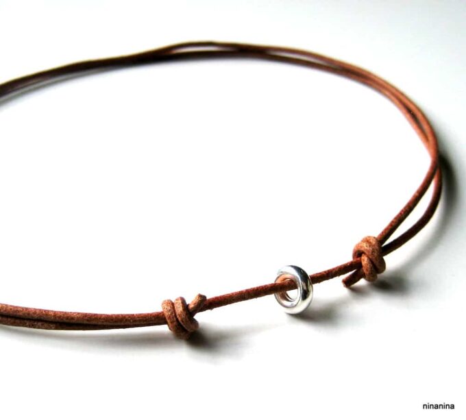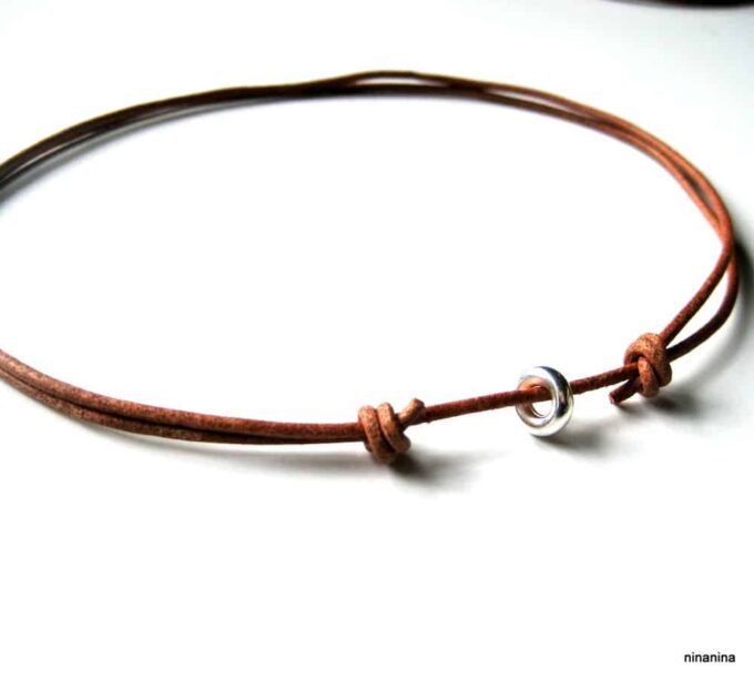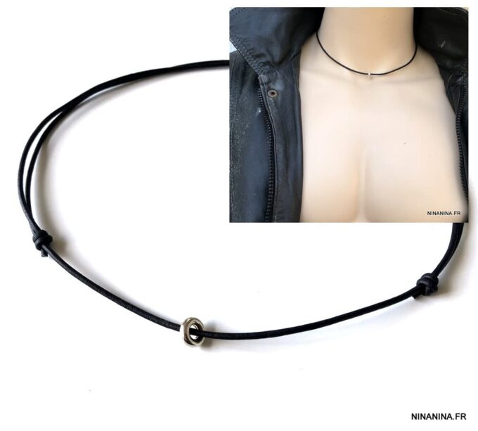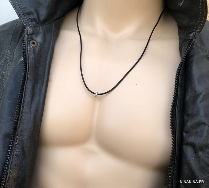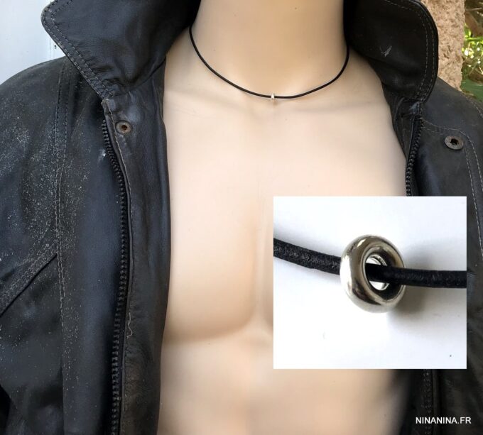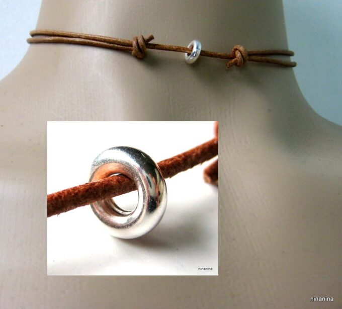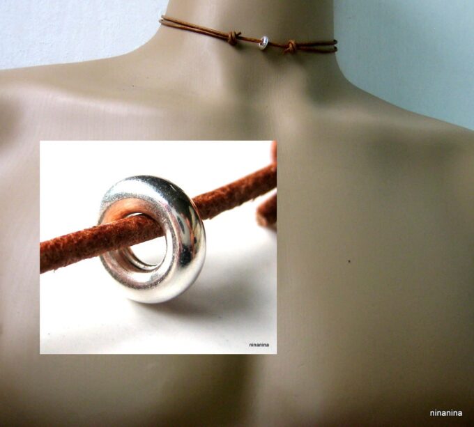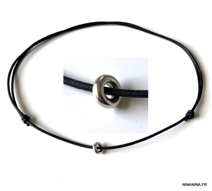 Collier Donut Argent 925 Cordon Cuir réglable composé d’un donut en argent 925 monté sur un cordon de cuir naturel (2mm de diamètre).