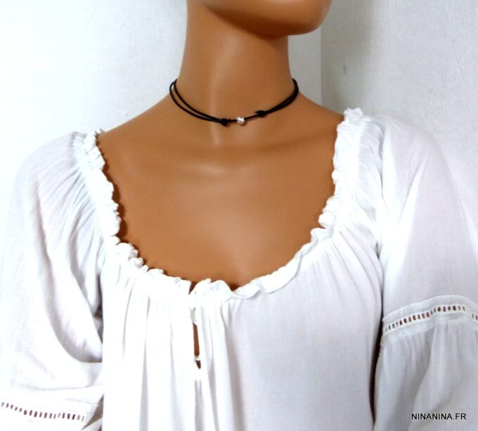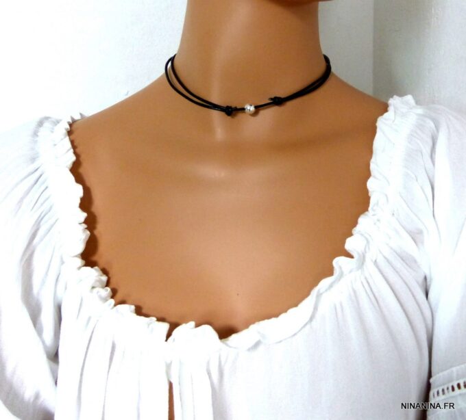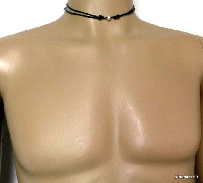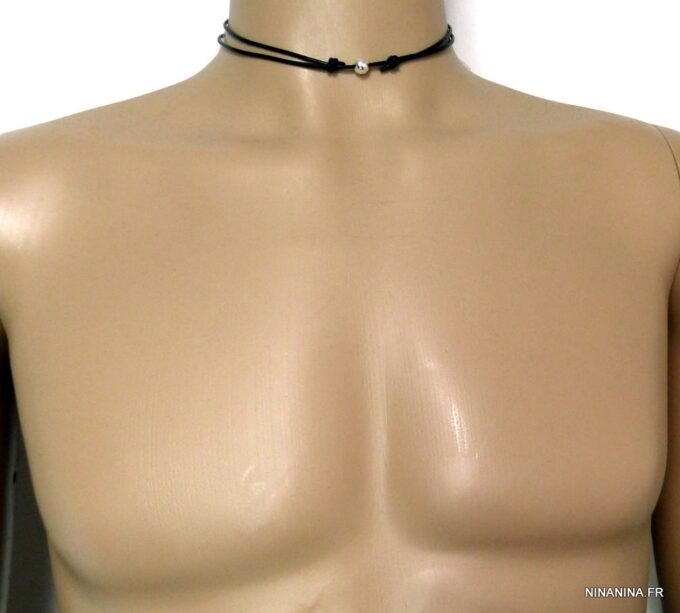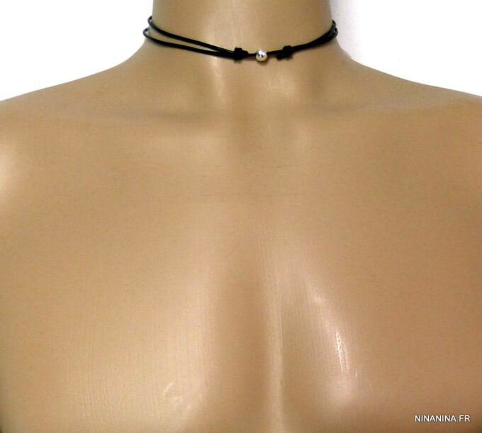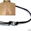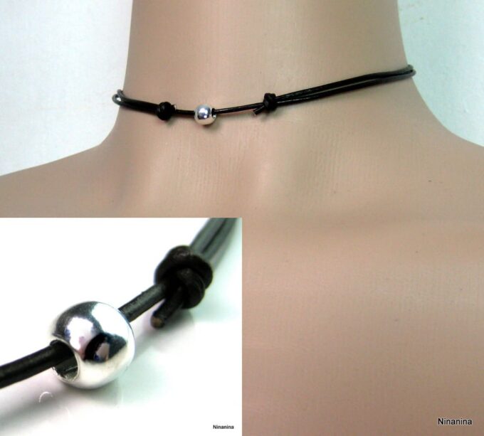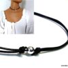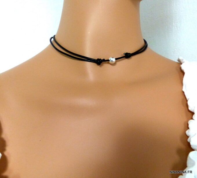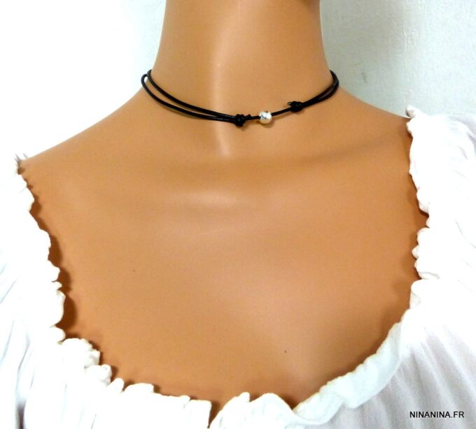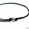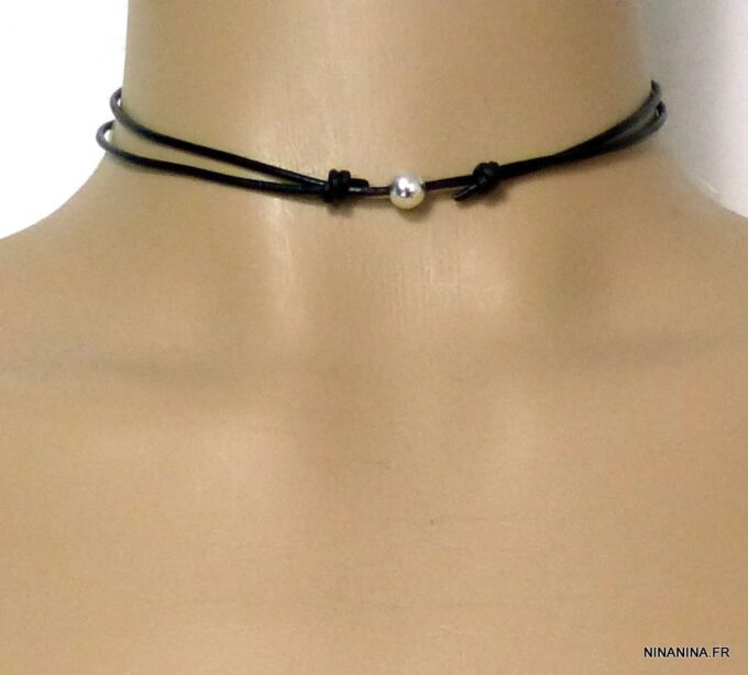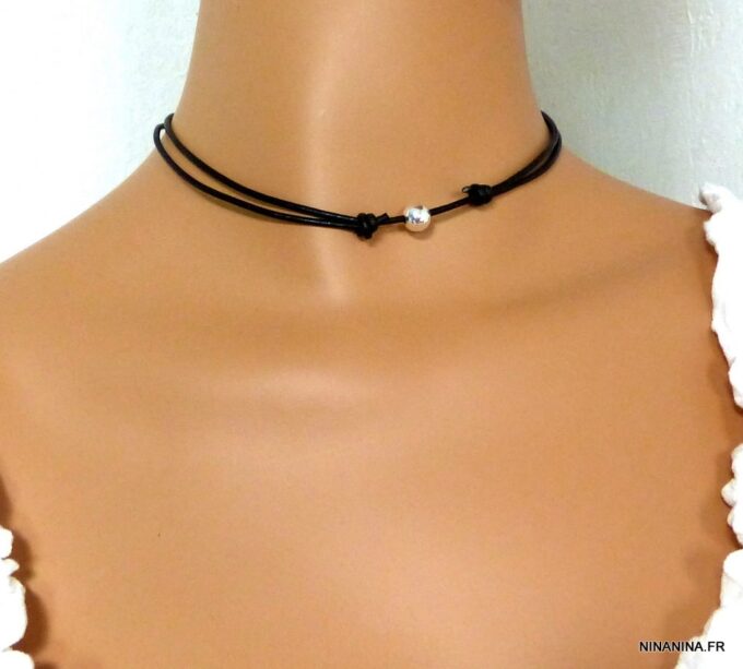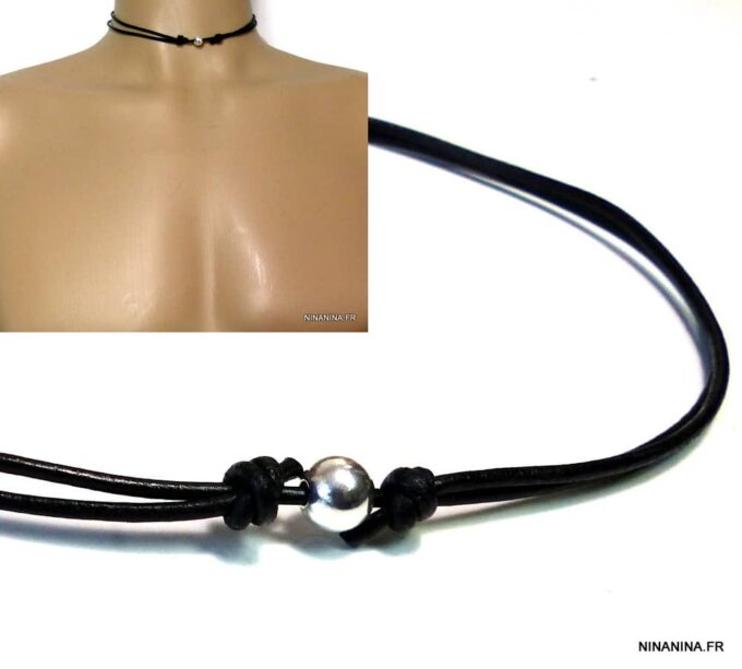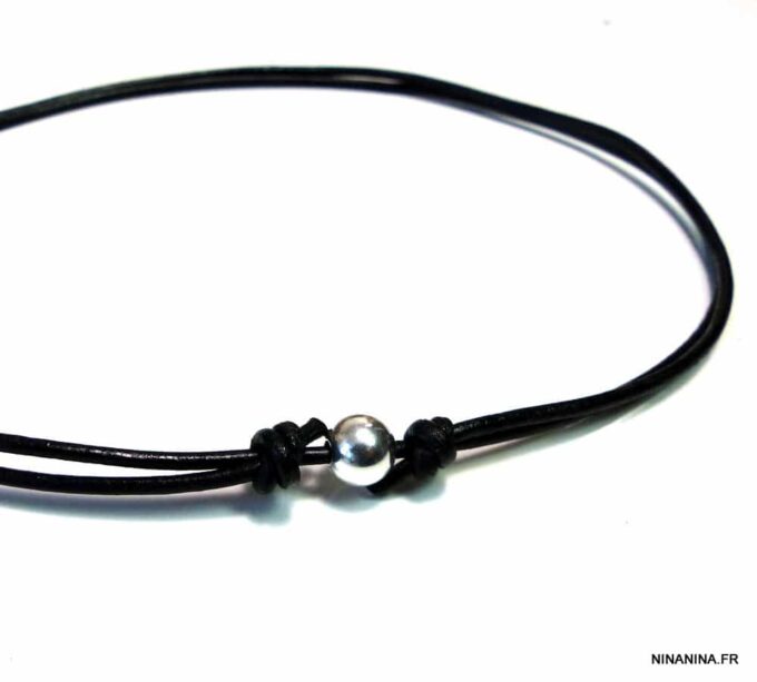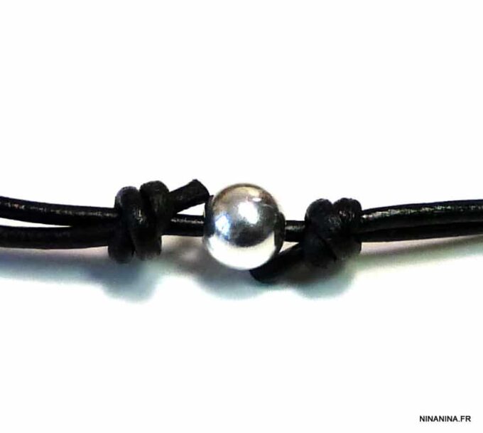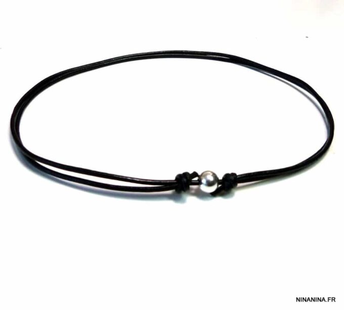 Collier femme cordon cuir Boule Argent 925 massif composé d’une perle ronde en argent 925 montée sur un double cordon de cuir véritable noir (2 mm de diamètre).