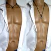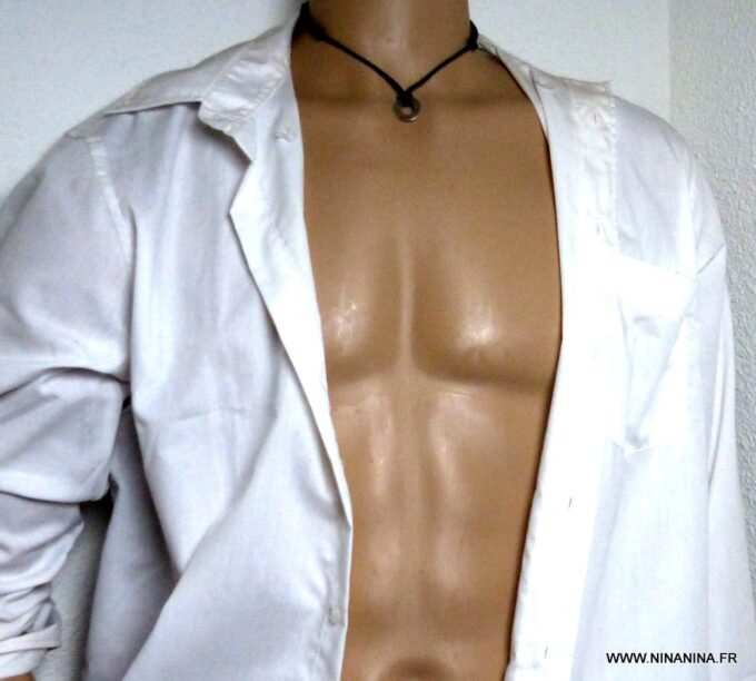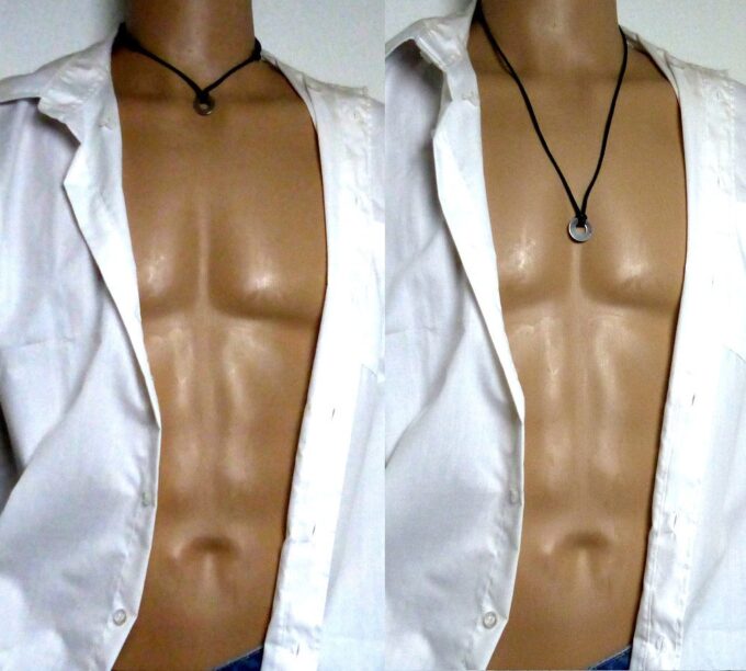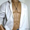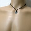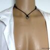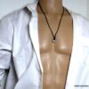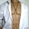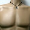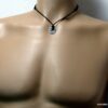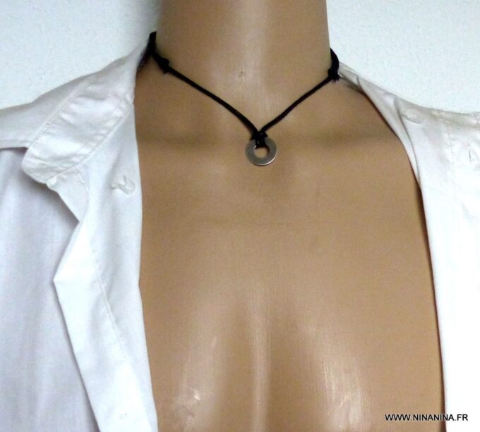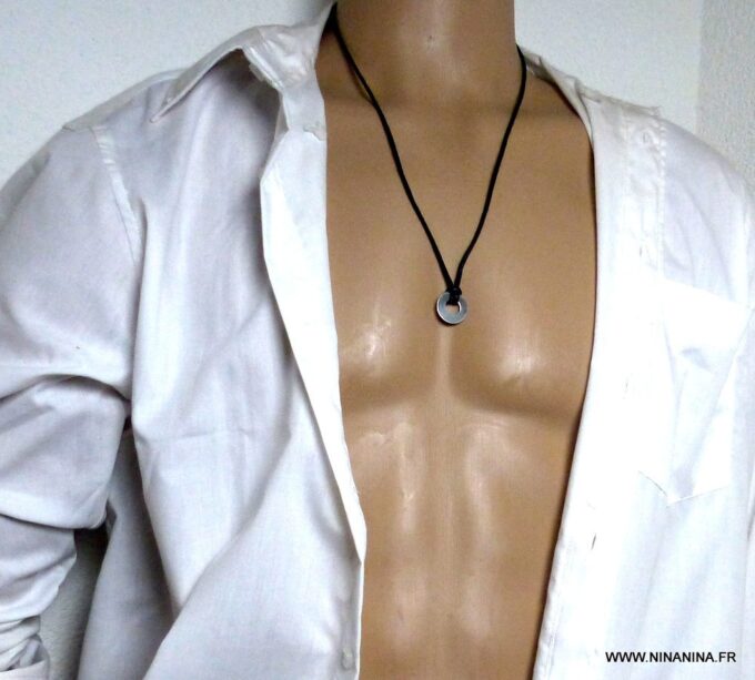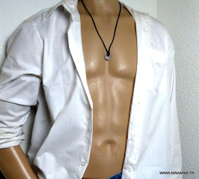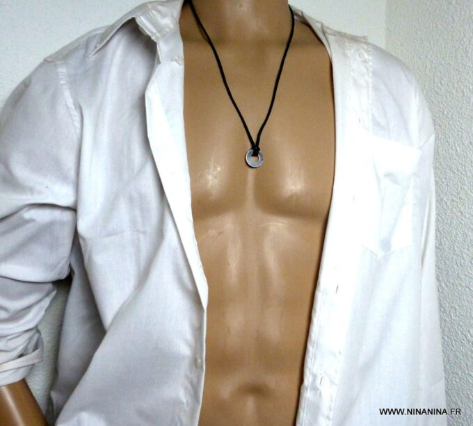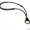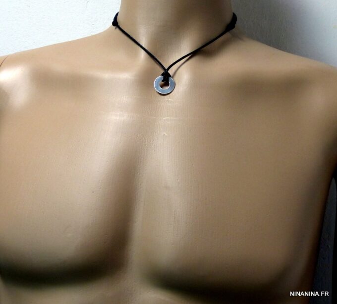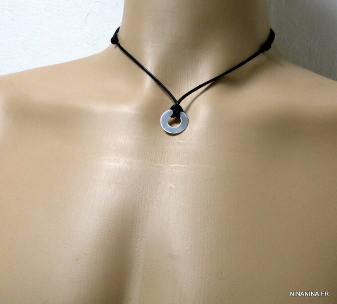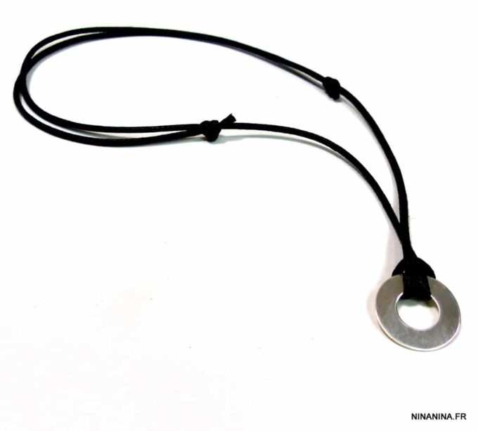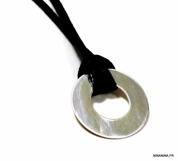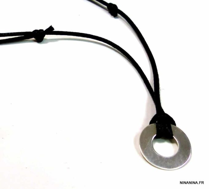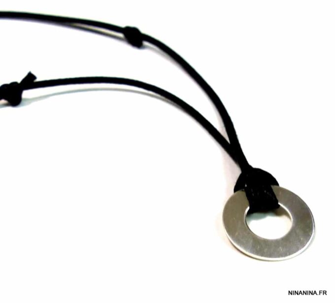 Collier homme cordon cible argent massif composé d’un disque rond en argent 925 monté sur un cordon de coton ciré noir (2 mm de diamètre).