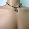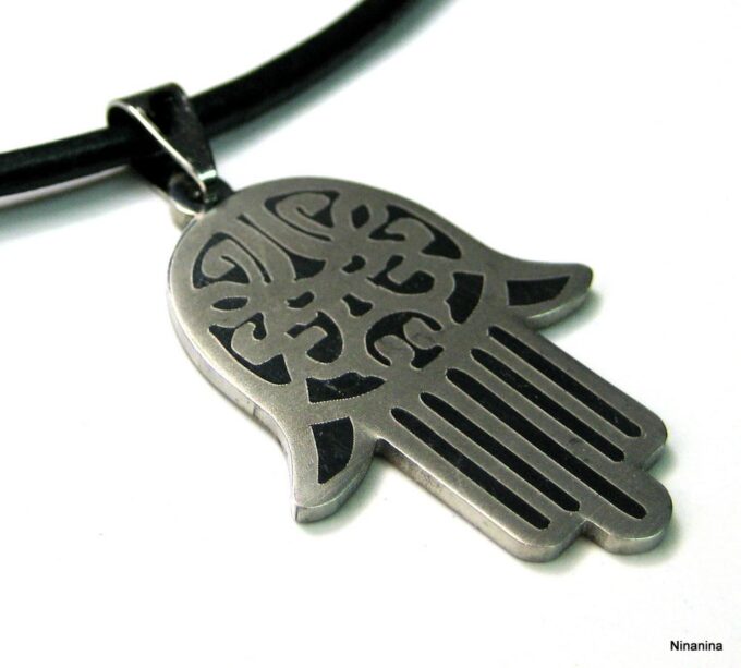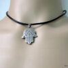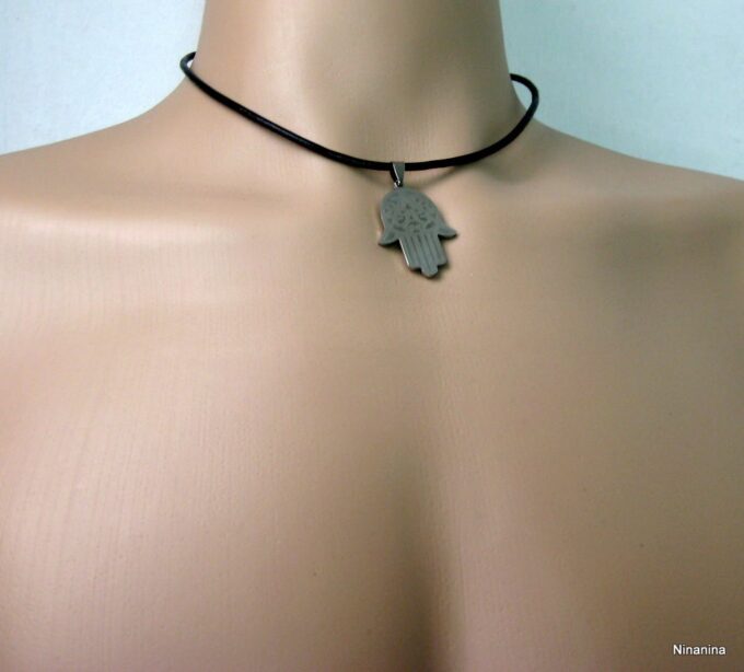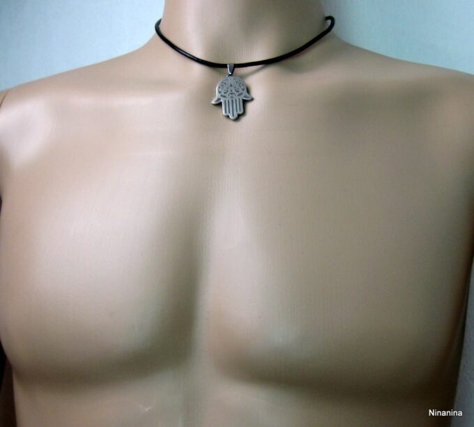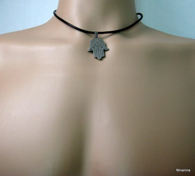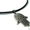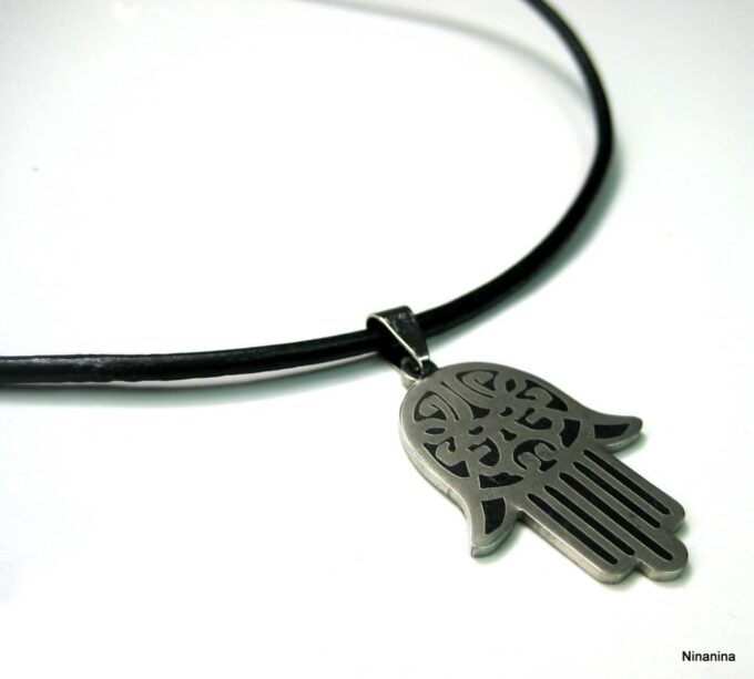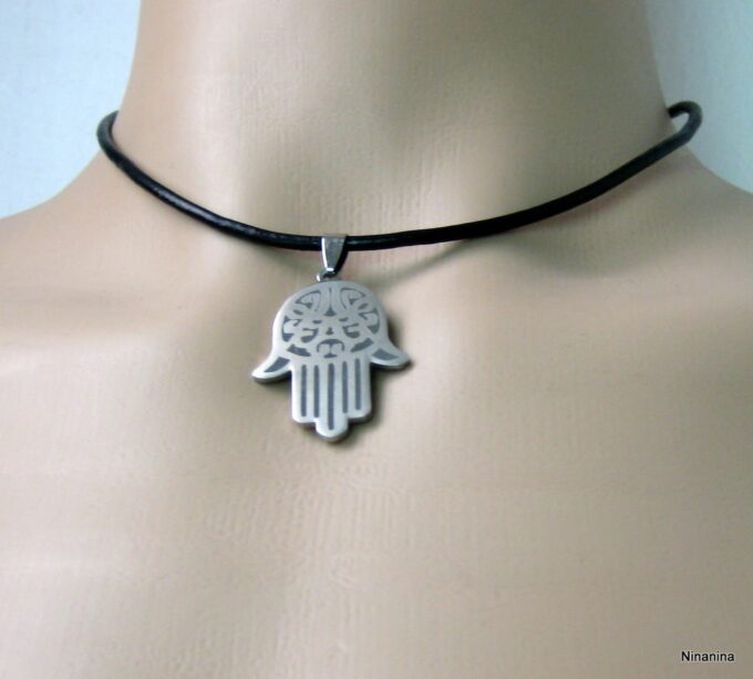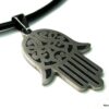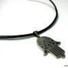 Collier homme cordon cuir acier inoxydable argenté composé d’une main de fatma en acier inoxydable montée sur un lien de cuir noir (3mm de diamètre).