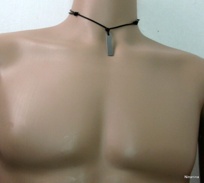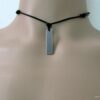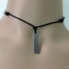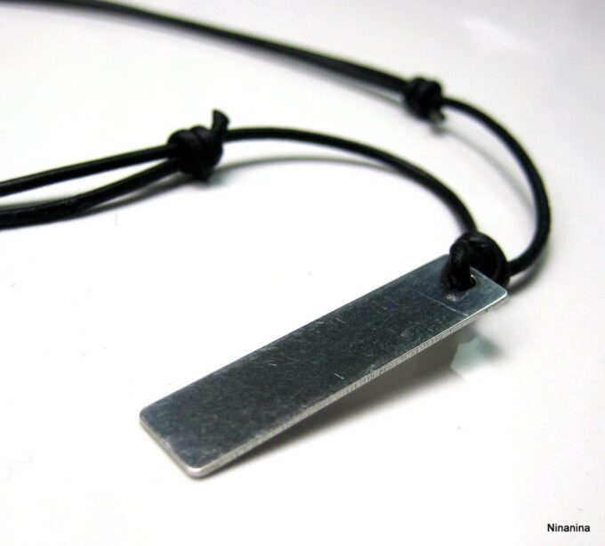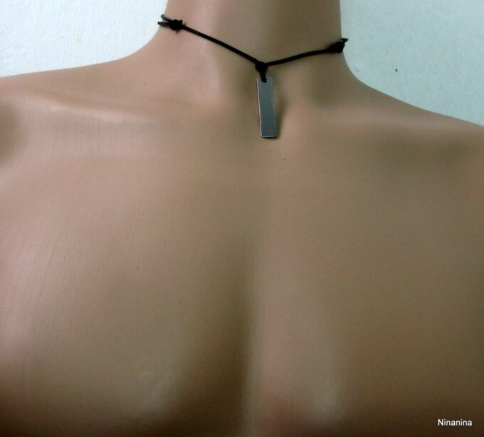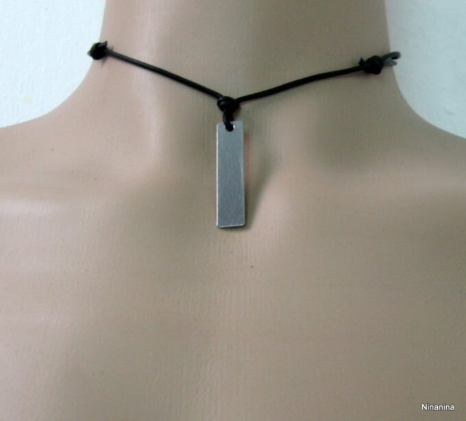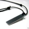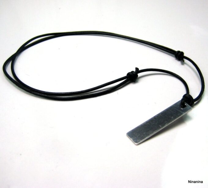 Collier homme cordon cuir pendentif rectangle Acier argenté composé d’un pendentif rectangulaire en acier inoxydable monté sur un cordon de cuir noir (2 mm de diamètre).
