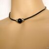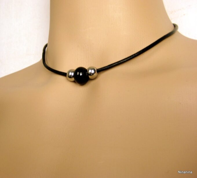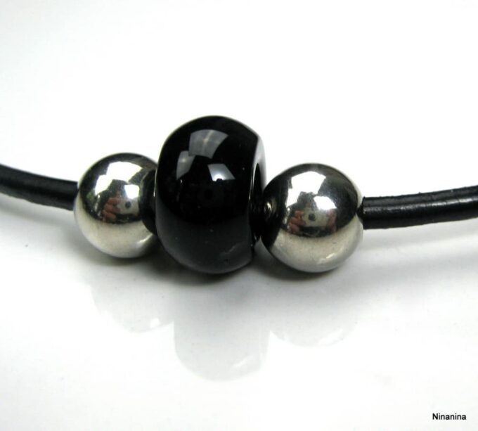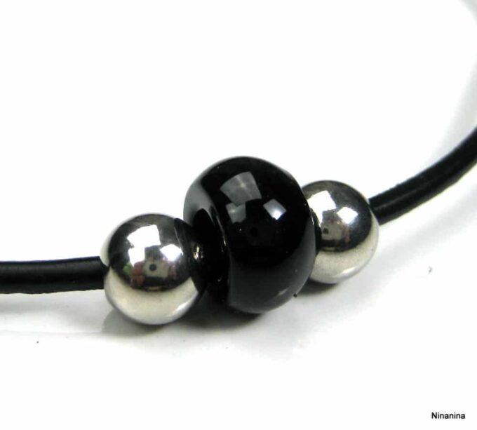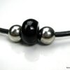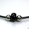 Collier homme cordon cuir agate noire composé d’une rondelle en agate noire et de deux perles rondes en acier inoxydable montées sur un lien de cuir noir (3mm de diamètre).