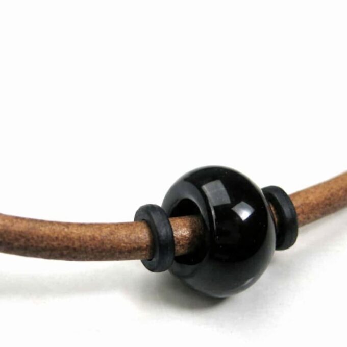 Ce collier masculin en cuir sobre, raffiné et élégant qui enlace le cou de sa lanière de cuir est composé d’une rondelle en Agate noir coulissant sur un lien en cuir naturel de 4 mm de diamètre monté sur un élégant fermoir mousqueton en Acier inoxydable argenté, sûr et facile d’utilisation.
