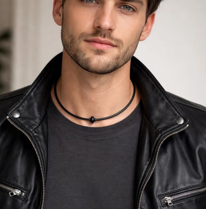 Vous pouvez également le porter seul pour un rendu minimaliste ou le combiner avec d’autres colliers en cuir ou en acier pour un style plus affirmé. Sa forme plate et sa couleur noire permettent des associations faciles sans surcharger la tenue.