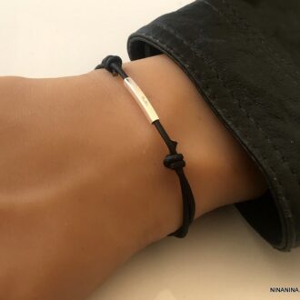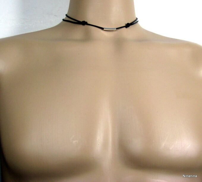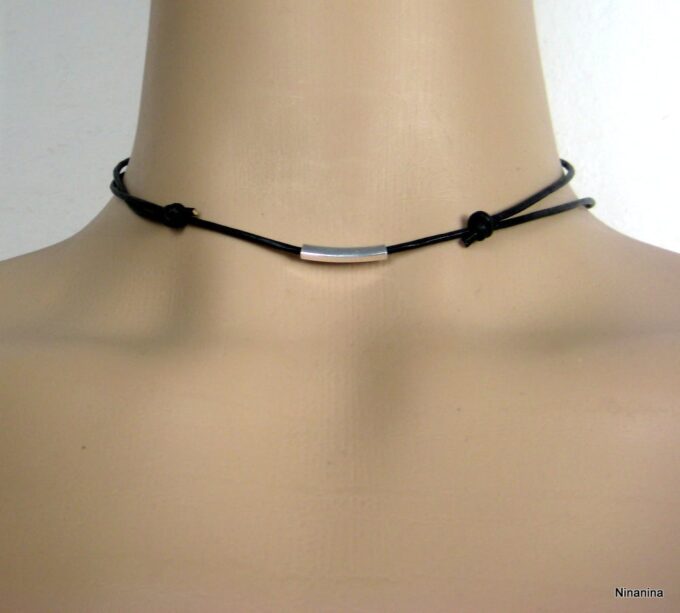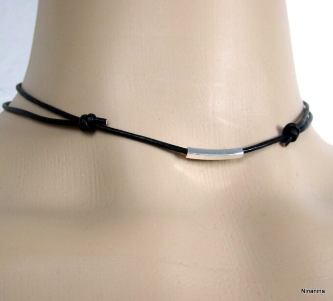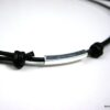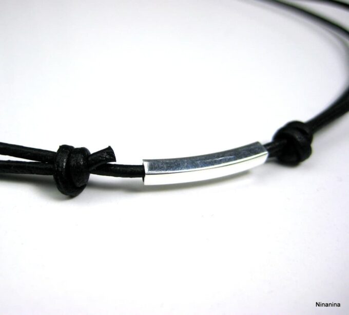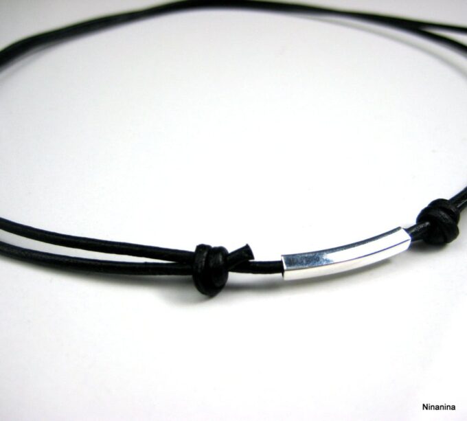 Collier cordon Cuir ajustable tube Argent 925 massif composé d’un tube rectangulaire en argent 925 monté sur un cordon de cuir.