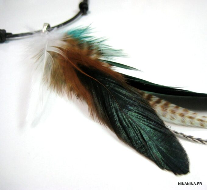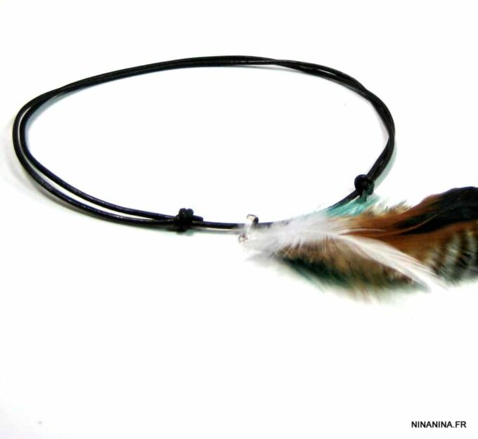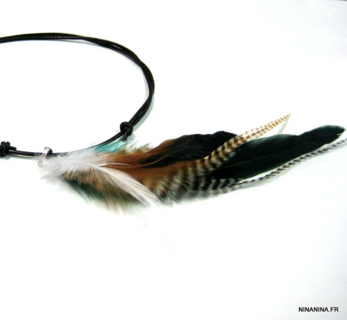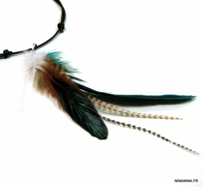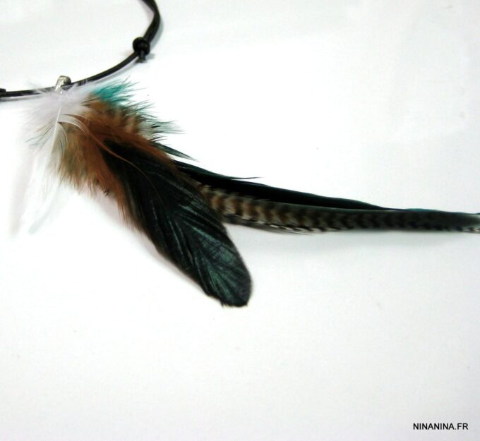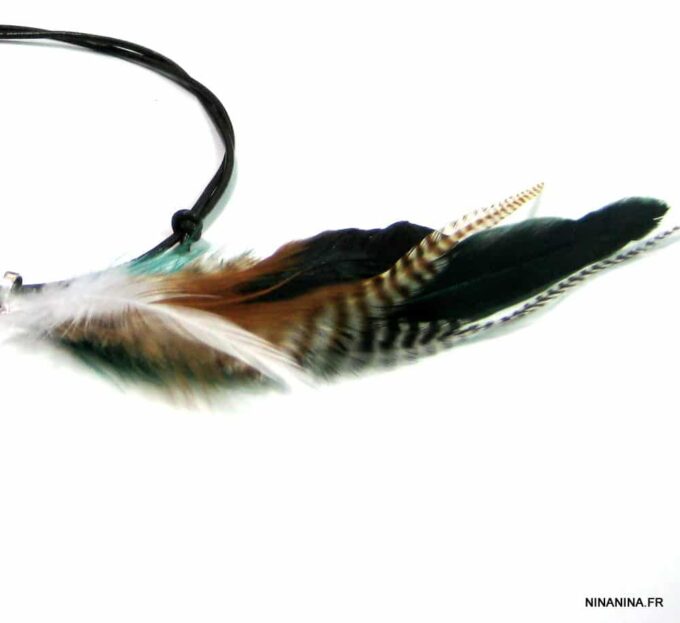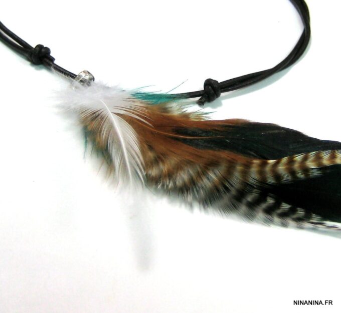 Collier plume naturelle cordon cuir Argent 925 massif composées de longues plumes blanches et noires, turquoise et marron clair montées sur cordon de cuir marron chocolat (2mm de diamètre). Longueur ajustable par noeud coulissant : de 38 à 75 cm environ. Livrées dans sa pochette d’organza.