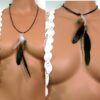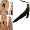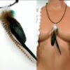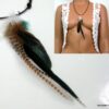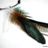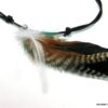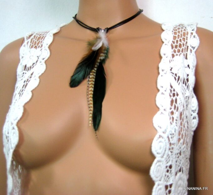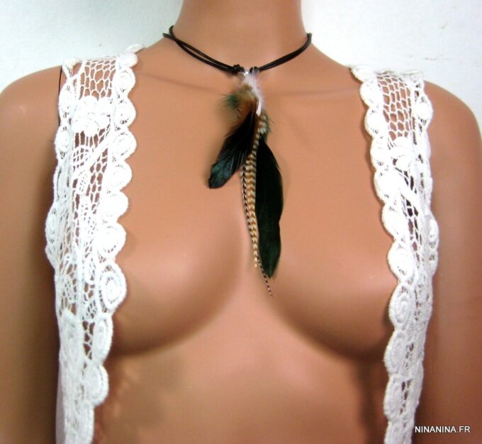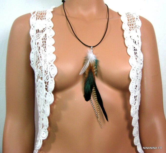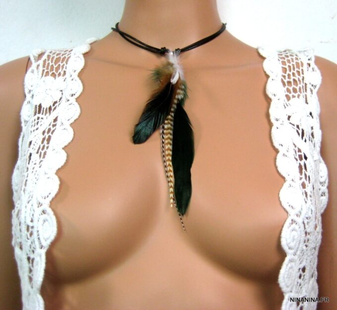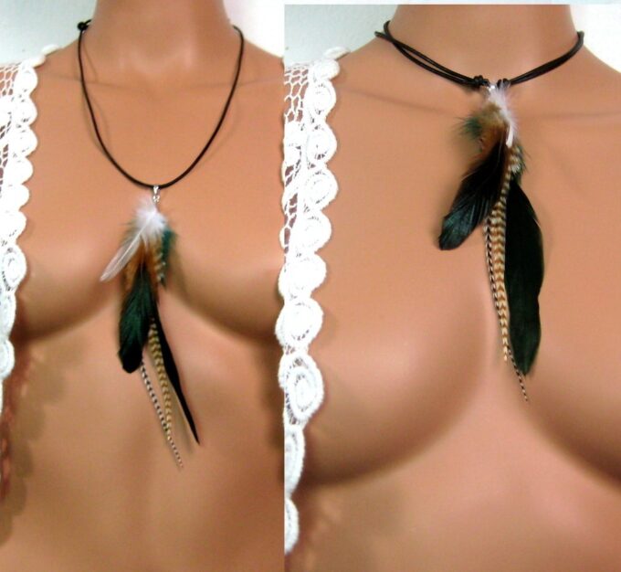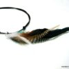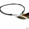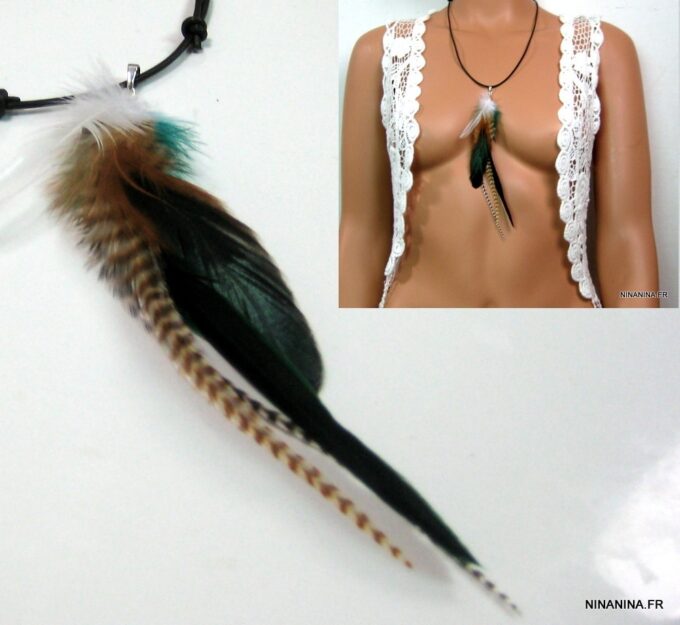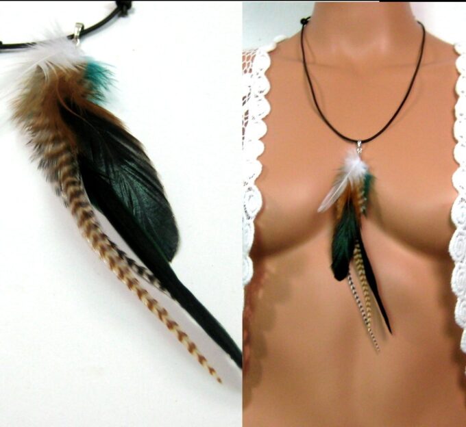 Collier plume naturelle cordon cuir Argent 925 massif composées de longues plumes blanches et noires, turquoise et marron clair montées sur cordon de cuir marron chocolat (2mm de diamètre). Longueur ajustable par noeud coulissant : de 38 à 75 cm environ. Livrées dans sa pochette d’organza.