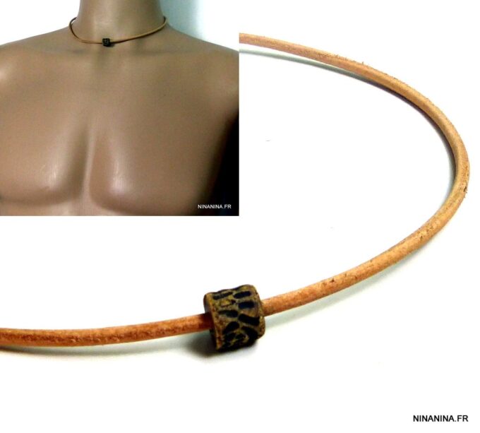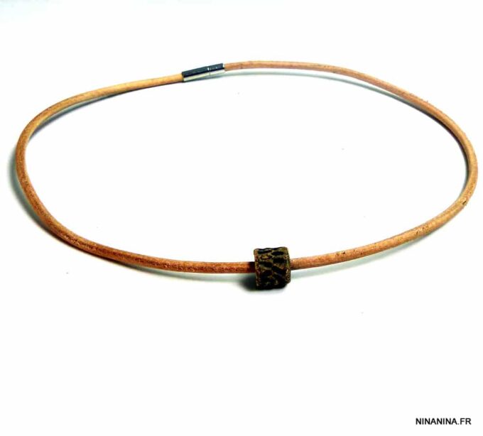 Collier homme cordon cuir perle marron sculptée composé d’une perle cylindrique sculptée en céramique marron montée sur un cordon de cuir naturel (3mm de diamètre).