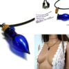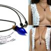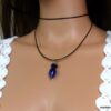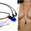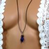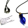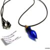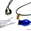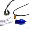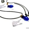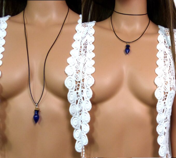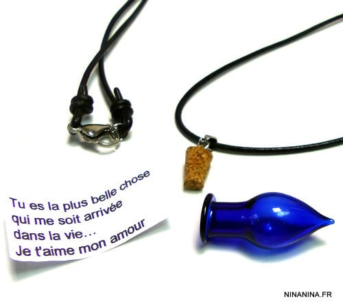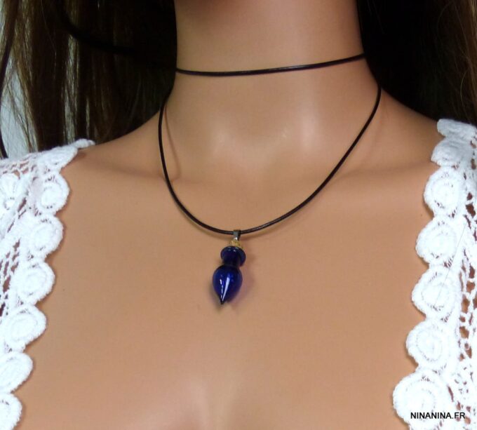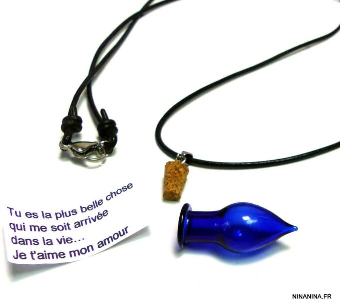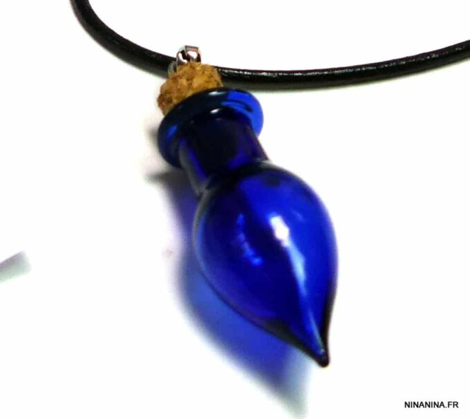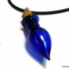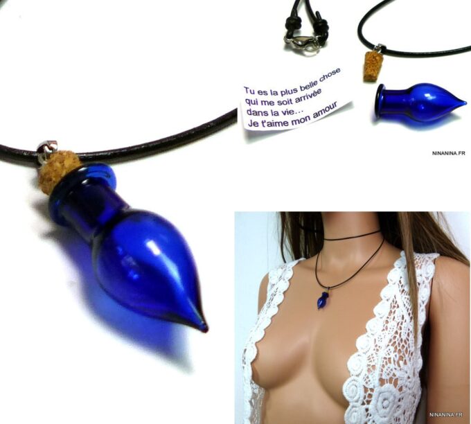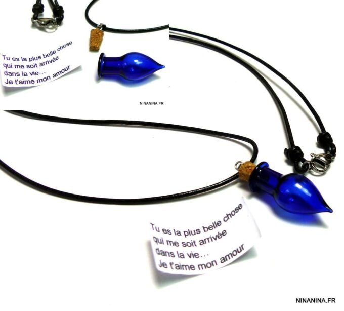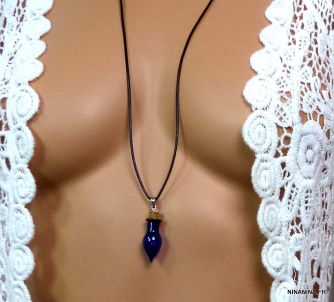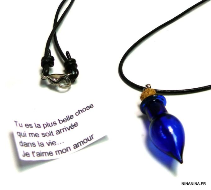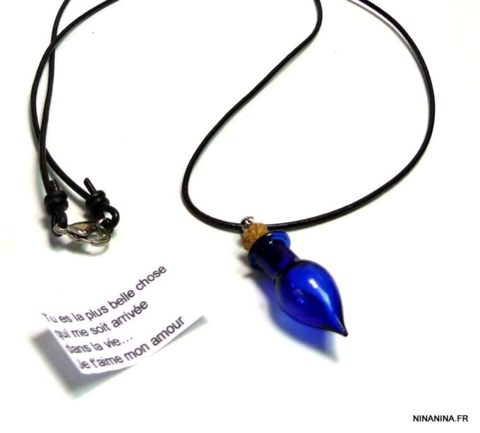 Collier cordon cuir message fiole de verre bleue composé d’une petite fiole en verre bleu destinée à recevoir un petit mot (texte à indiquer en commentaire – 4 lignes maximum), monté sur un cordon de cuir (1,5 mm de diamètre). Dim de la fiole : 3 X 1,2 cm. Bouchon en liège. Longueur réglable: de 45 à 80 cm environ. Fermeture par liens coulissants. Livré dans sa pochette d’organza. Bijou 100% fait-main