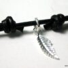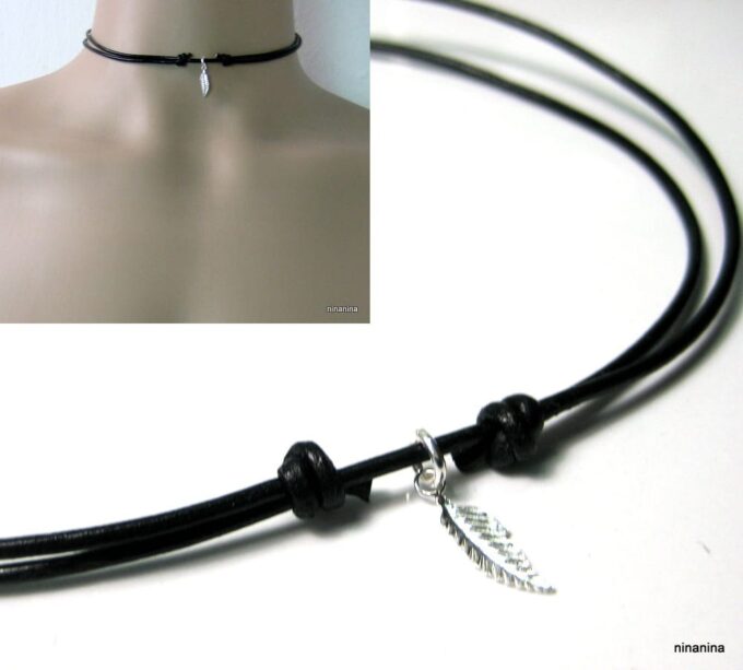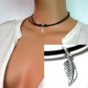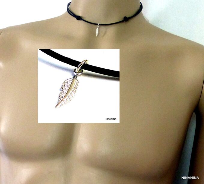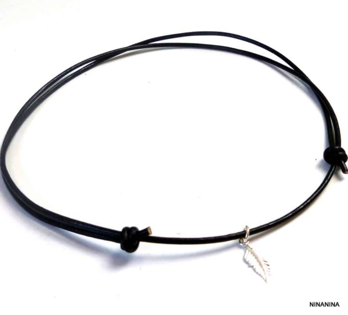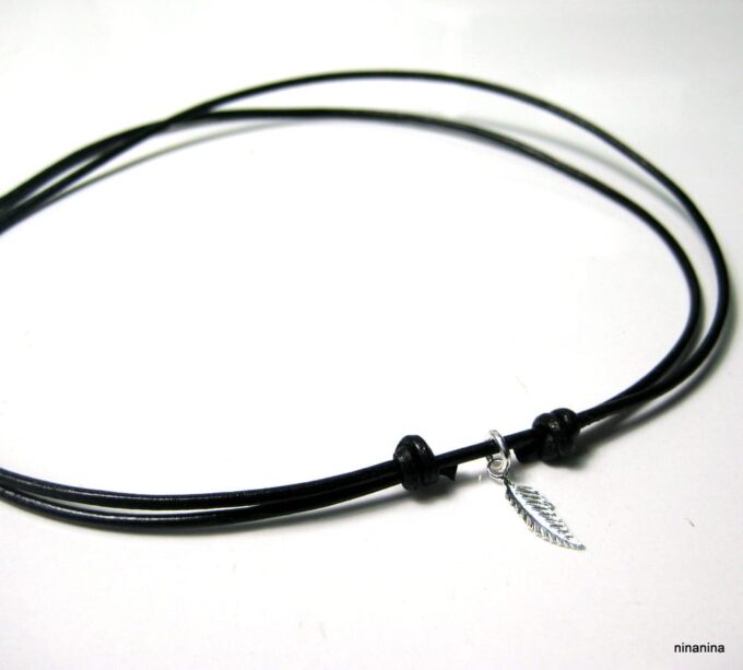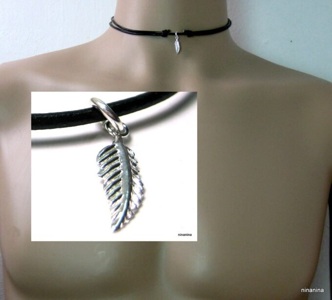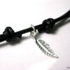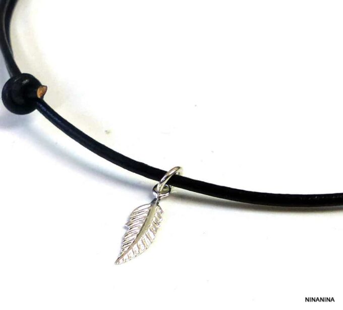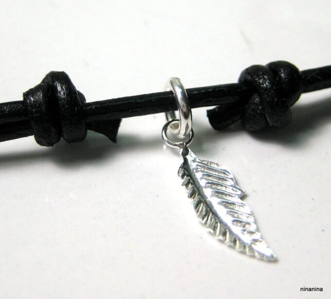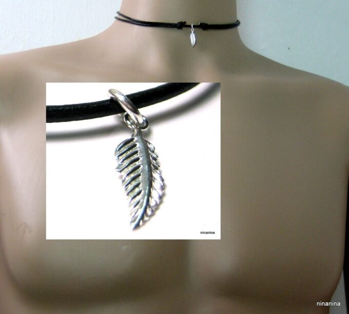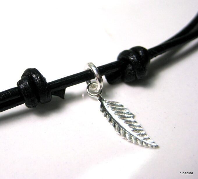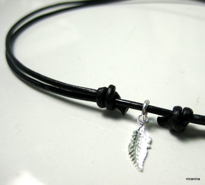 Collier homme cordon cuir plume argent 925 massif composé d’une plume en argent 925 montée sur un cordon de cuir noir (2 mm de diamètre).