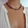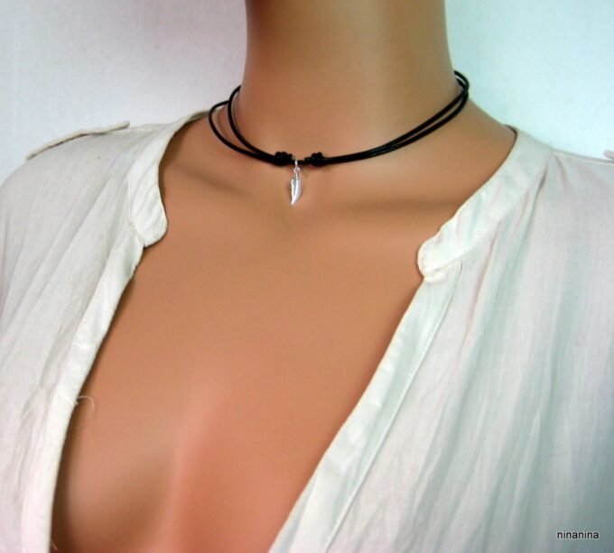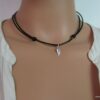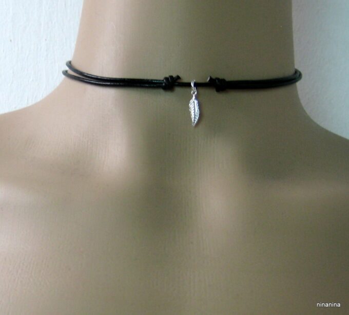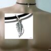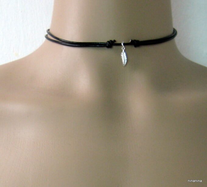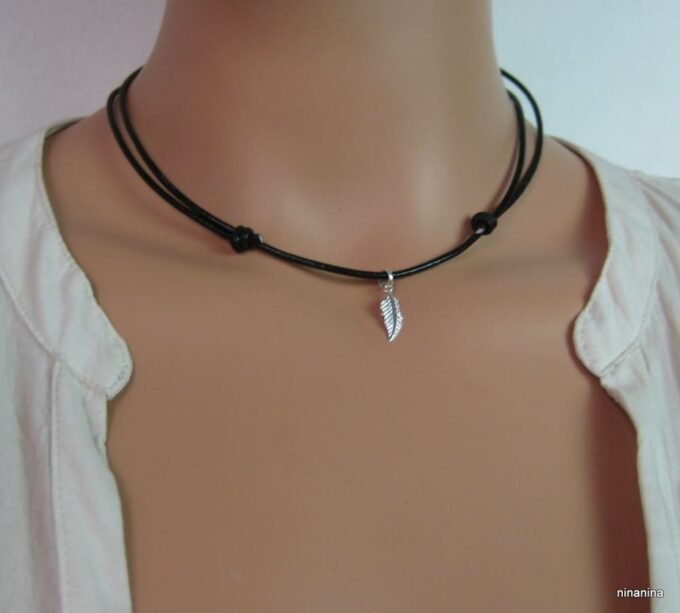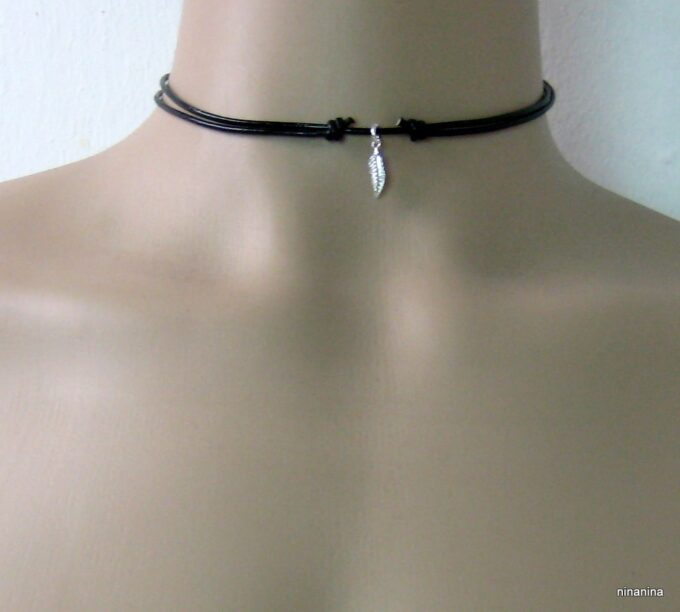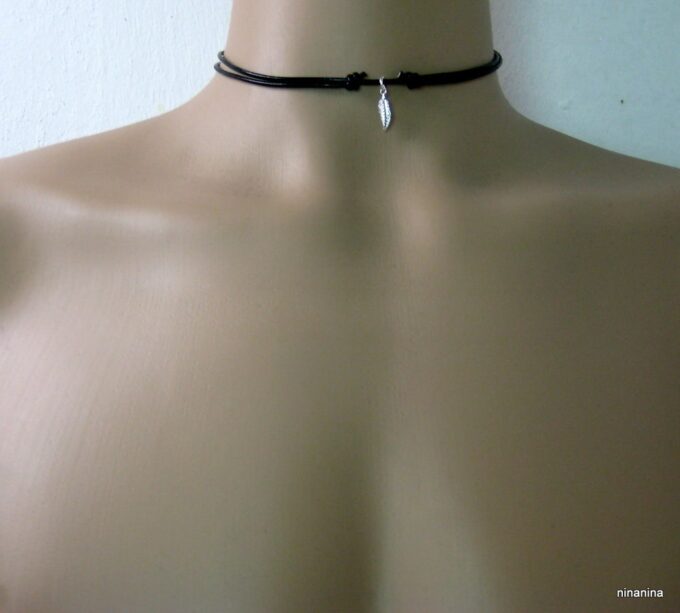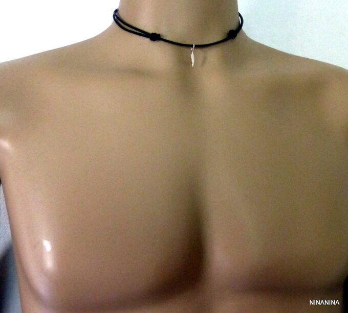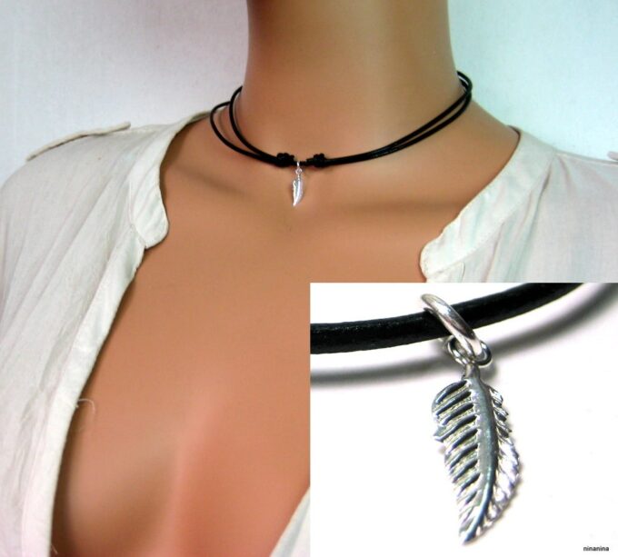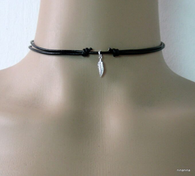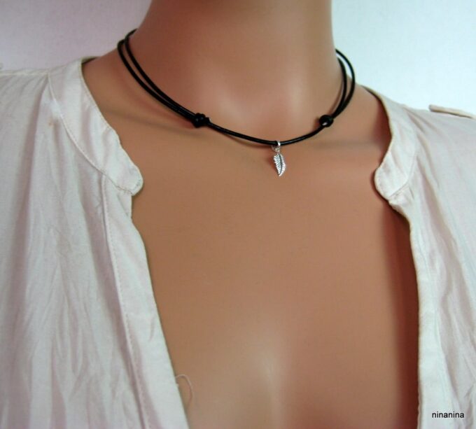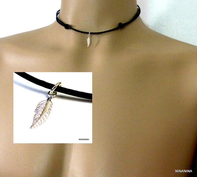 Collier homme cordon cuir plume argent 925 massif composé d’une plume en argent 925 montée sur un cordon de cuir noir (2 mm de diamètre).