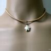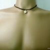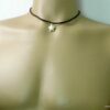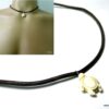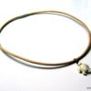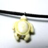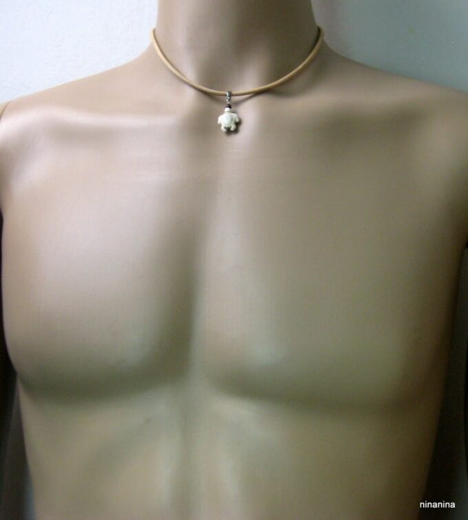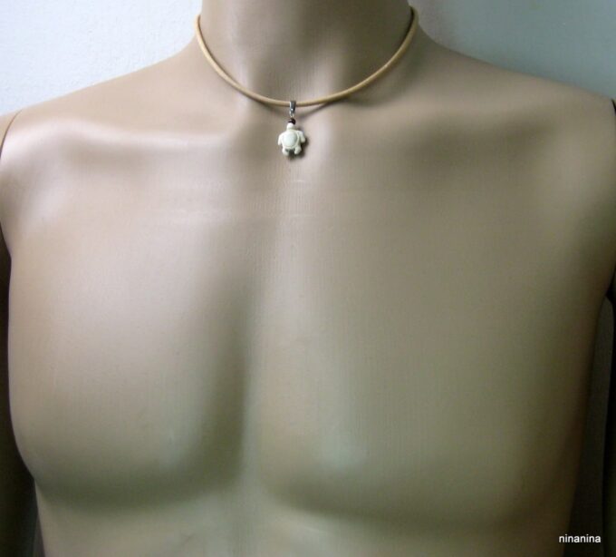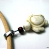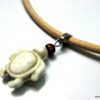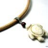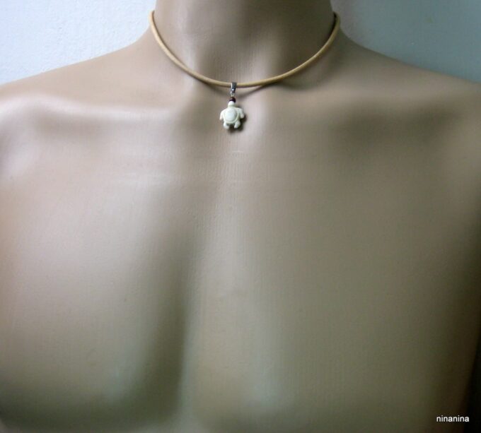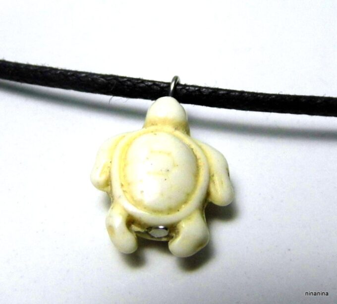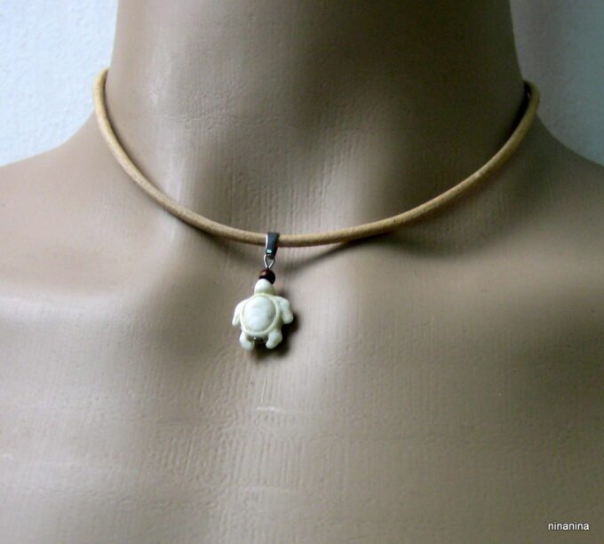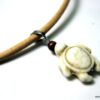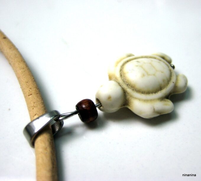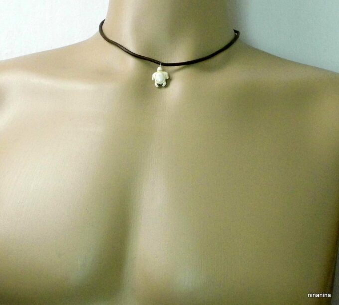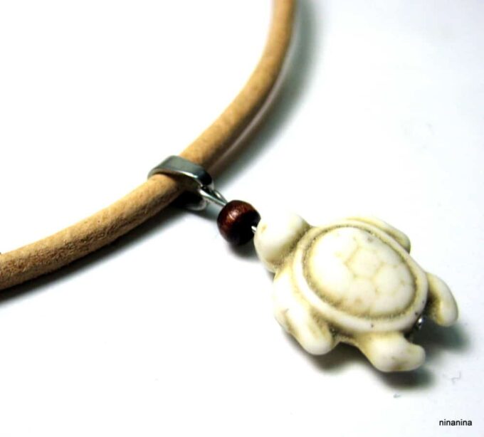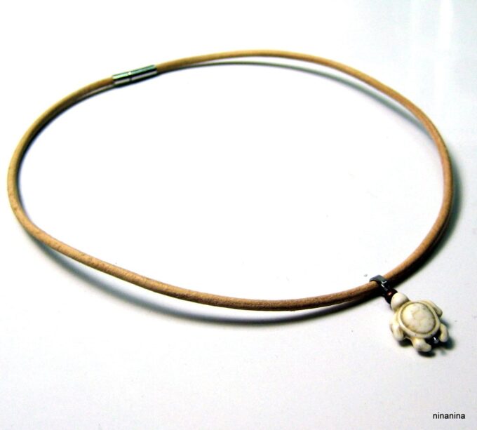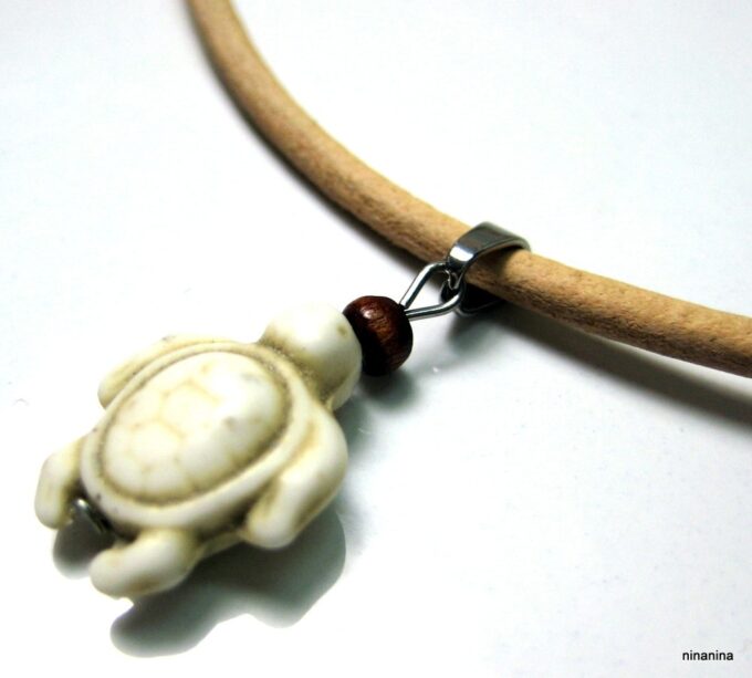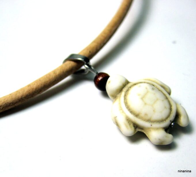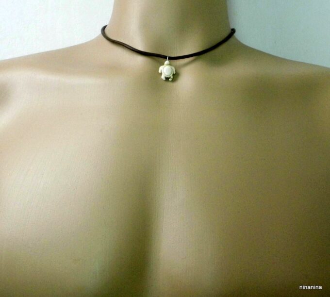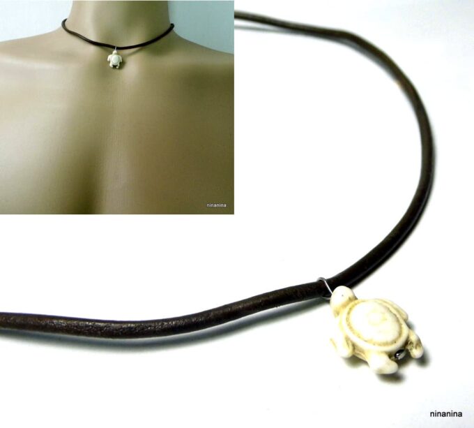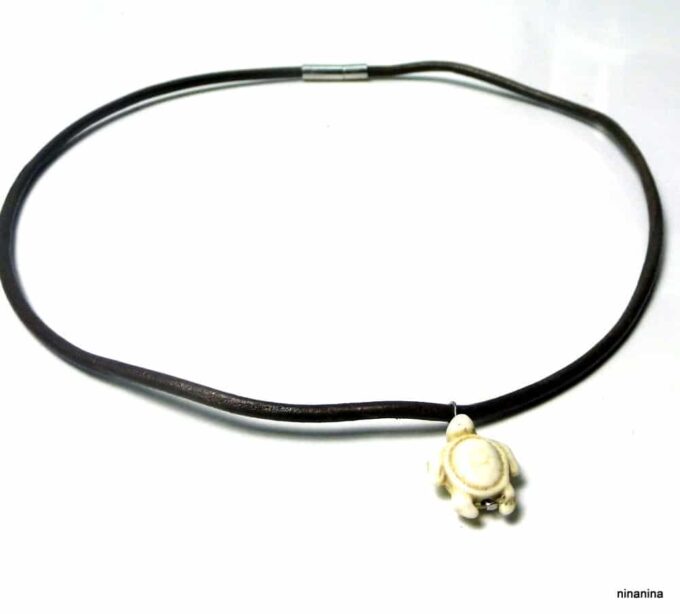 Collier cordon cuir composé d’une petite tortue blanc cassé montée sur un lien de cuir marron chocolat (3mm de diamètre). Dim de la breloque : 1,6 X 2 cm. Fermoir cylindrique en acier inoxydable. Longueur totale (fermoir compris): 44 cm env. Livré dans sa pochette d’organza. Bijou 100% fait main.