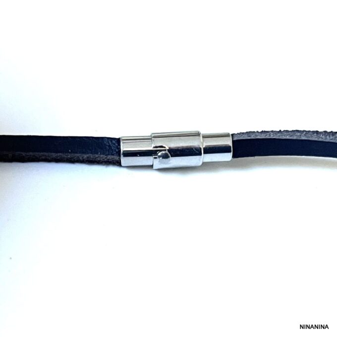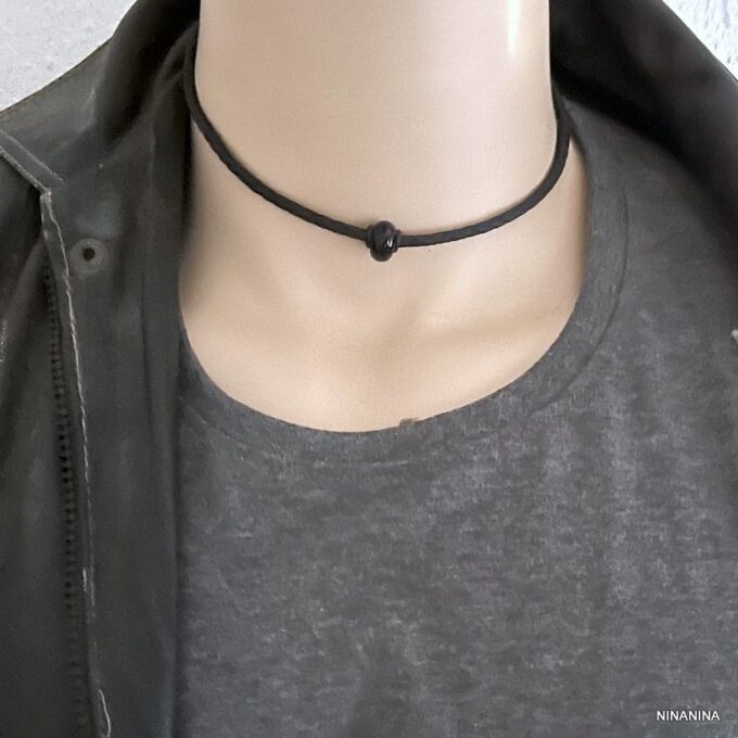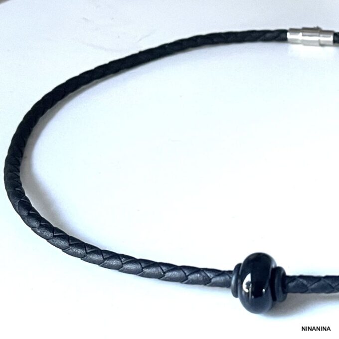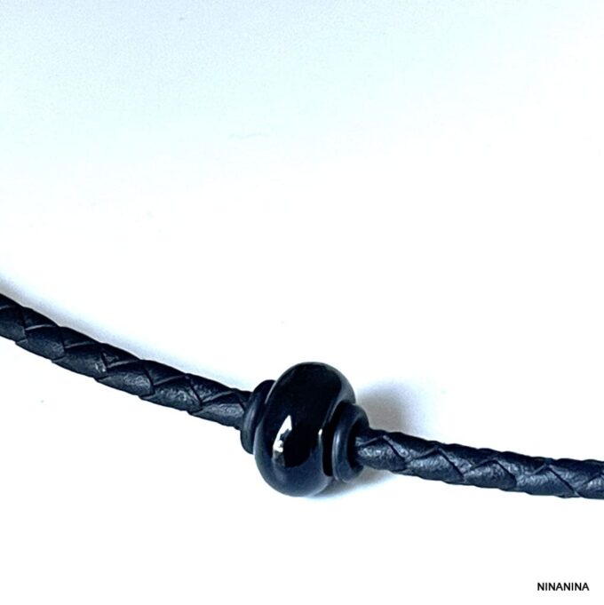 Collier Perle Noire Homme Cordon Cuir Tressé Onyx Noir composé d’une rondelle en onyx noire naturelle montée sur un lien de cuir tressé noir (4mm de diamètre).