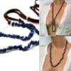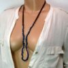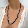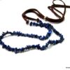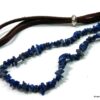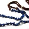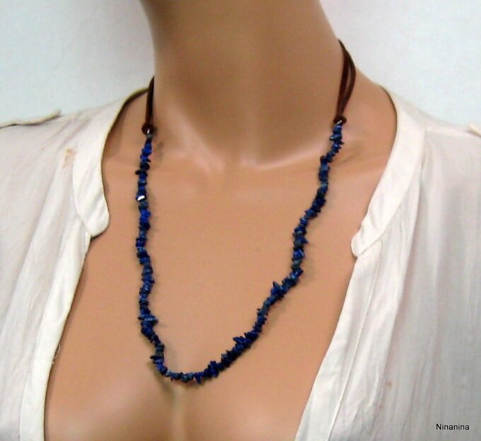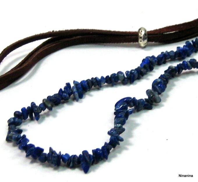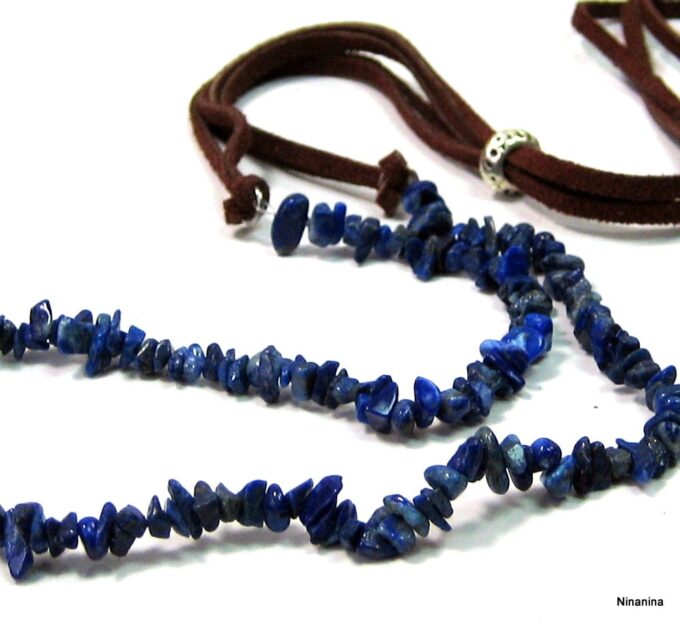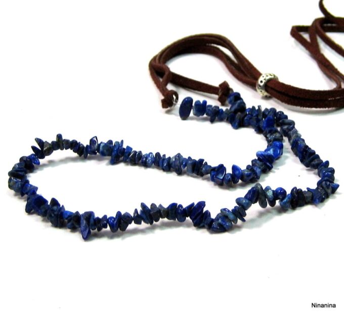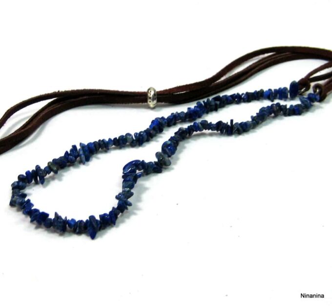 Collier lapis lazuli cordon daim composé de ships de lapis lazuli montés sur un double lacet de daim marron chocolat. Fermeture par liens coulissants. Longueur totale (ajustable): 90 cm env. Livré dans sa pochette d’organza. Bijou 100% fait-main