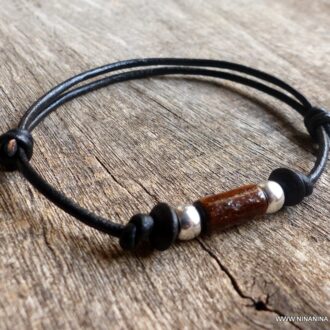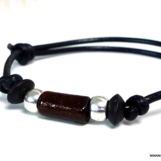 Ce collier homme cuir sobre, raffiné et élégant enlace le cou de sa lanière de cuir est composé de perles en acier inoxydable et en bois coulissant sur un lien en cuir noir de 2 mm de diamètre ajustable par noeuds coulissants de 40 à 65 cm.