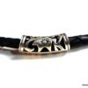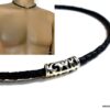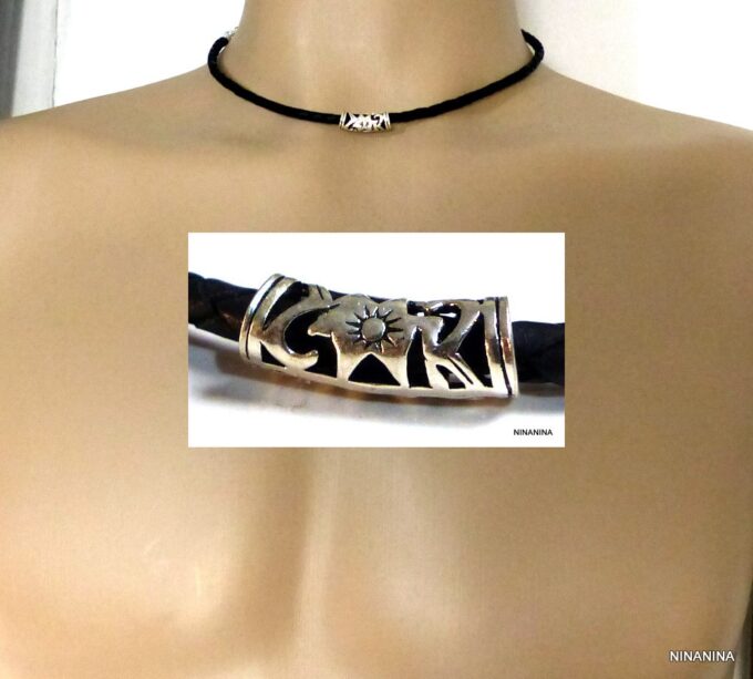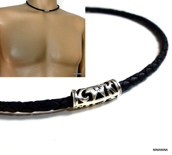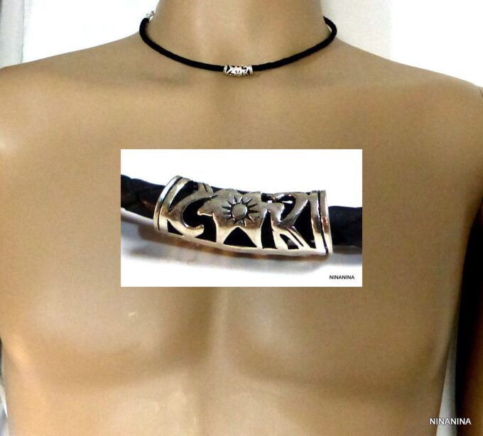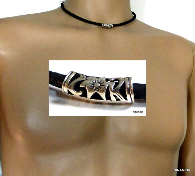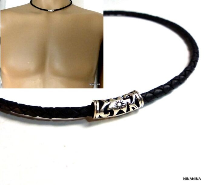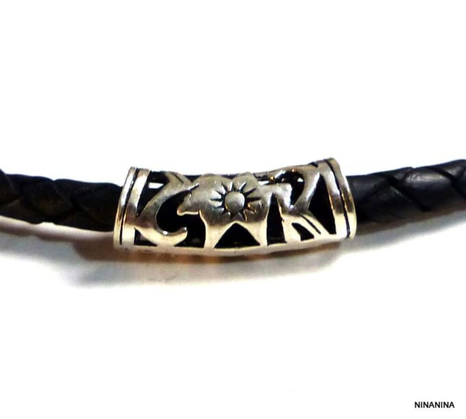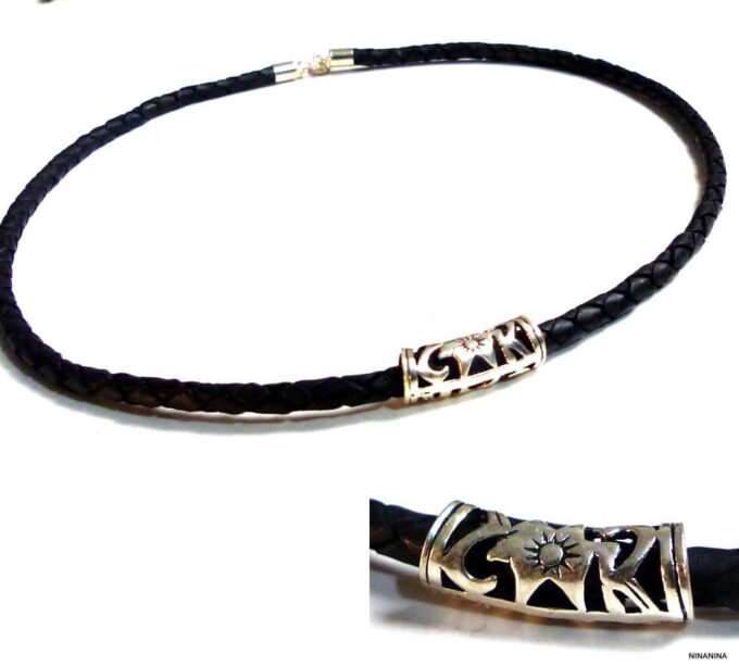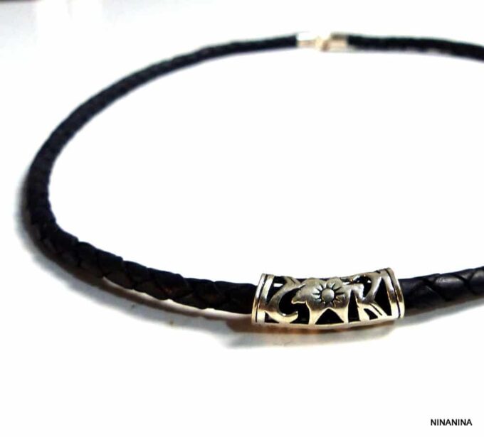 Collier homme cordon cuir tressé tube argent massif composé d’une perle tube filigranée en argent 925 montée sur un cordon de cuir tressé noir.