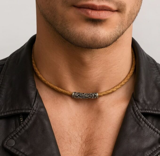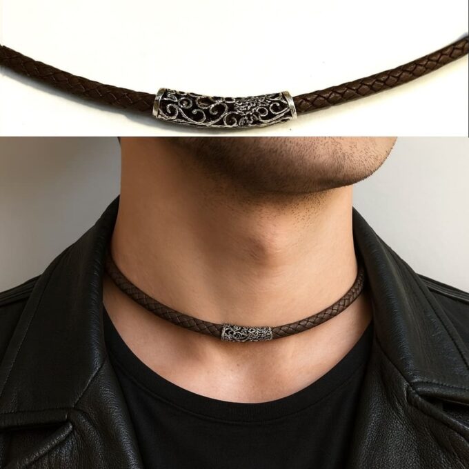 Le cuir tressé offre quant à lui robustesse et confort. Sa texture naturelle contraste harmonieusement avec l’éclat argenté de la perle, créant un collier au style équilibré, pouvant être porté au quotidien comme pour des occasions spéciales.