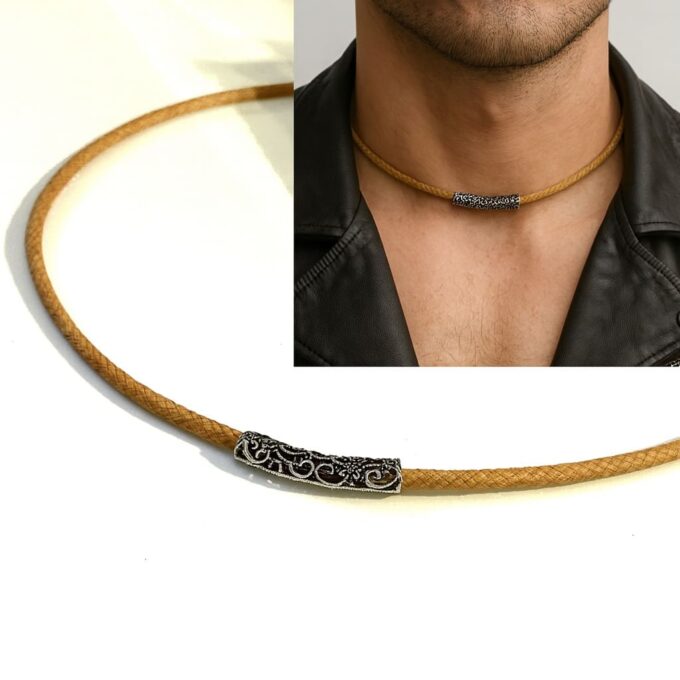 Ce collier cuir tressé est une pièce artisanale conçue pour ceux qui apprécient les bijoux authentiques et durables. Au centre, une superbe perle tube en Argent 925 massif, finement ajourée, apporte une touche d’élégance sophistiquée tout en conservant une allure masculine. Les motifs ajourés créent un jeu de lumière subtil et mettent en valeur le travail artisanal du métal précieux.