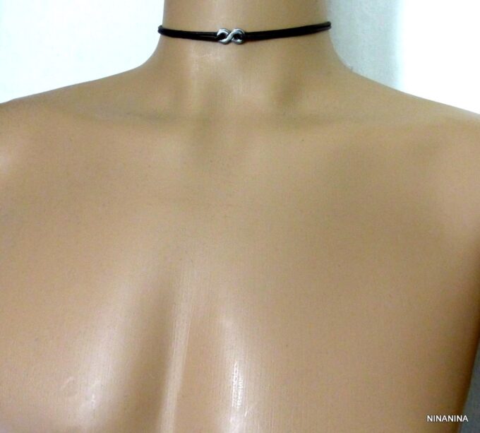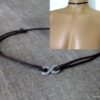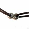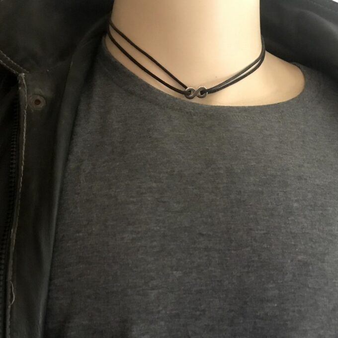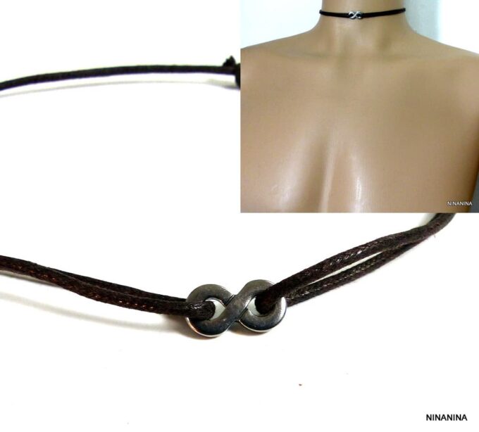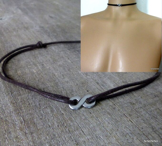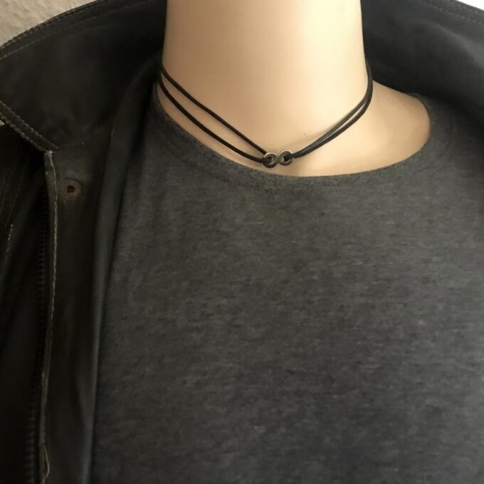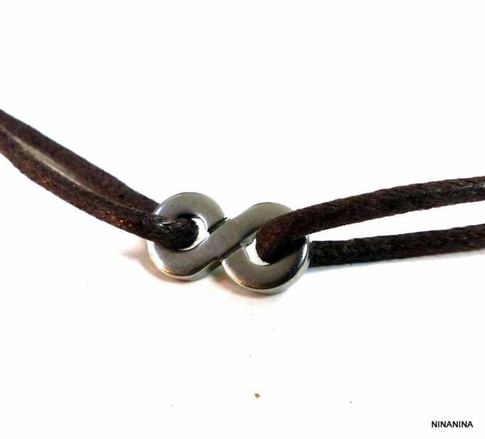 Collier signe infini pour homme en acier inoxydable composé d’une entretoise infini en acier inoxydable montée sur un cordon de coton ciré noir (2 mm de diamètre).