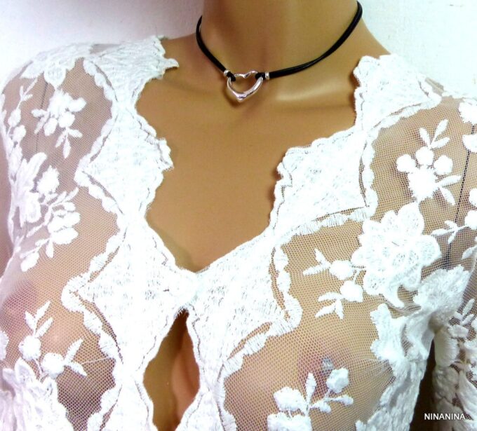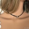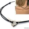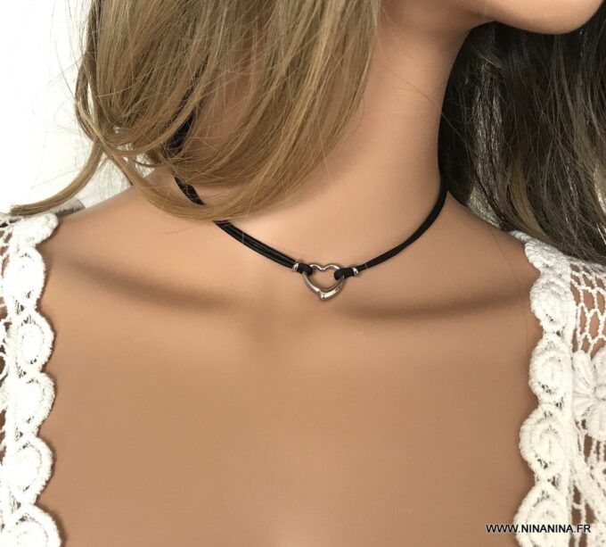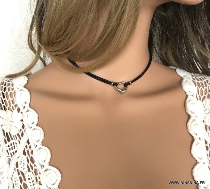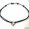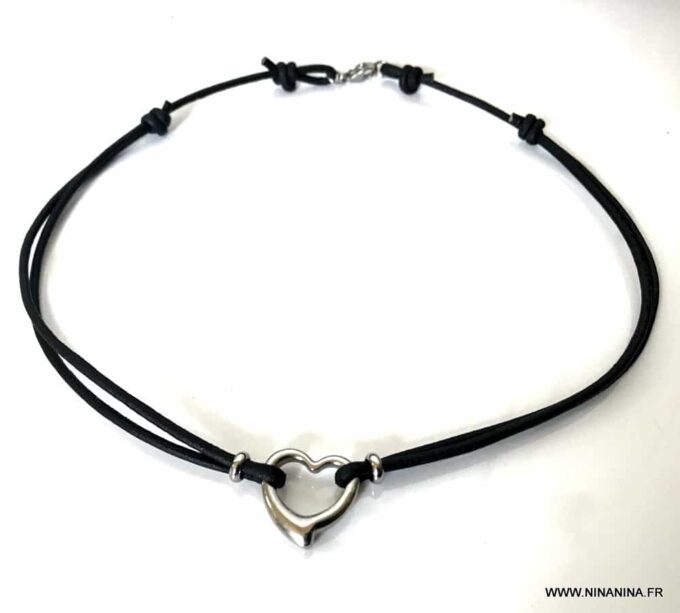 Découvrez vite ce Collier cuir ras de cou femme coeur Acier inoxydable Argent composé d’un coeur évidé et deux rondelles en acier inoxydable montés sur un double cordon de cuir noir coulissant.