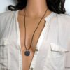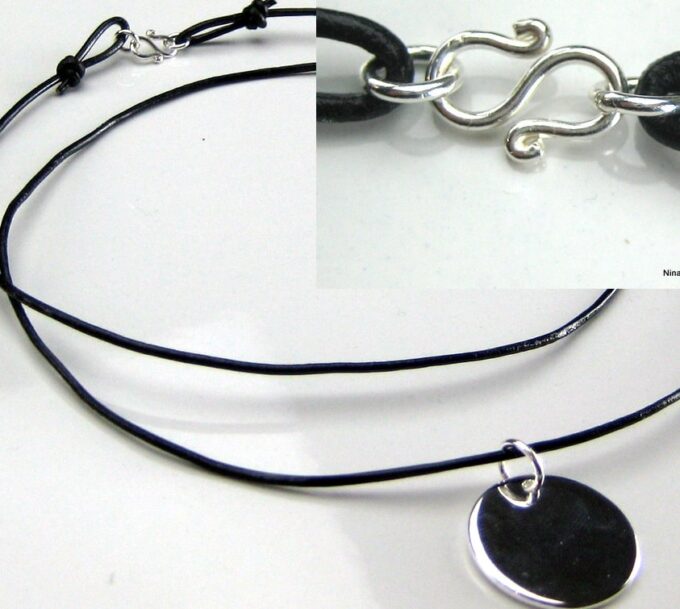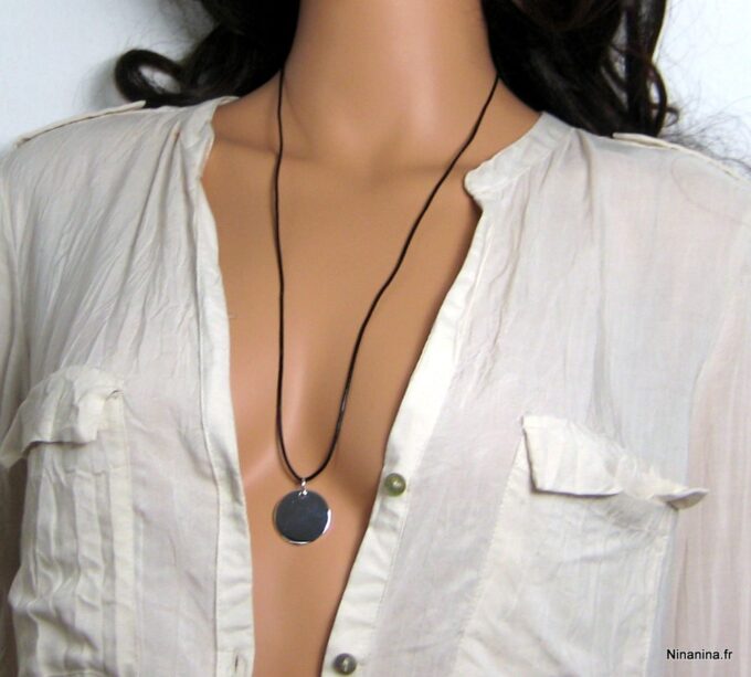 Collier cordon Cuir femme pendentif medaille plaqué Argent composé d’un pendentif rond en plaqué argent monté sur cordon de cuir (1,5mm d’épaisseur). Diamètre du pendentif : 2,5 cm. Longueur (fermoir compris) : 72 cm environ ajustable. Fermoir S en argent 925. Peut se porter long ou court selon l’envie. Existe en noir, marron chocolat, gris, rouge, beige, bleu marine, turquoise et lie de vin (merci de préciser votre choix en commentaire au moment de la commande). Livré dans sa pochette d’organza. Bijou 100% fait-main