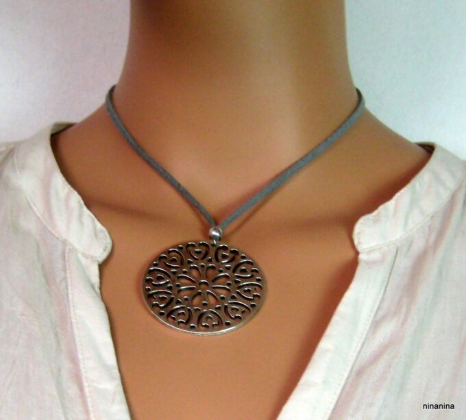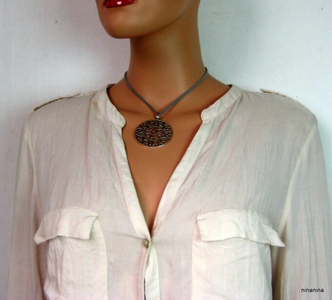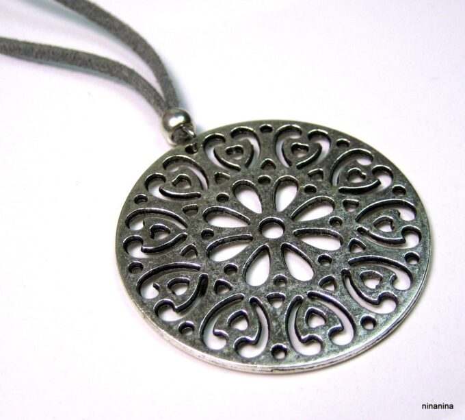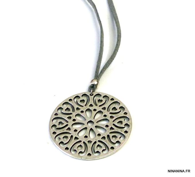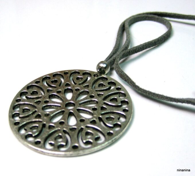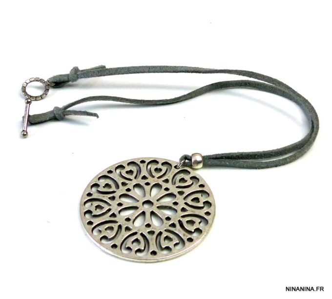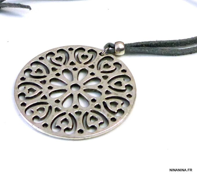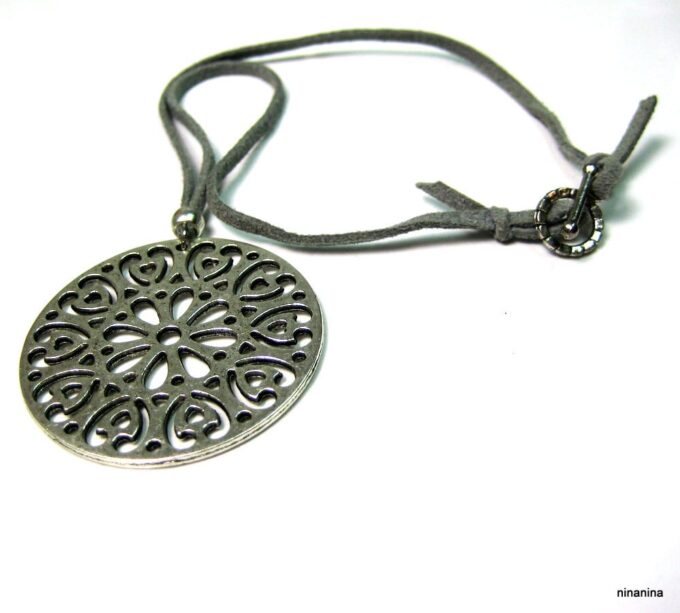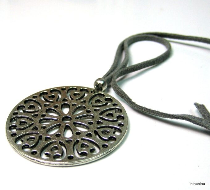 Collier lacet suedine gris pendentif rond métal argenté constitué d’un pendentif rond ajouré et d’une rondelle en métal argenté montés sur cordon de suedine gris. Diamètre du pendentif : 4,5 cm. Longueur : 40 cm environ. Fermeture par liens coulissants – fermoir T en métal argenté. Livré dans sa pochette d’organza. Bijou 100% fait-main.