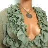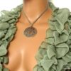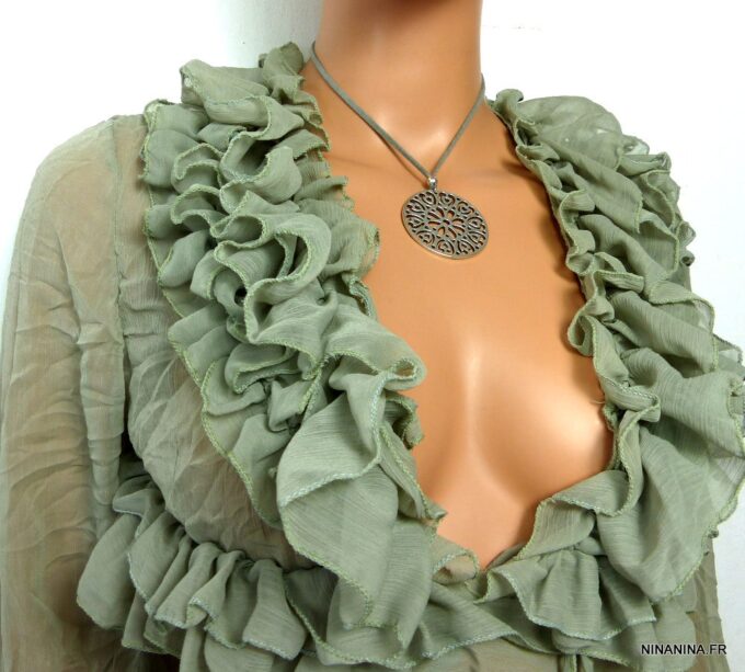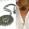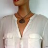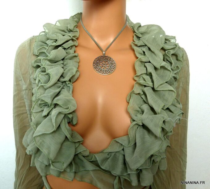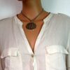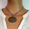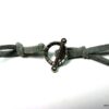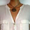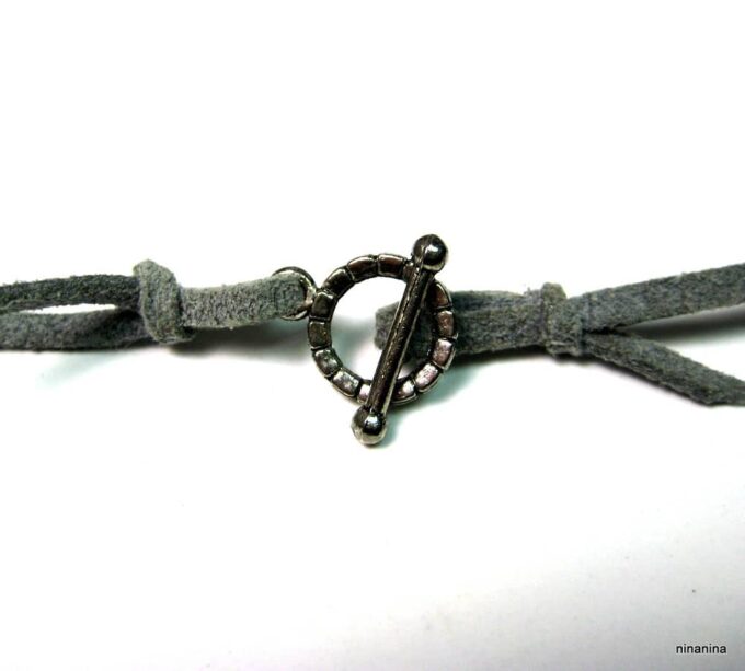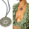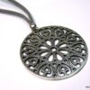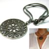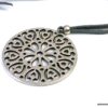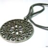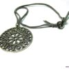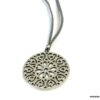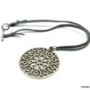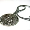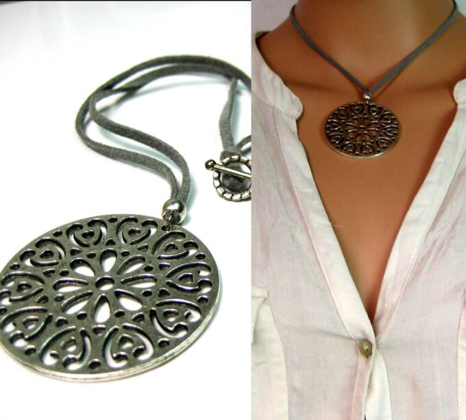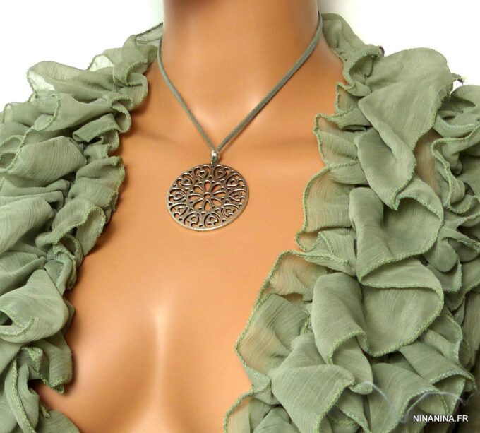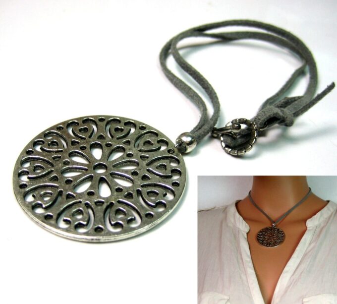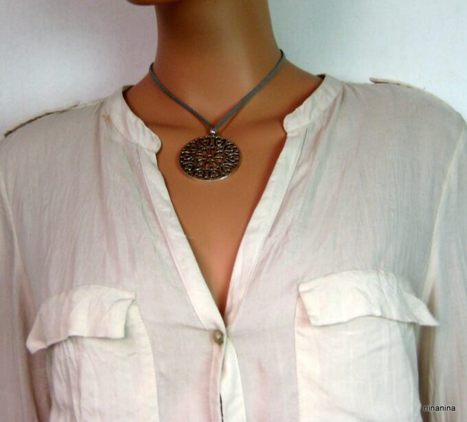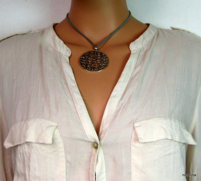 Collier lacet suedine gris pendentif rond métal argenté constitué d’un pendentif rond ajouré et d’une rondelle en métal argenté montés sur cordon de suedine gris. Diamètre du pendentif : 4,5 cm. Longueur : 40 cm environ. Fermeture par liens coulissants – fermoir T en métal argenté. Livré dans sa pochette d’organza. Bijou 100% fait-main.