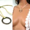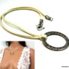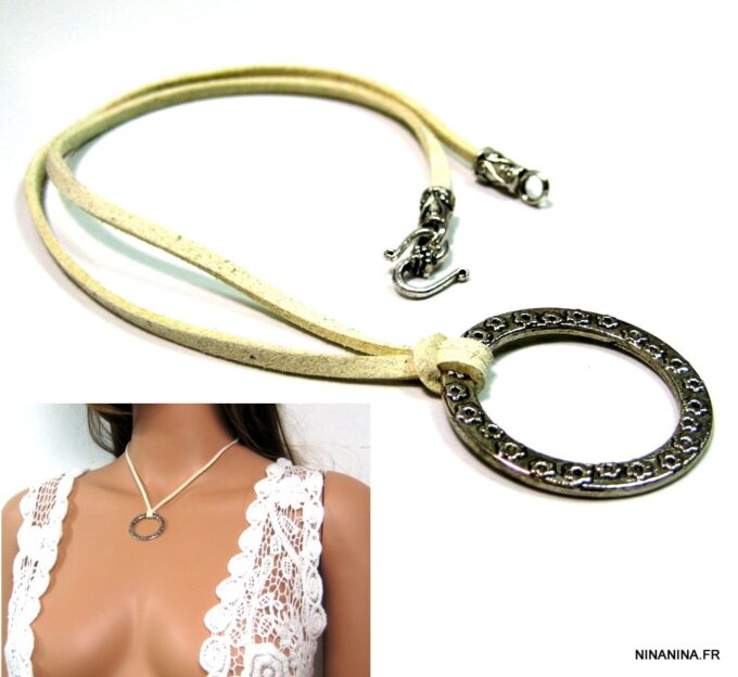 Collier cordon métal argenté et suedine constitué d’un anneau rond décoré en métal argenté monté sur lien de suédine. Diamètre de l’anneau : 3,5 cm. Existe en gris, blanc cassé, noir, caramel et bordeaux. Longueur : 38 cm environ. Fermoir ciselé en « S ». Livré dans sa pochette d’organza