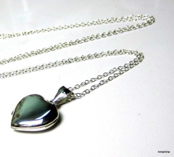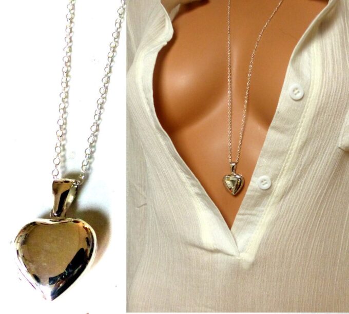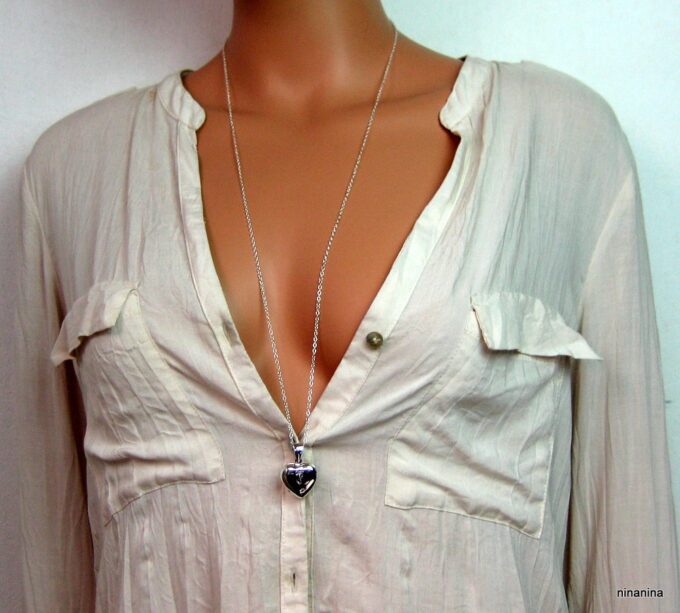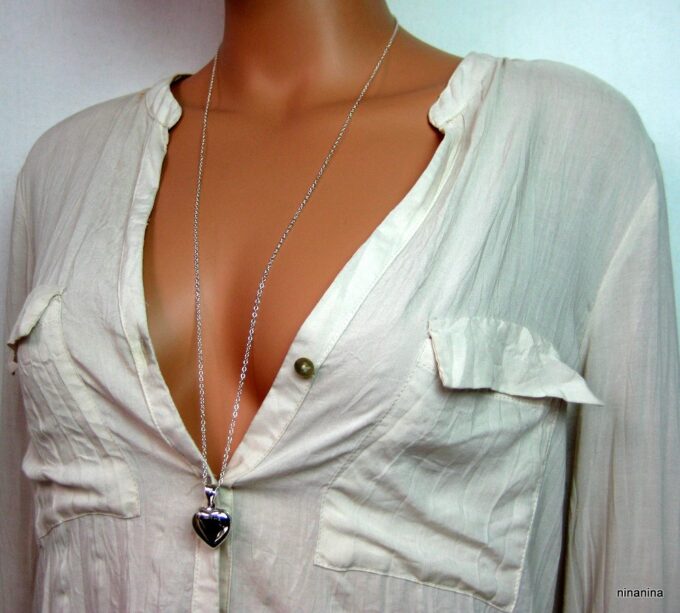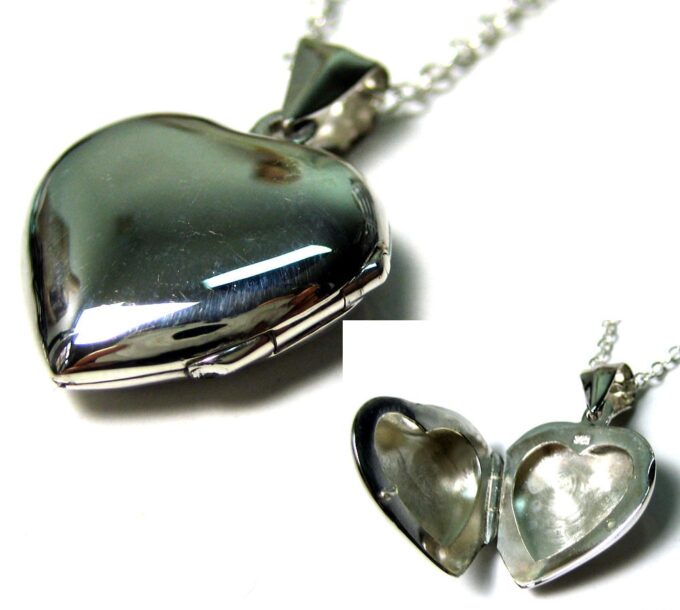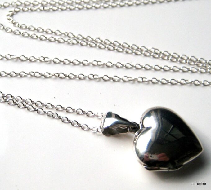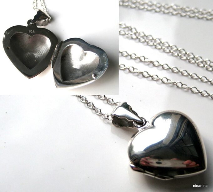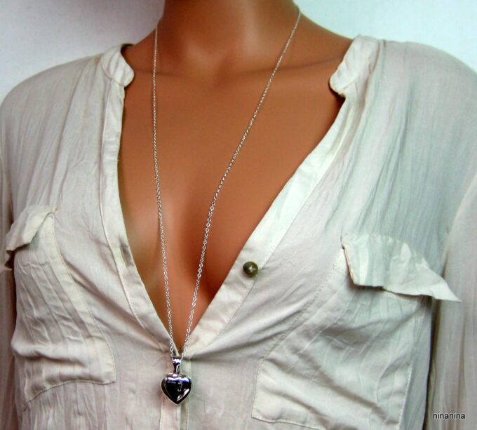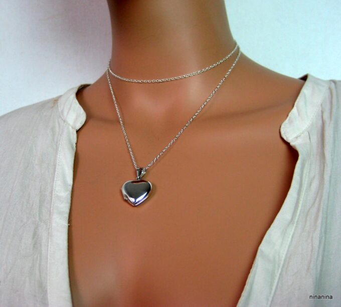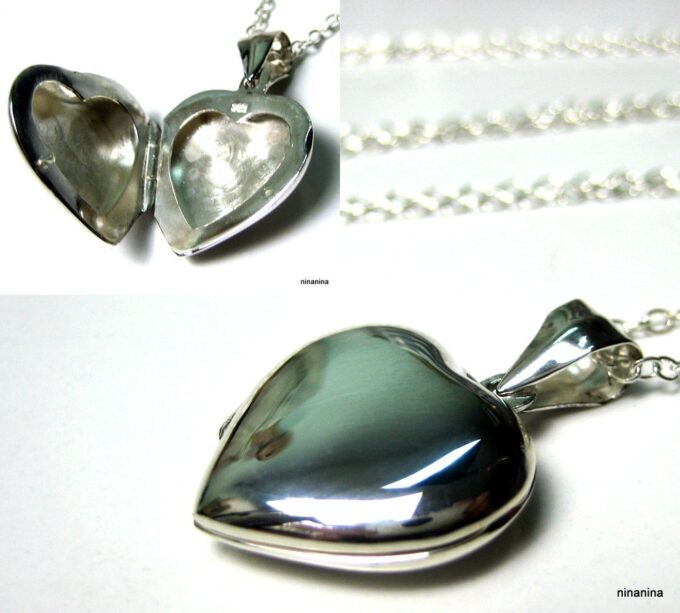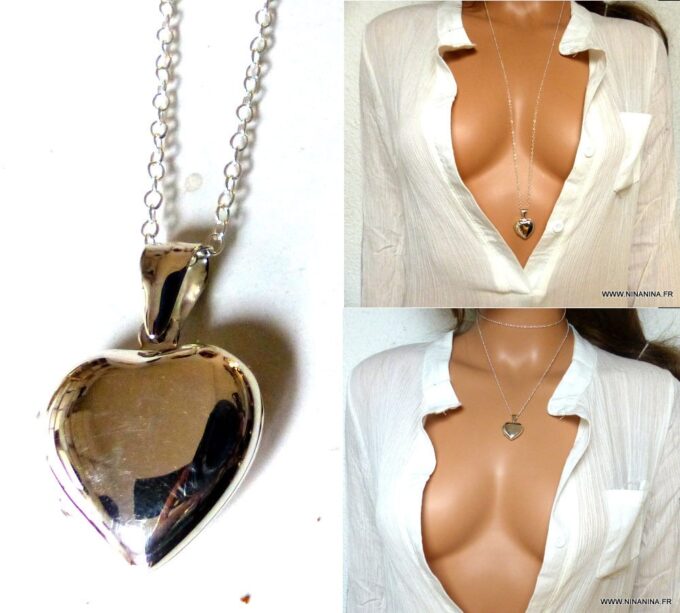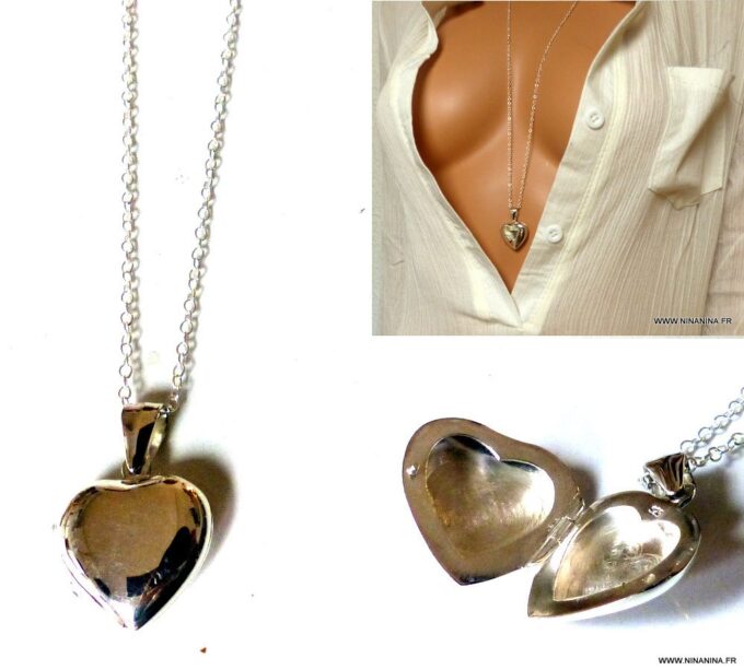 Collier femme long coeur porte photo argent massif composé d’un pendentif coeur porte-3photo en argent 925 monté sur une chaînette (1mm de diamètre) en argent 925.