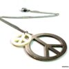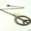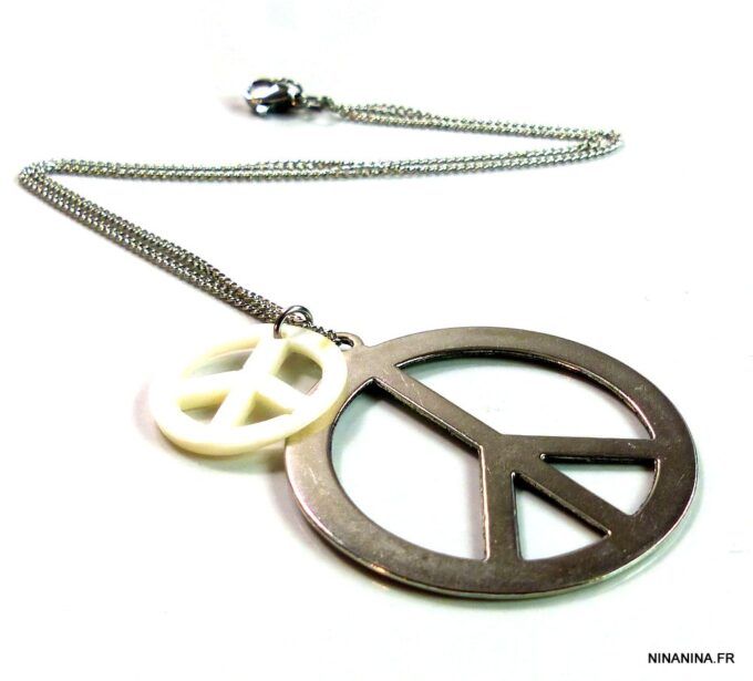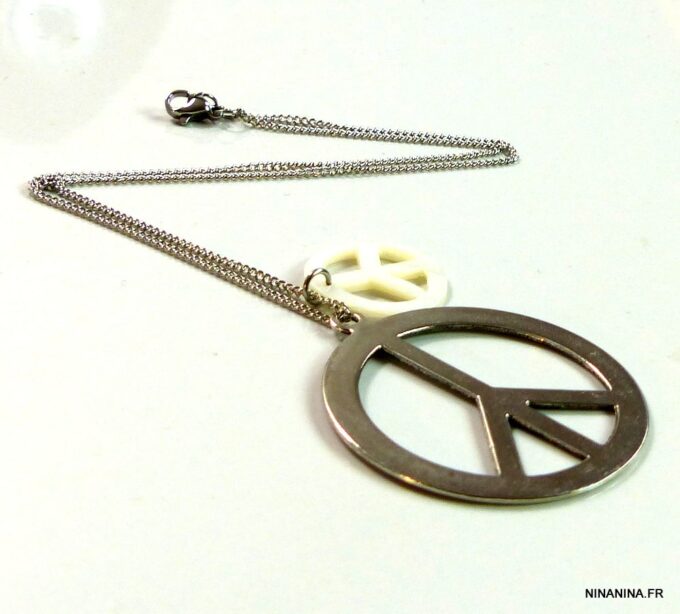 Collier peace métal argenté et nacre constitué de deux pendentifs peace en métal argenté et en nacre montés sur fine chainette. Longueur : 38 cm environ. Dim du grand pendentif peace : 4,5 X 4 cm. Fermoir mousqueton. Livré dans sa pochette d’organza. Bijou 100% fait-main.