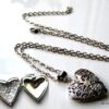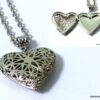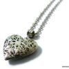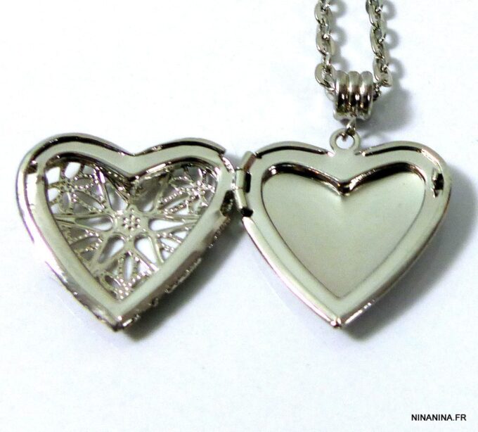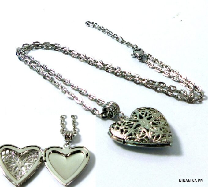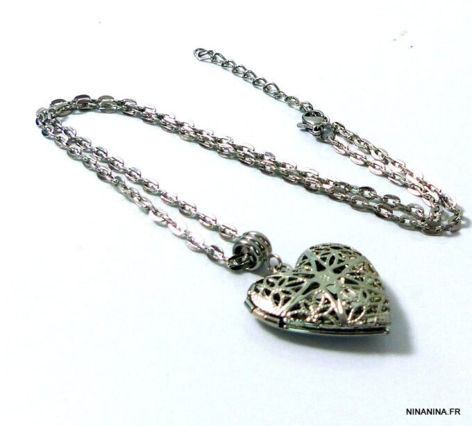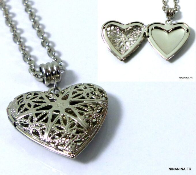 Collier coeur personnalisé photo métal argenté composé d’une petite boite coeur filigrané porte-photo en métal argenté montée sur une fine chainette en métal argenté. Dim de la boite : 2,5 X 2,7 cm. Longueur (fermoir compris) : 45 cm environ. Fermoir mousqueton et chainette de rallongement Livré dans sa pochette d’organza