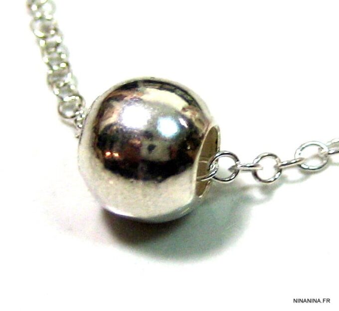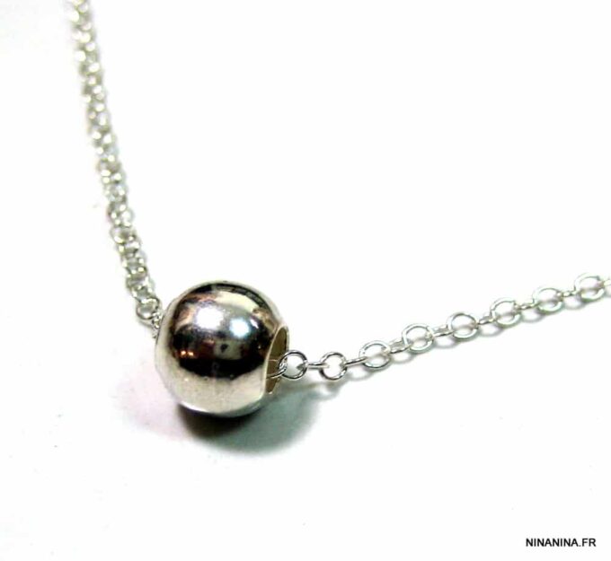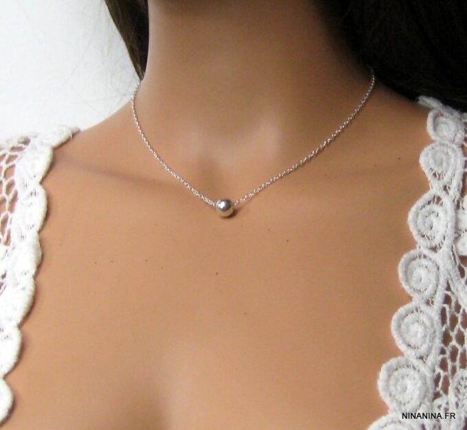 Collier court perle argent massif composé d’une perle ronde en argent 925 monté sur une chaînette (1mm de diamètre) en argent 925. Diamètre de la perle : 0,8 cm. Fermoir rond. Longueur (fermoir compris) : 41 cm. Livré dans sa pochette d’organza. Poids : 2,2 g