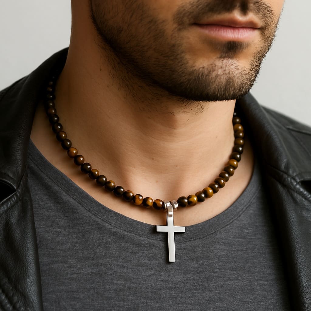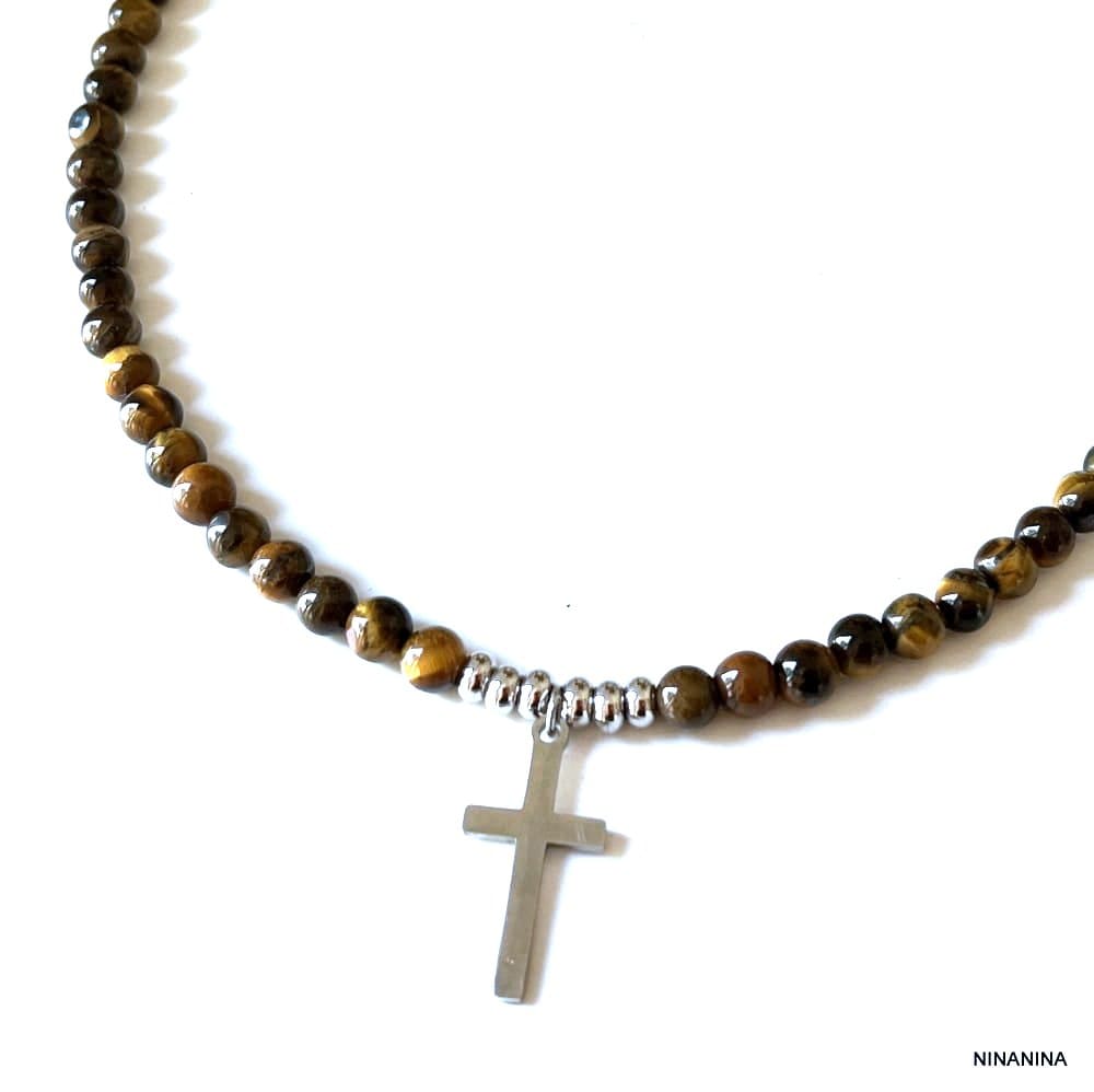 Découvrez sans plus tarder ce splendide Collier croix acier inoxydable et oeil de tigre 6mm artisanal! Ce collier croix en acier inoxydable et perles d’œil de tigre 6 mm est bien plus qu’un bijou : c’est une pièce puissante, élégante et symbolique. Entièrement réalisé à la main, ce collier en pierres naturelles associe la force protectrice de l’œil de tigre à la pureté et à la modernité de l’acier inoxydable, créant un équilibre parfait entre spiritualité, caractère et style contemporain.
