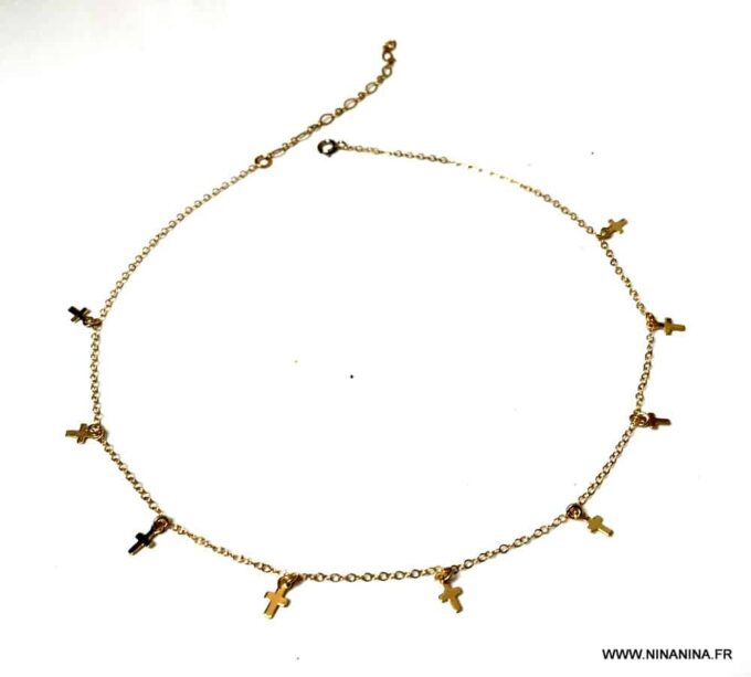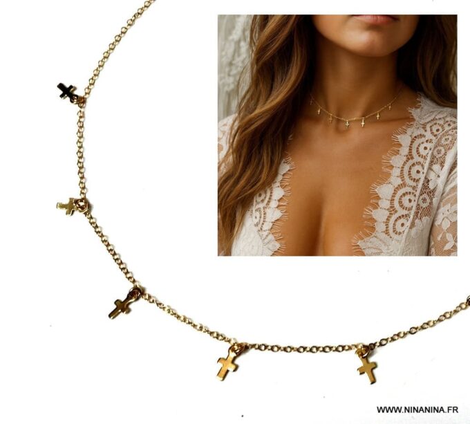 Orné de petites croix dorées suspendues le long de la chaîne, il reflète un esprit bohème chic et féminin, tout en restant sobre et raffiné. Un bijou religieux certes mais pas seulement, un bijou tendance avant tout !