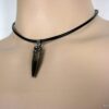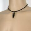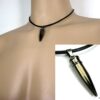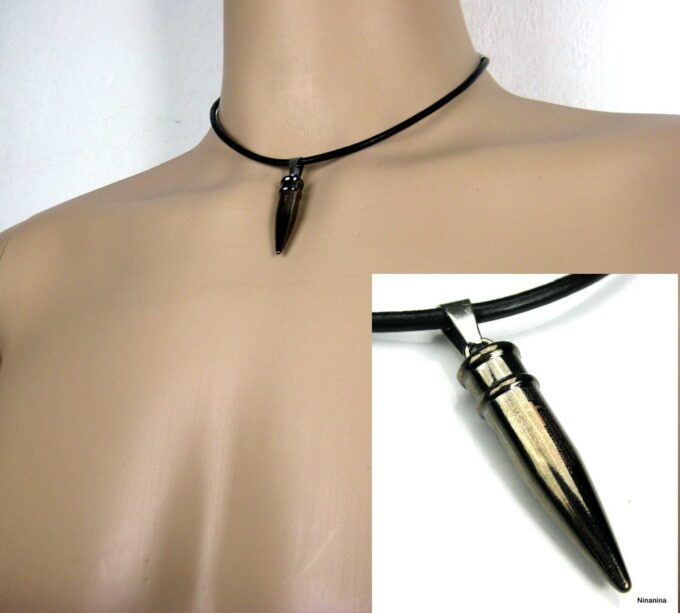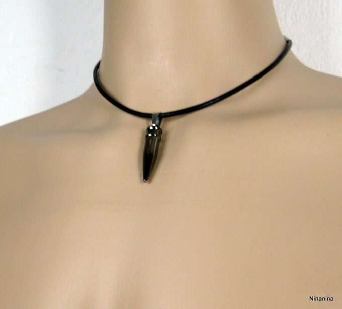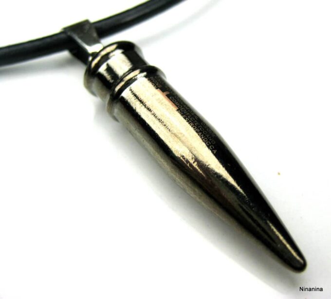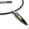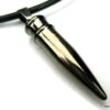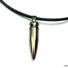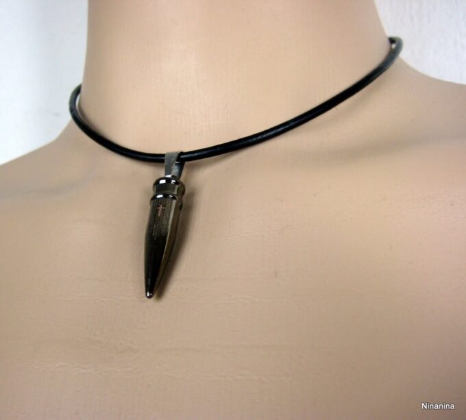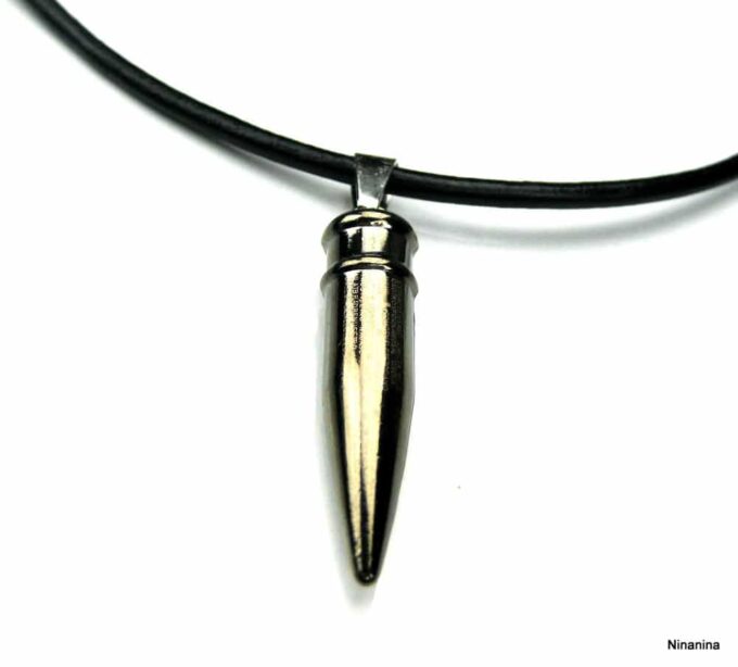 Collier homme cuir balle revolver acier argenté composé d’un pendentif cylindrique balle de revolver en acier inoxydable noir et argent monté sur un cordon de cuir noir (3mm de diamètre).