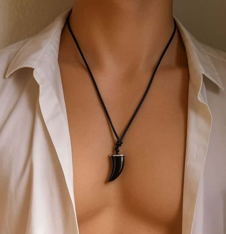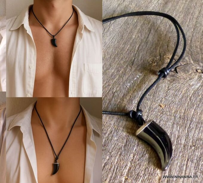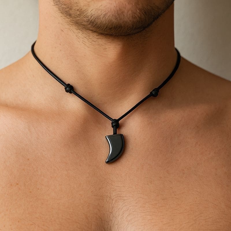 Le pendentif est fabriqué en hématite naturelle, une pierre connue pour son éclat métallique et son symbole de force. Sa forme griffe apporte une touche tribale et moderne, très appréciée dans les bijoux masculins.