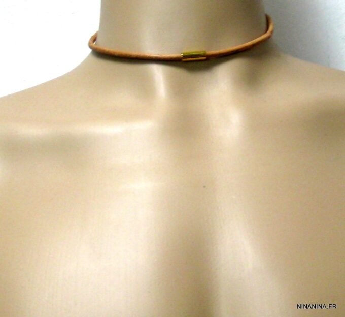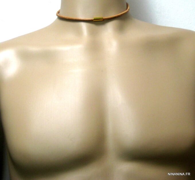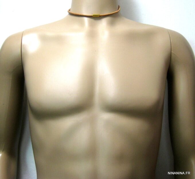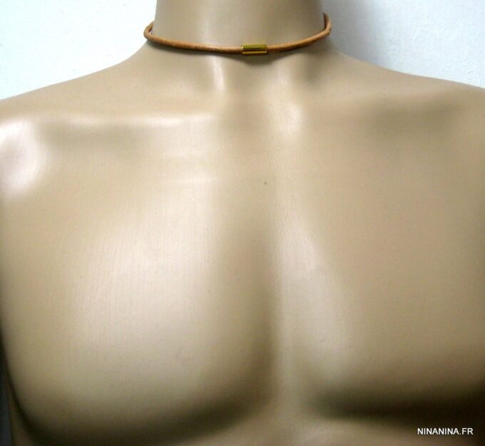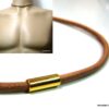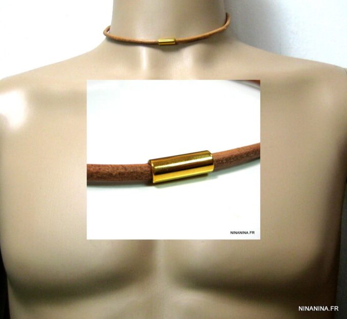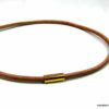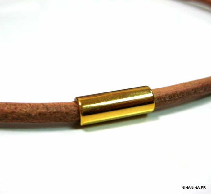Collier homme cuir fermoir acier inoxydable doré composé d’un fermoir cylindrique aimanté en acier inoxydable doré monté sur un cordon de cuir naturel (4 mm de diamètre).