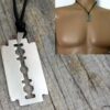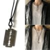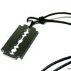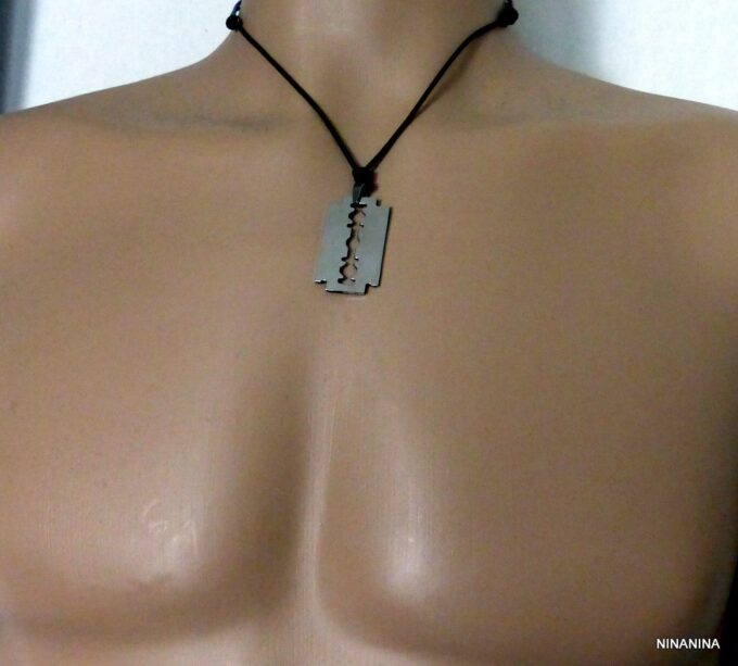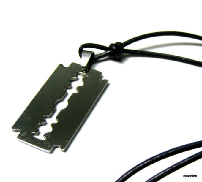 Craquez pour ce superbe Pendentif lame de rasoir Acier cordon cuir reglable composé d’un pendentif lame de rasoir en acier inoxydable argenté monté sur un lien de cuir noir (2mm de diamètre) ajustable.