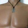 Dim du pendentif : 4,4 X 2,2 cm. Diamètre du cordon : 2 mm. Fermeture par liens coulissants. Longueur : de 38 à 72 cm env réglable.
