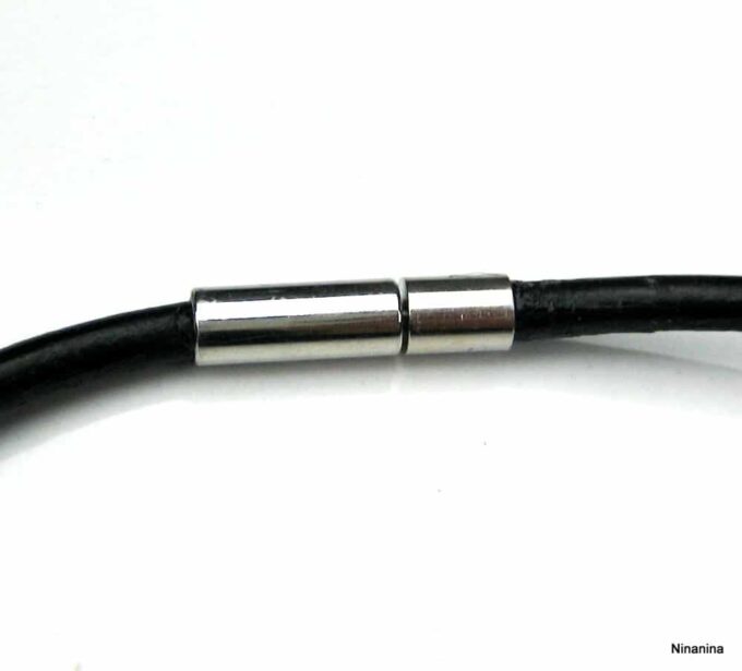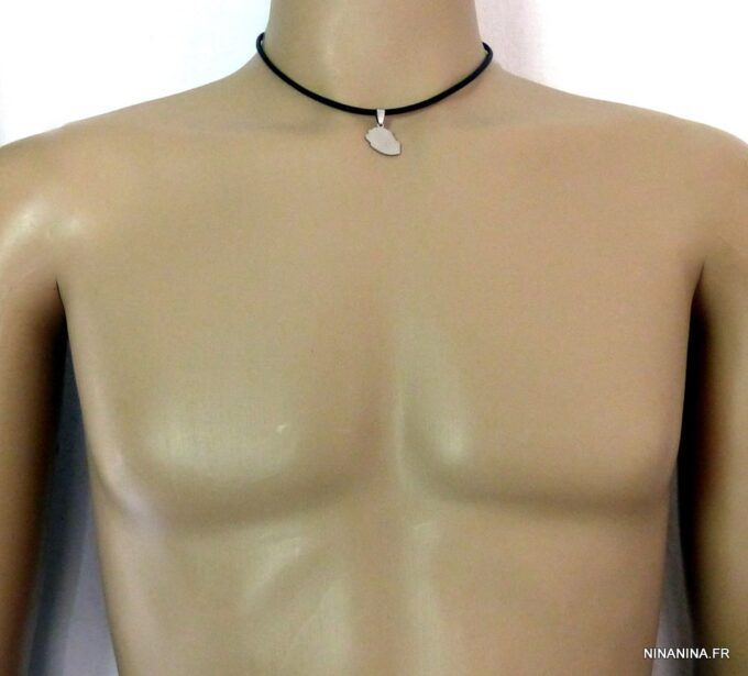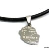 Collier cordon cuir pendentif réunion acier inoxydable composé d’un pendentif réunion en acier inoxydable monté sur un cordon en cuir noir (3mm de diamètre). Dim du pendentif : 2 X 1,8 cm env. Fermoir cylindrique en acier inoxydable. Longueur totale (fermoir compris): 44 cm – TOUTE AUTRE LONGUEUR POSSIBLE. Livré dans sa pochette d’organza.