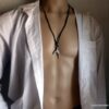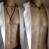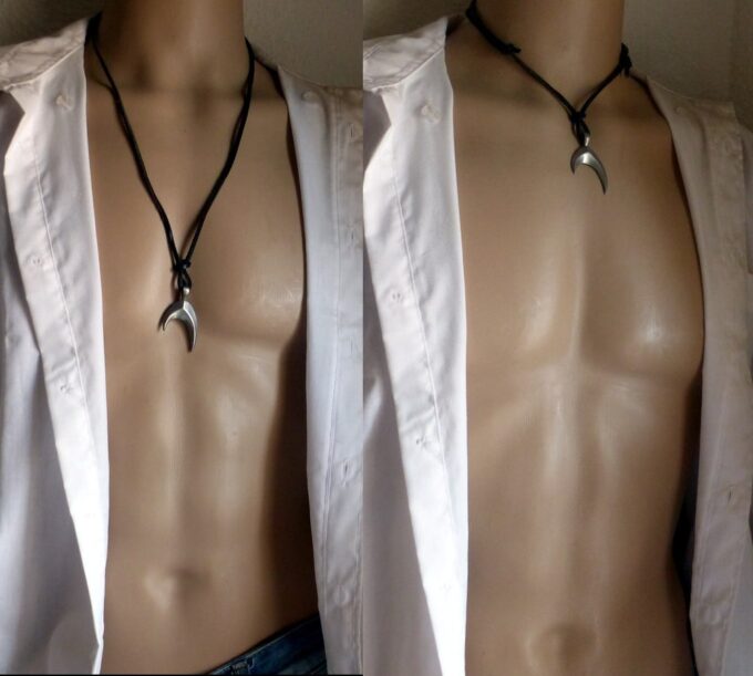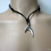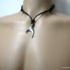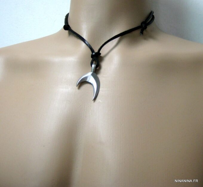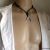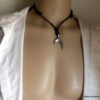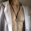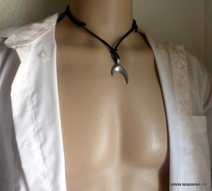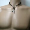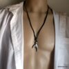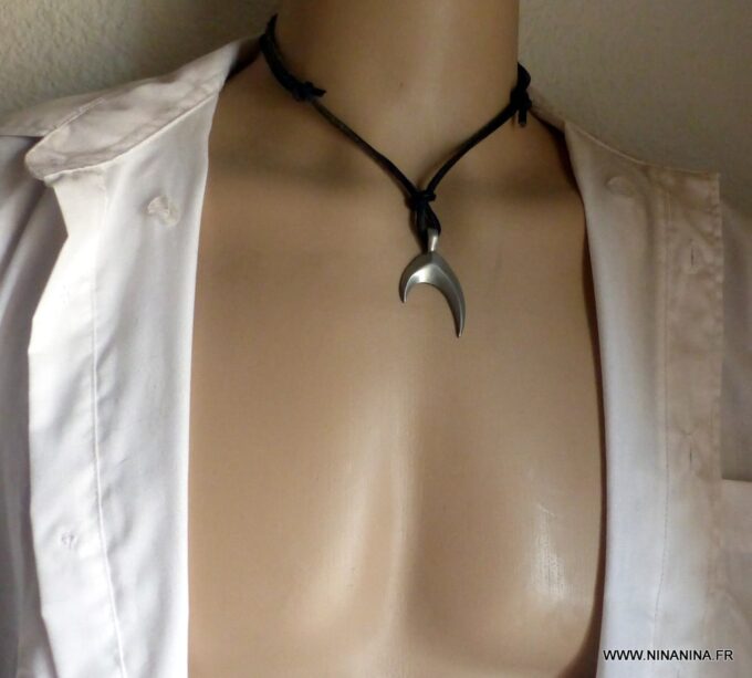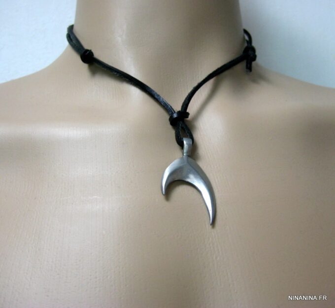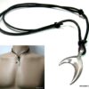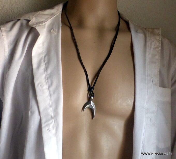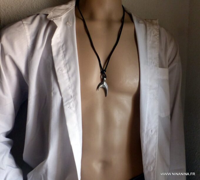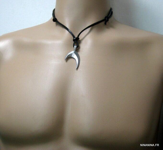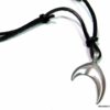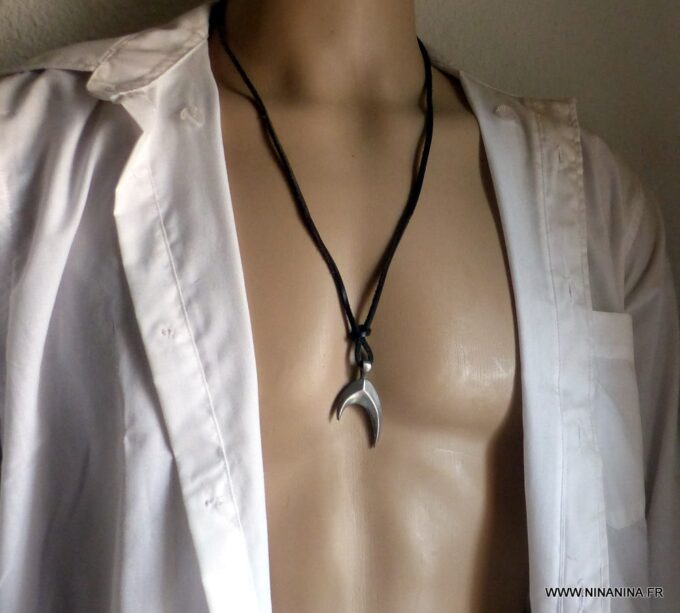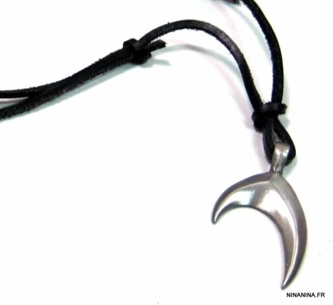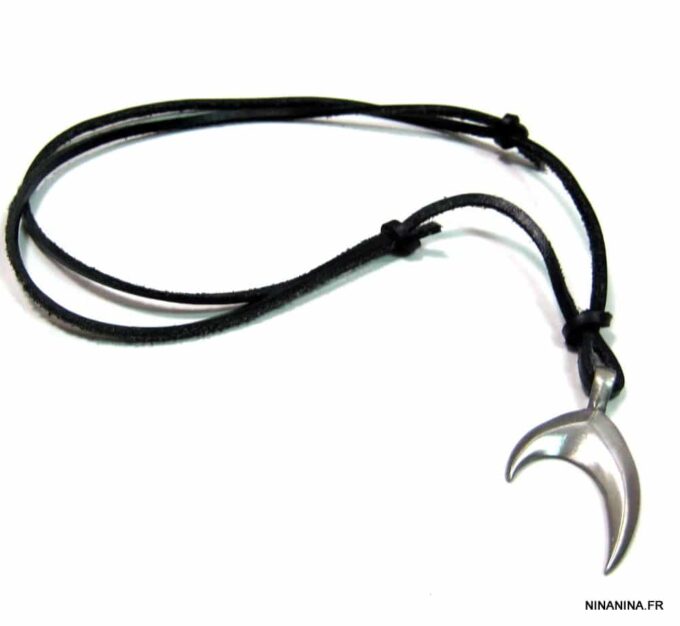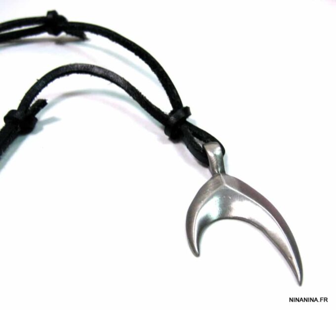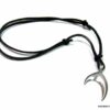 Collier homme cuir queue de baleine acier argenté composé d’un pendentif queue de baleine en acier inoxydable monté sur un lien de cuir noir (3mm de large).