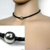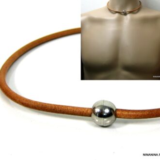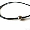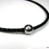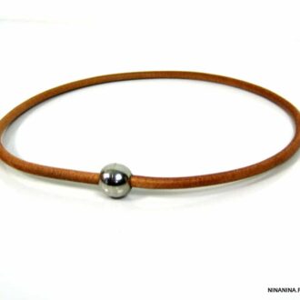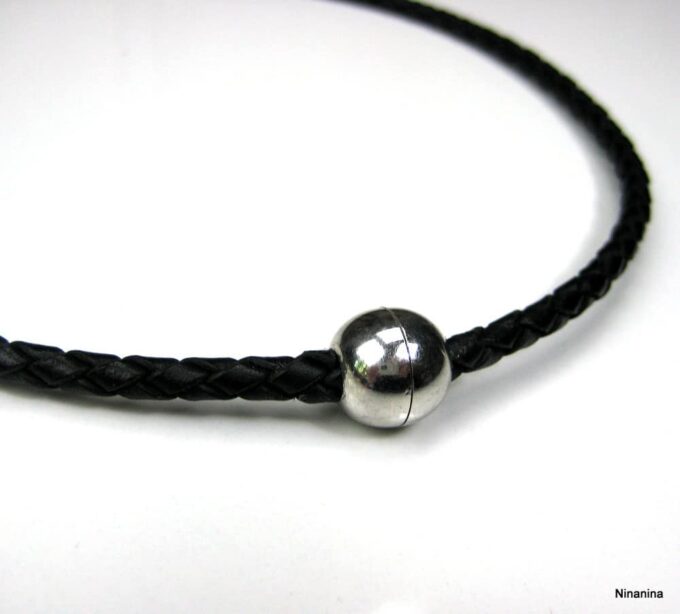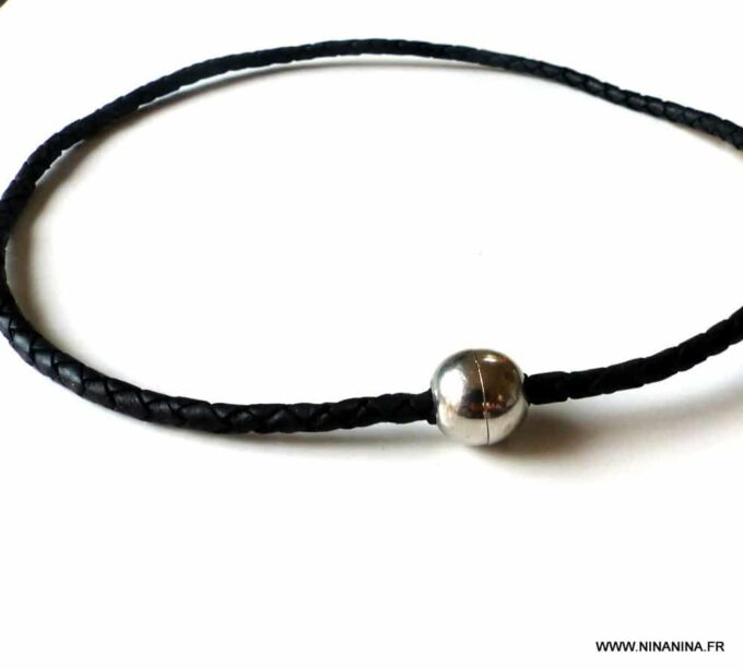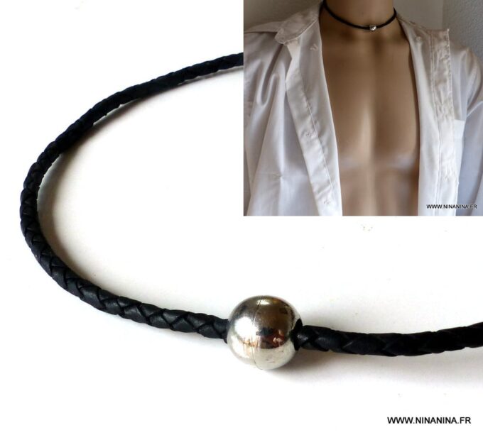 Collier homme cuir tressé boule métal argenté composé d’un cordon de cuir tressé monté sur un fermoir rond aimanté en métal argenté.
