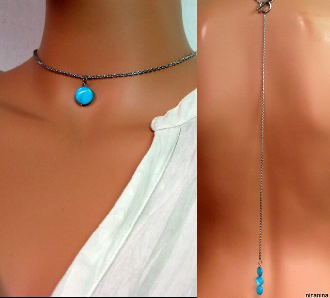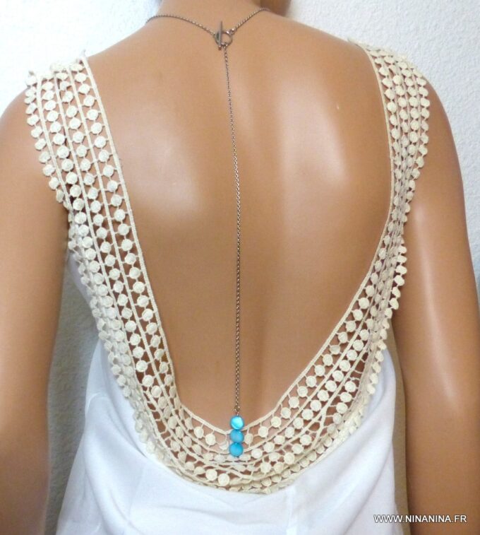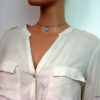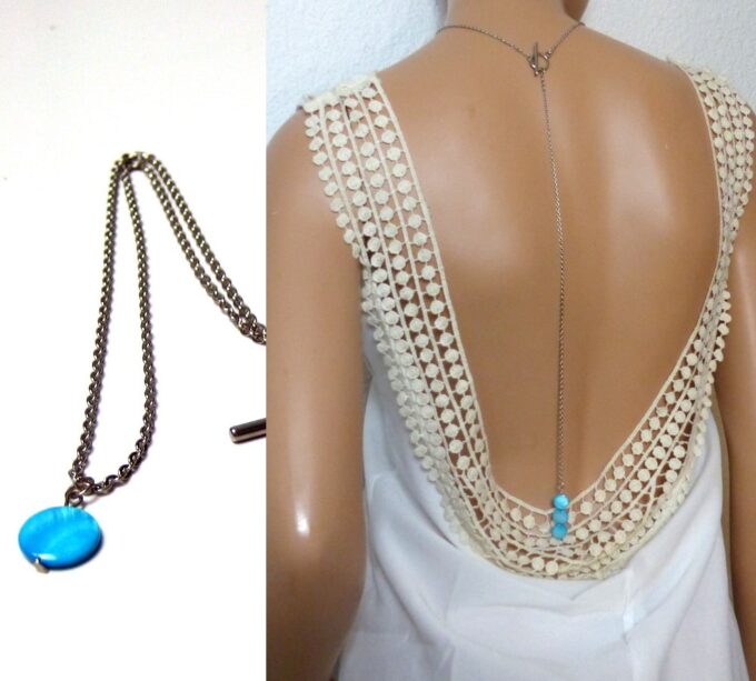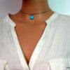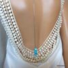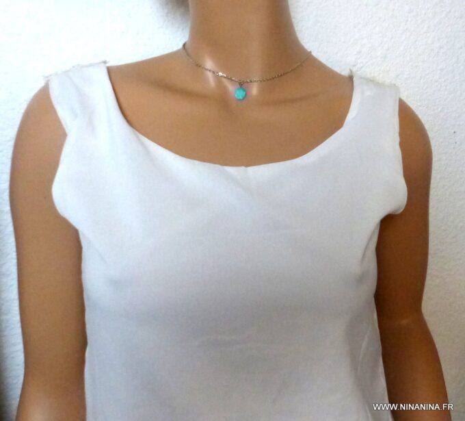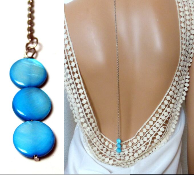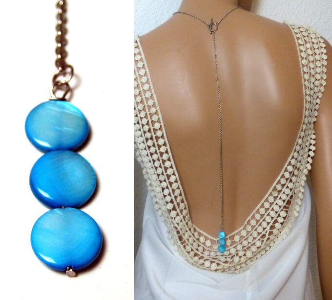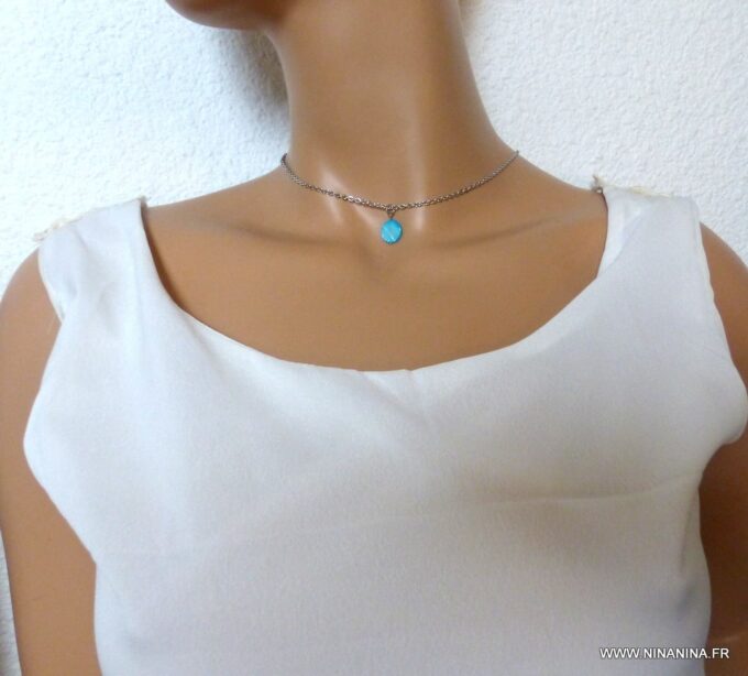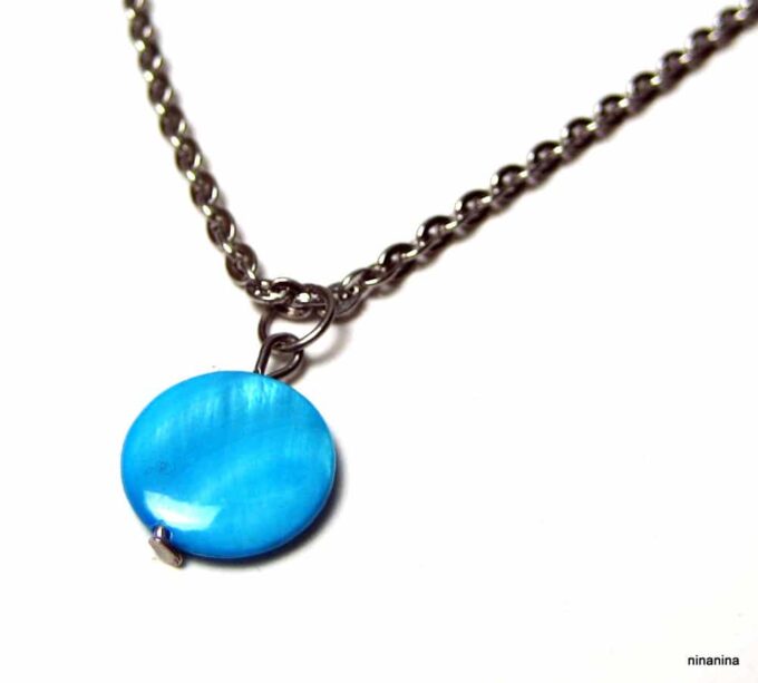 Collier de dos acier inoxydable nacre turquoise composé de palets ronds en nacre blanche montés sur une fine chainette en acier inoxydable.