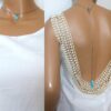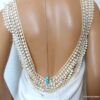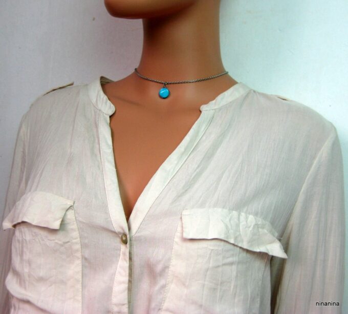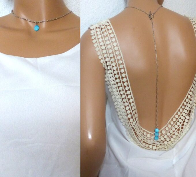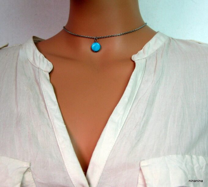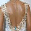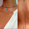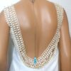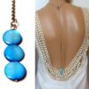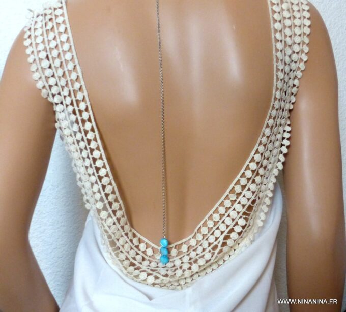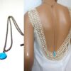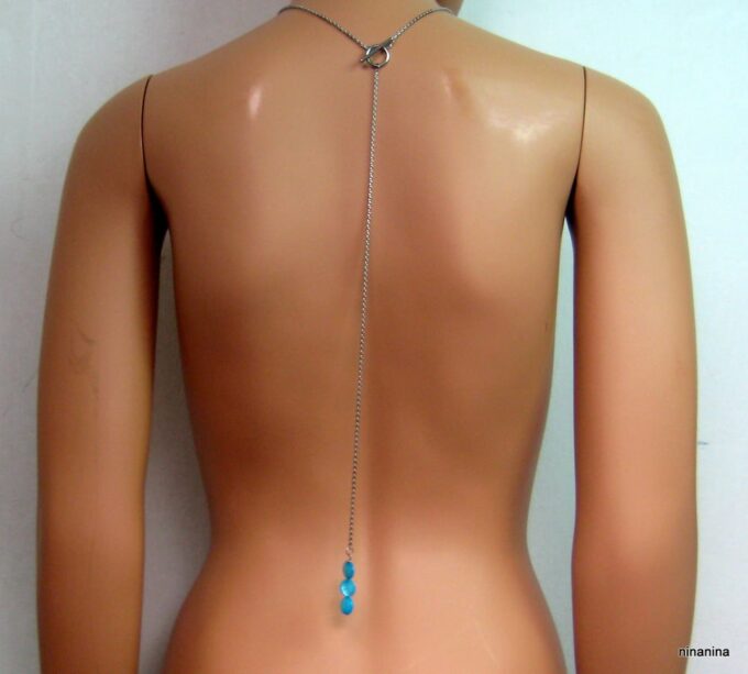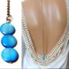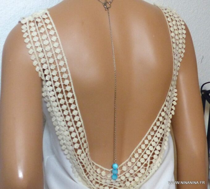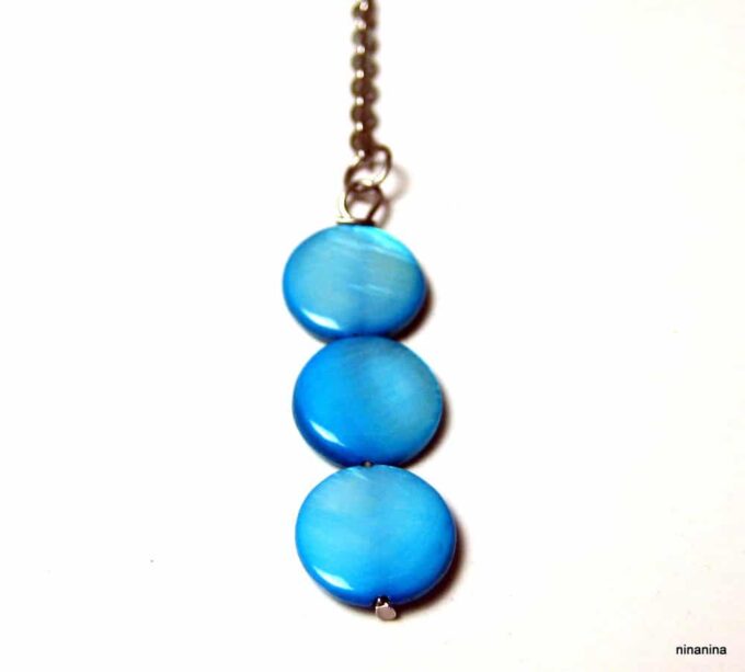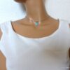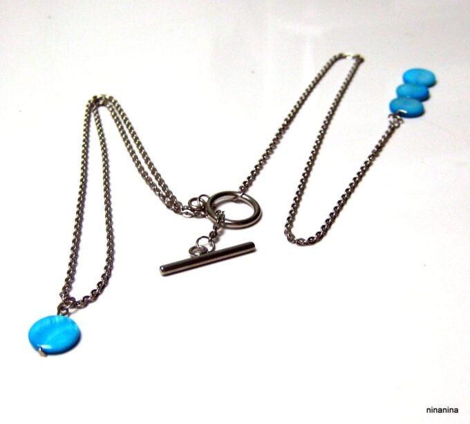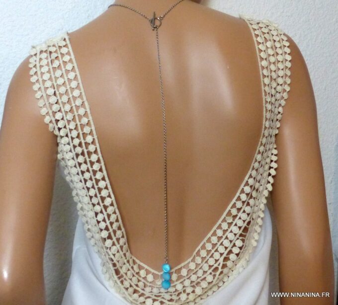 Collier de dos acier inoxydable nacre turquoise composé de palets ronds en nacre blanche montés sur une fine chainette en acier inoxydable.