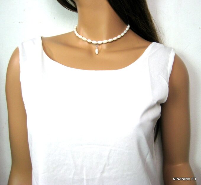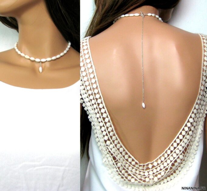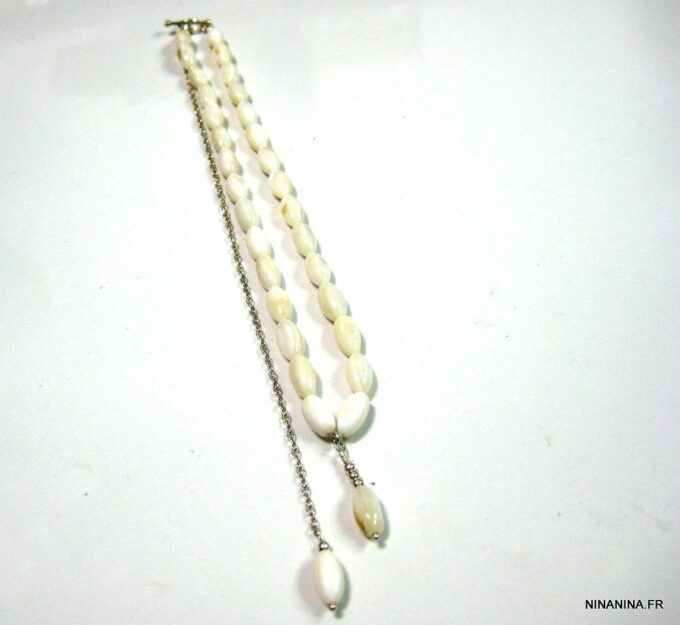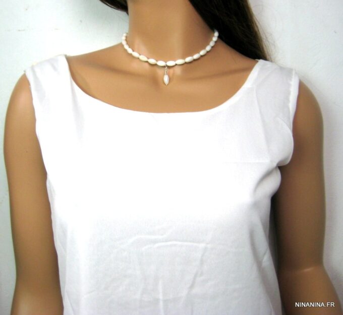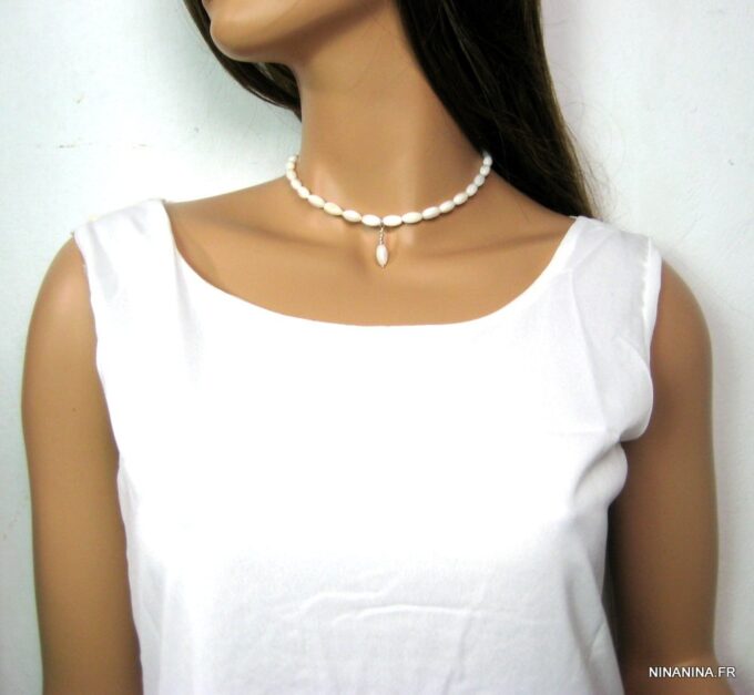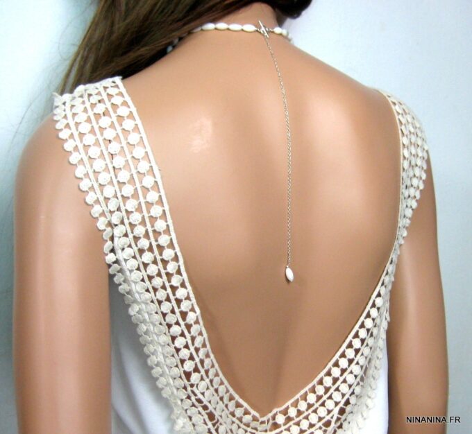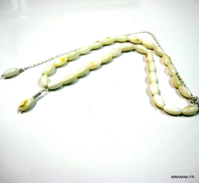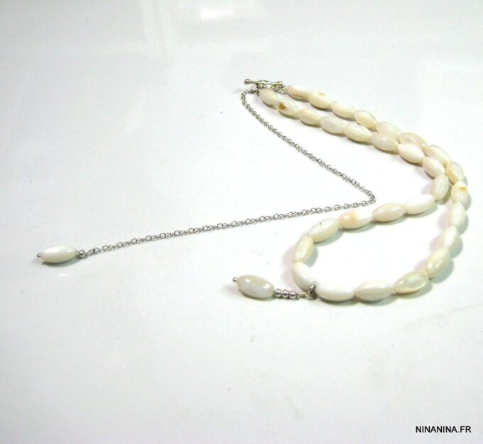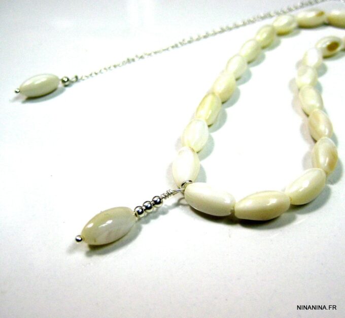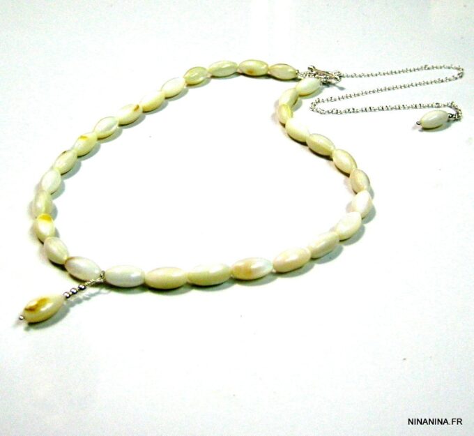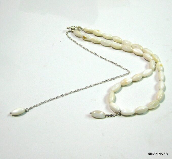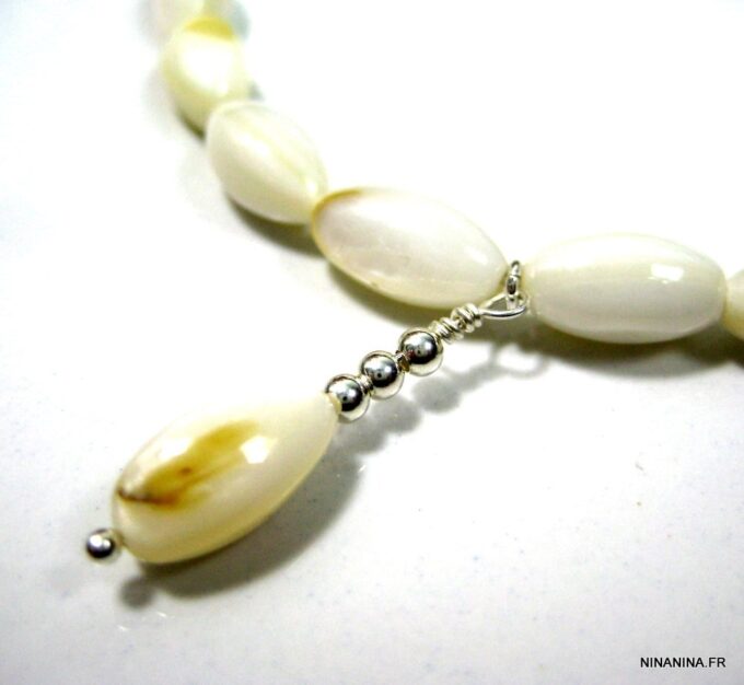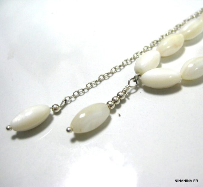 Collier de dos Nacre blanche Et Argent 925 massif composé de perles ovales en nacre blanche et de petites perles rondes (2,5 mm) en argent 925 montés sur chainette en argent 925.