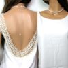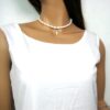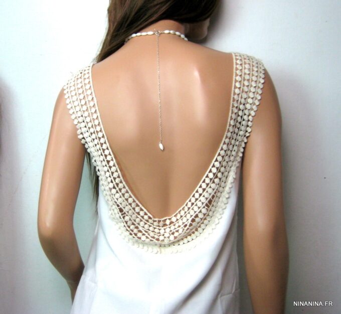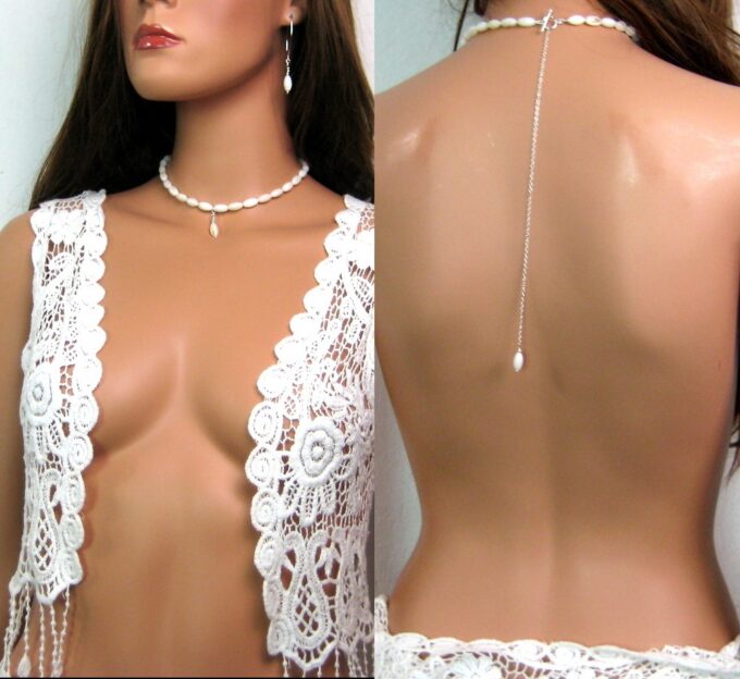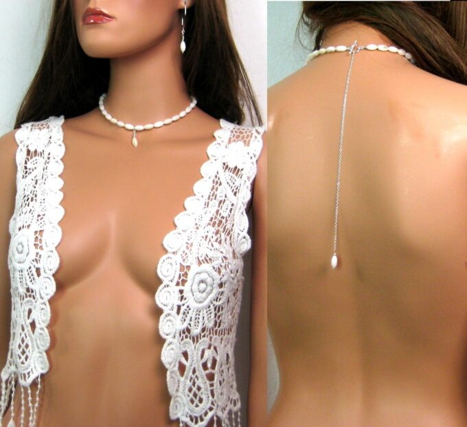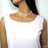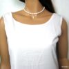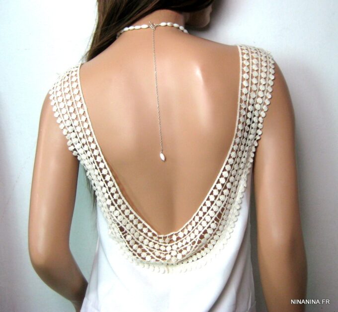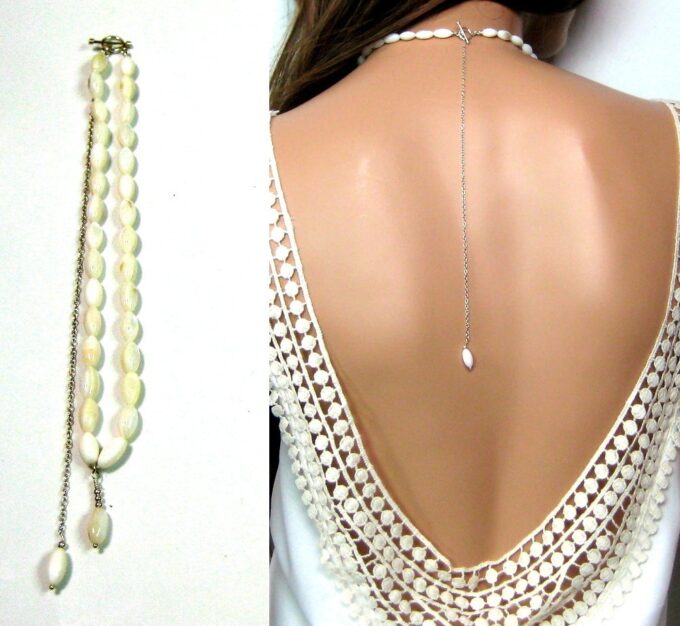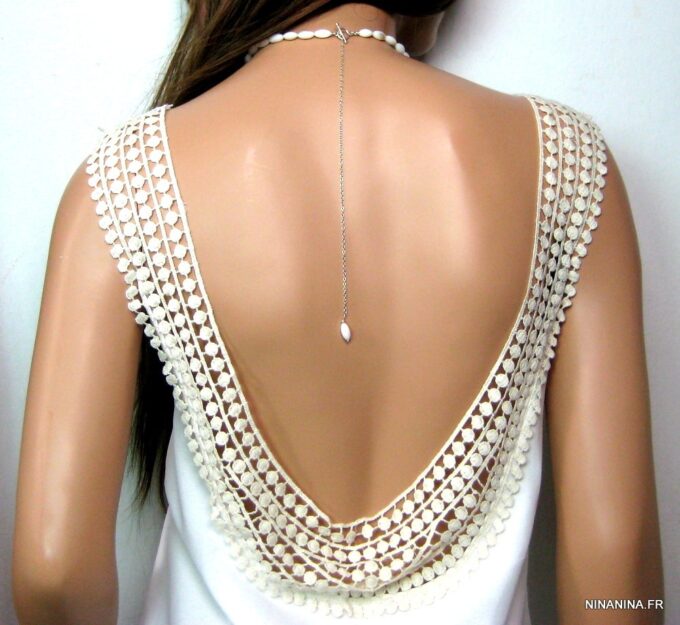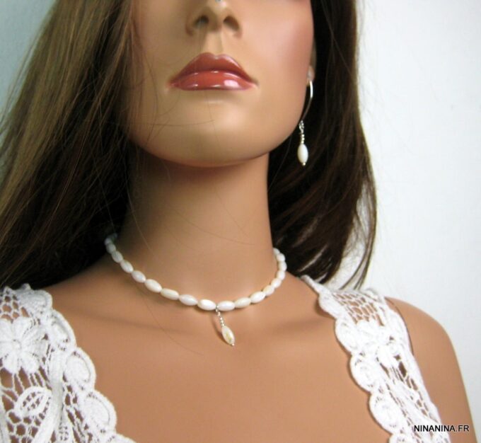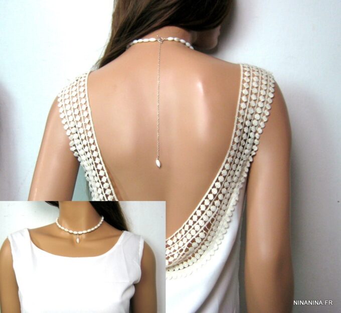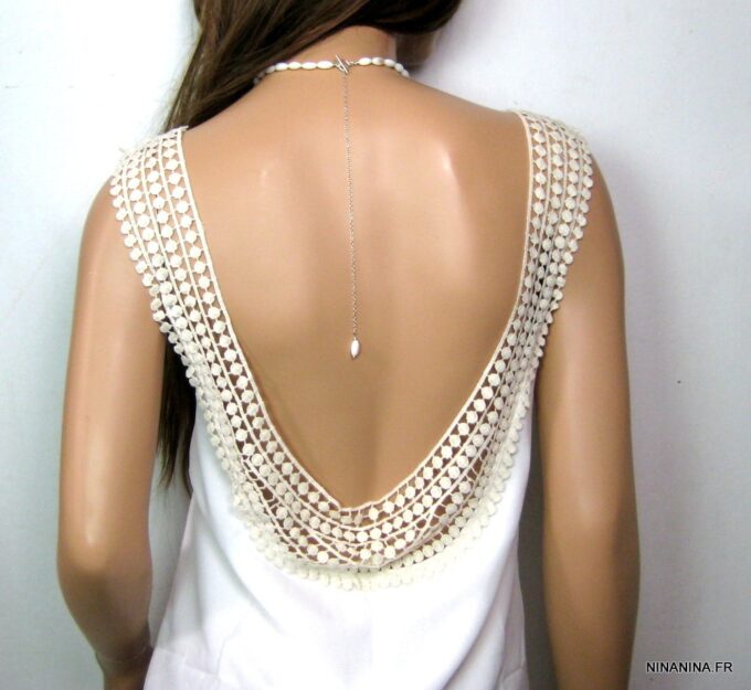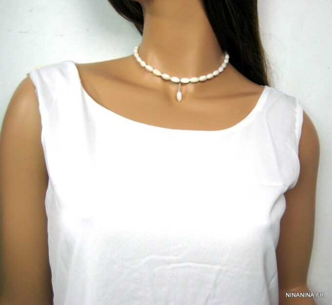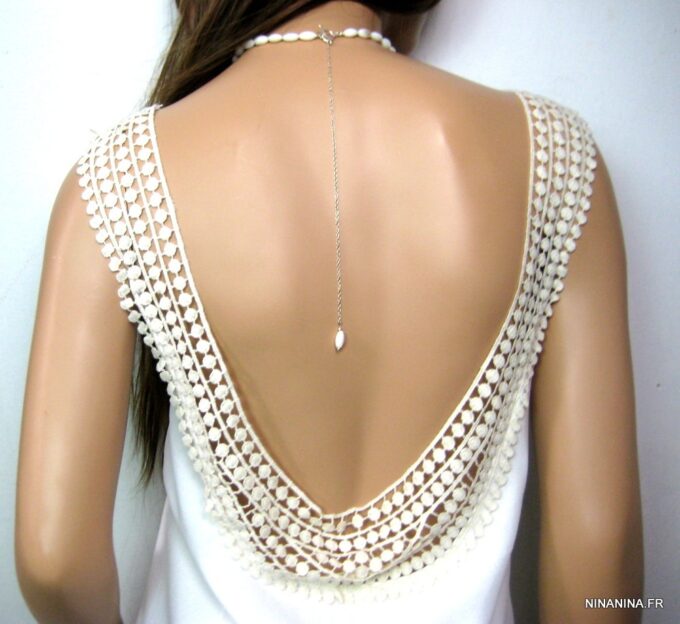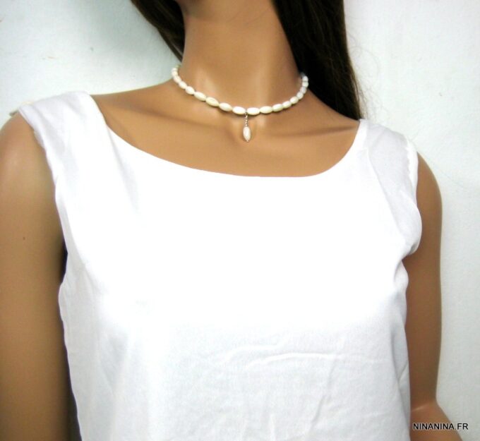 Collier de dos Nacre blanche Et Argent 925 massif composé de perles ovales en nacre blanche et de petites perles rondes (2,5 mm) en argent 925 montés sur chainette en argent 925.