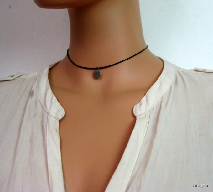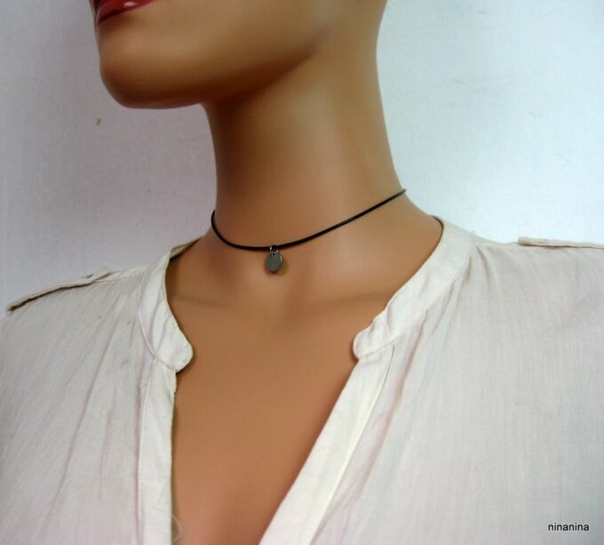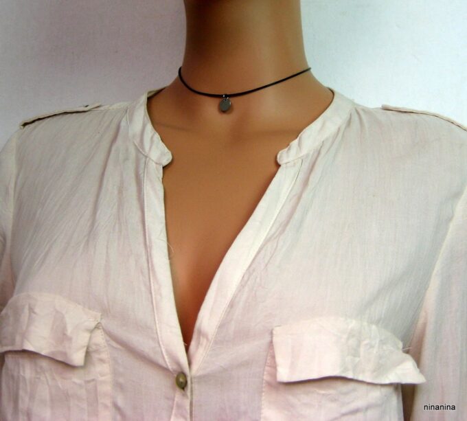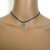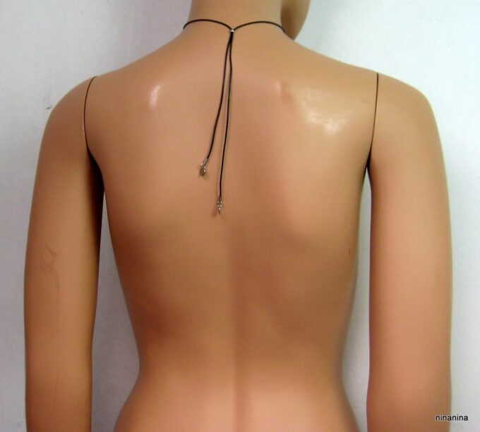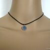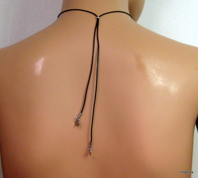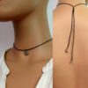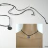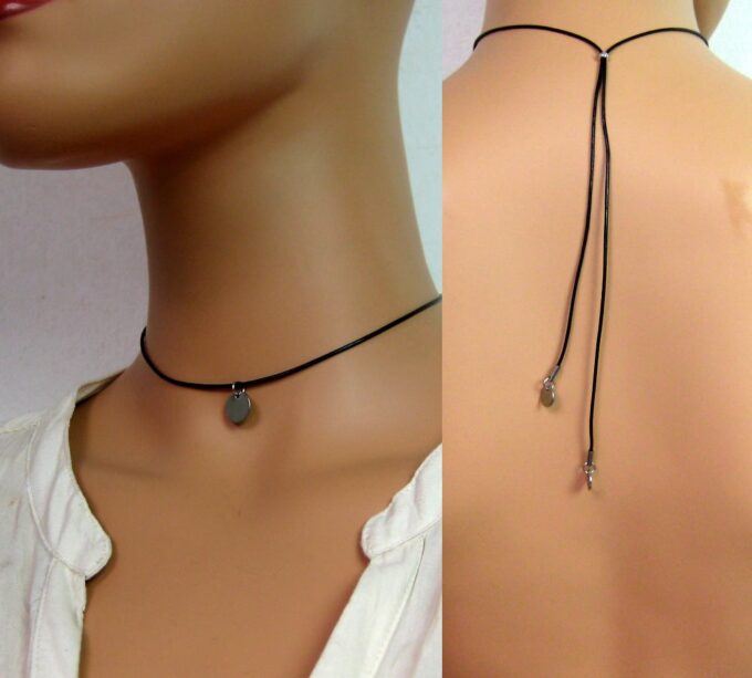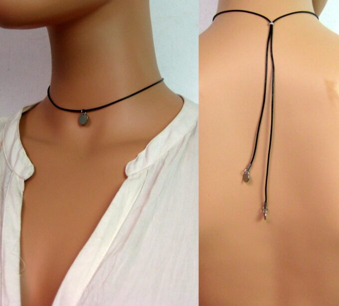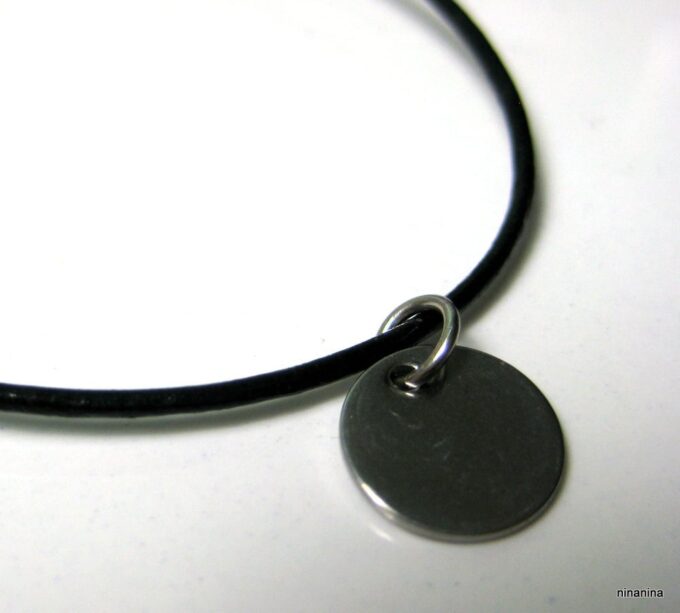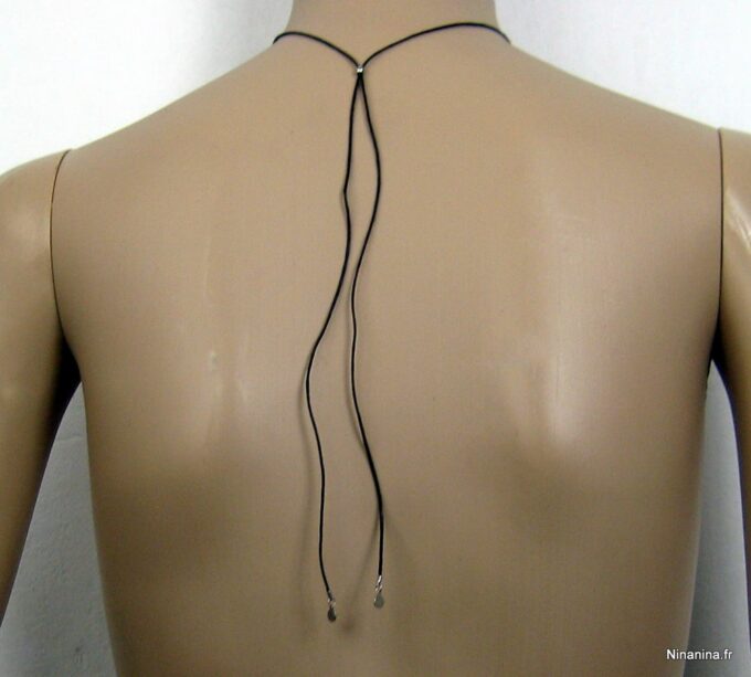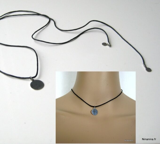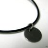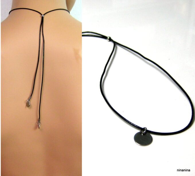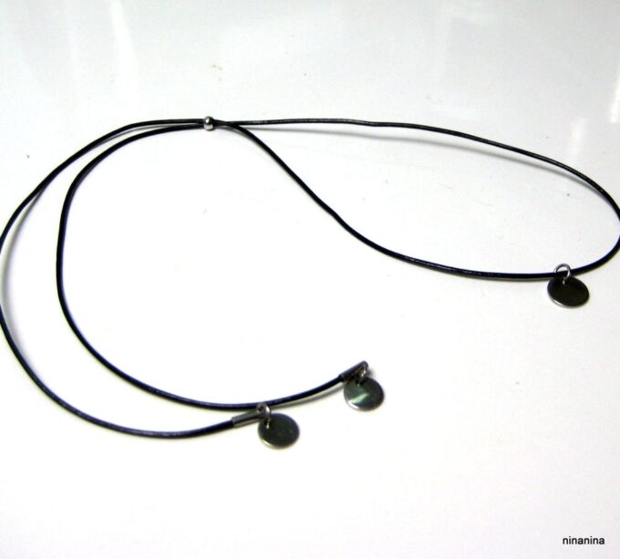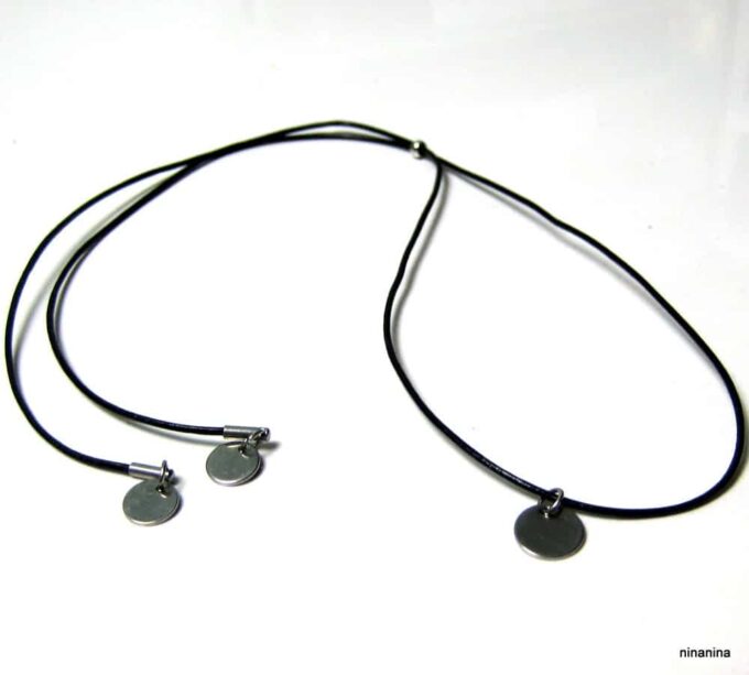 Collier de dos cordon cuir noir Acier inoxydable argent composé de pastilles rondes en acier inoxydable montées sur un cordon de coton ciré (1mm).