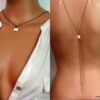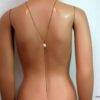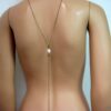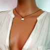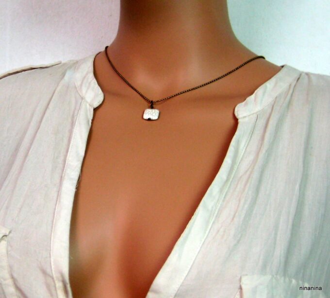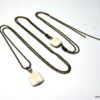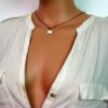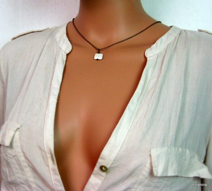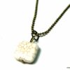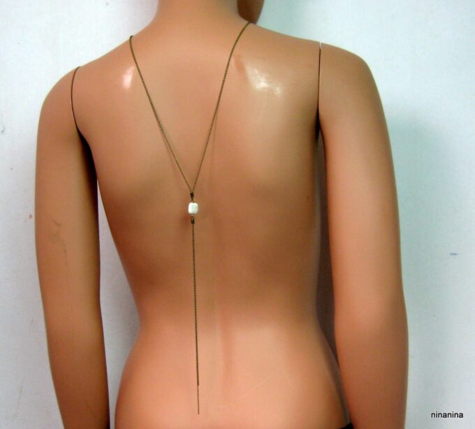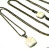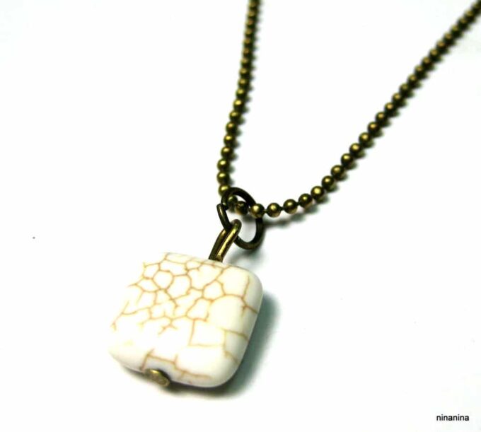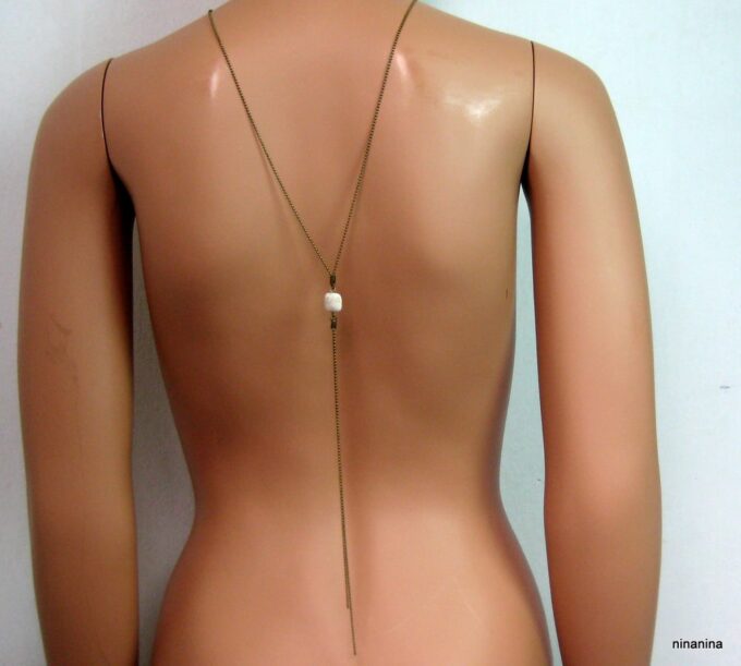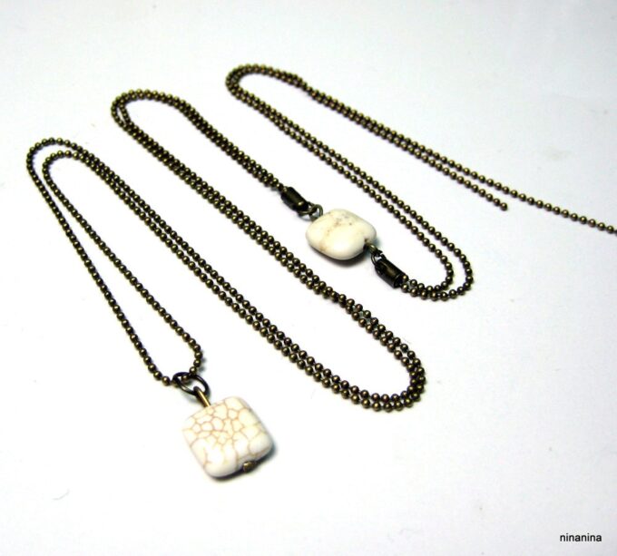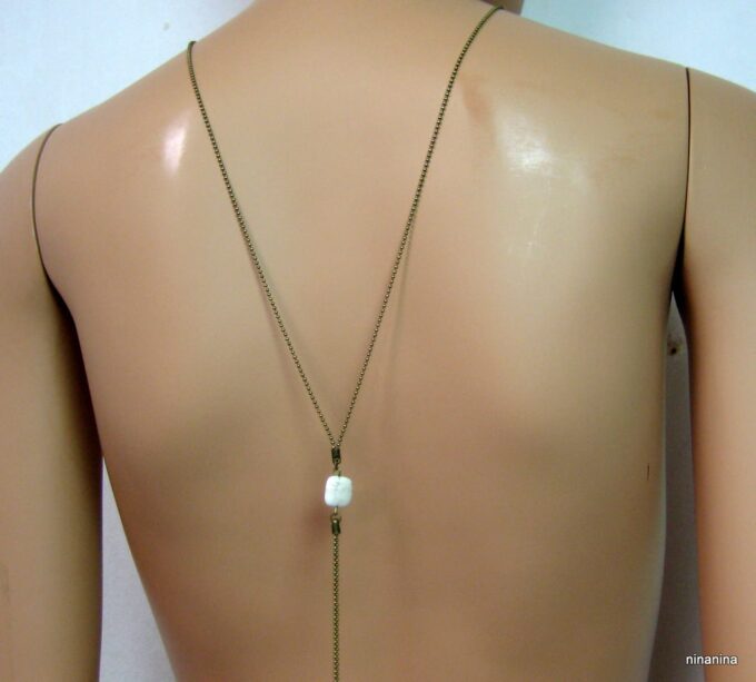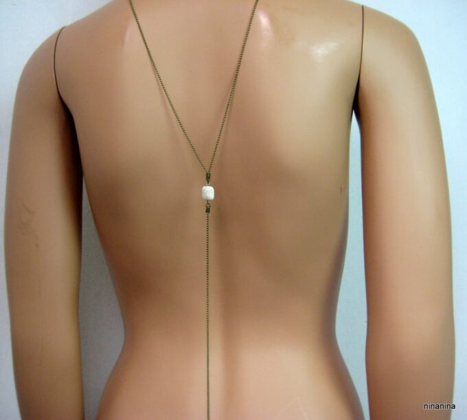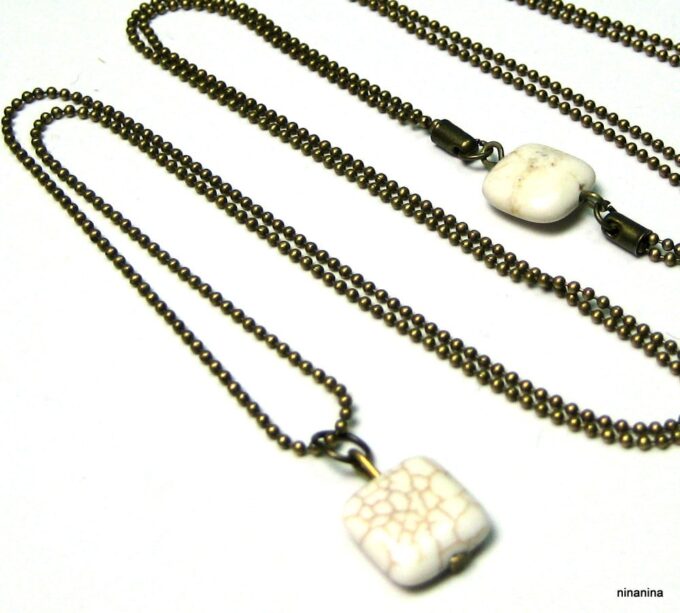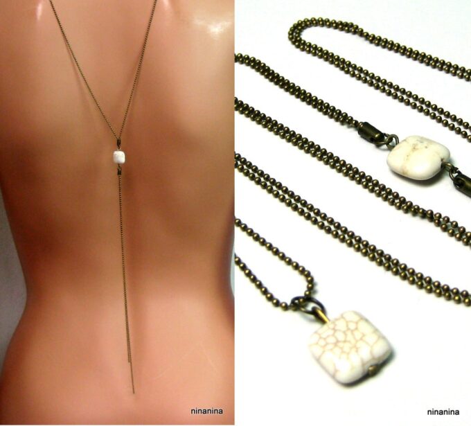 Collier de dos métal bronze composé de 2 entretoises carrées en magnésite blanche montées sur chainette boule en métal bronze. Dim de l’entretoise : 1,2 X 1,2 cm. Longueur du collier: 70 cm environ. Longueur du pendant : 21 cm environ. Livré dans sa pochette d’organza. Bijou 100% fait-main